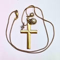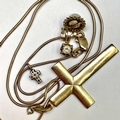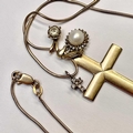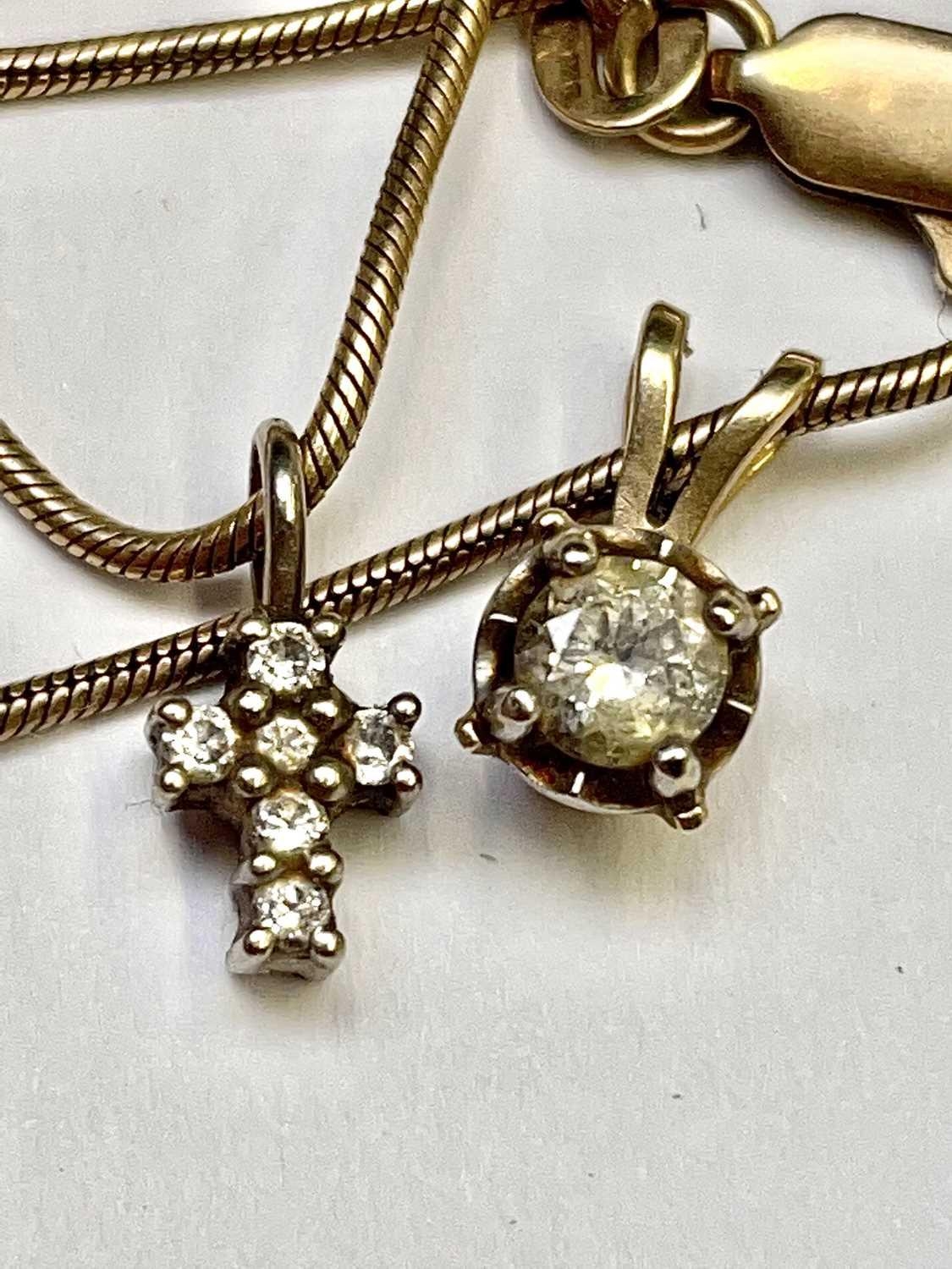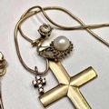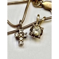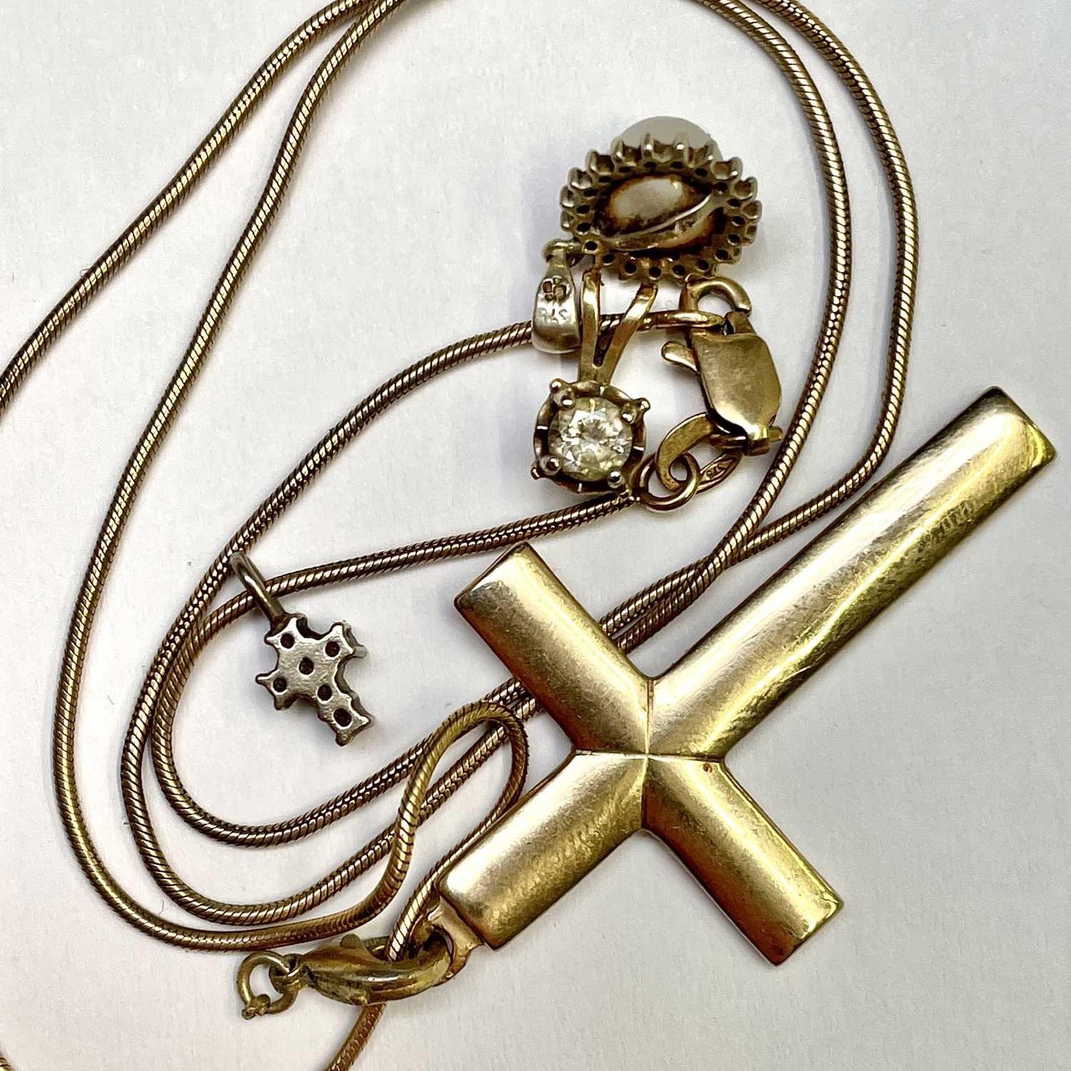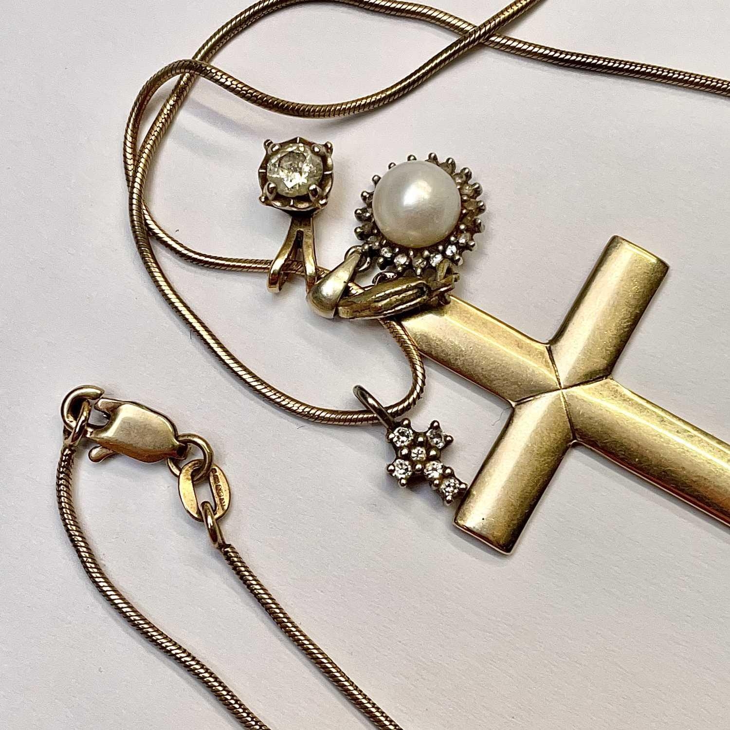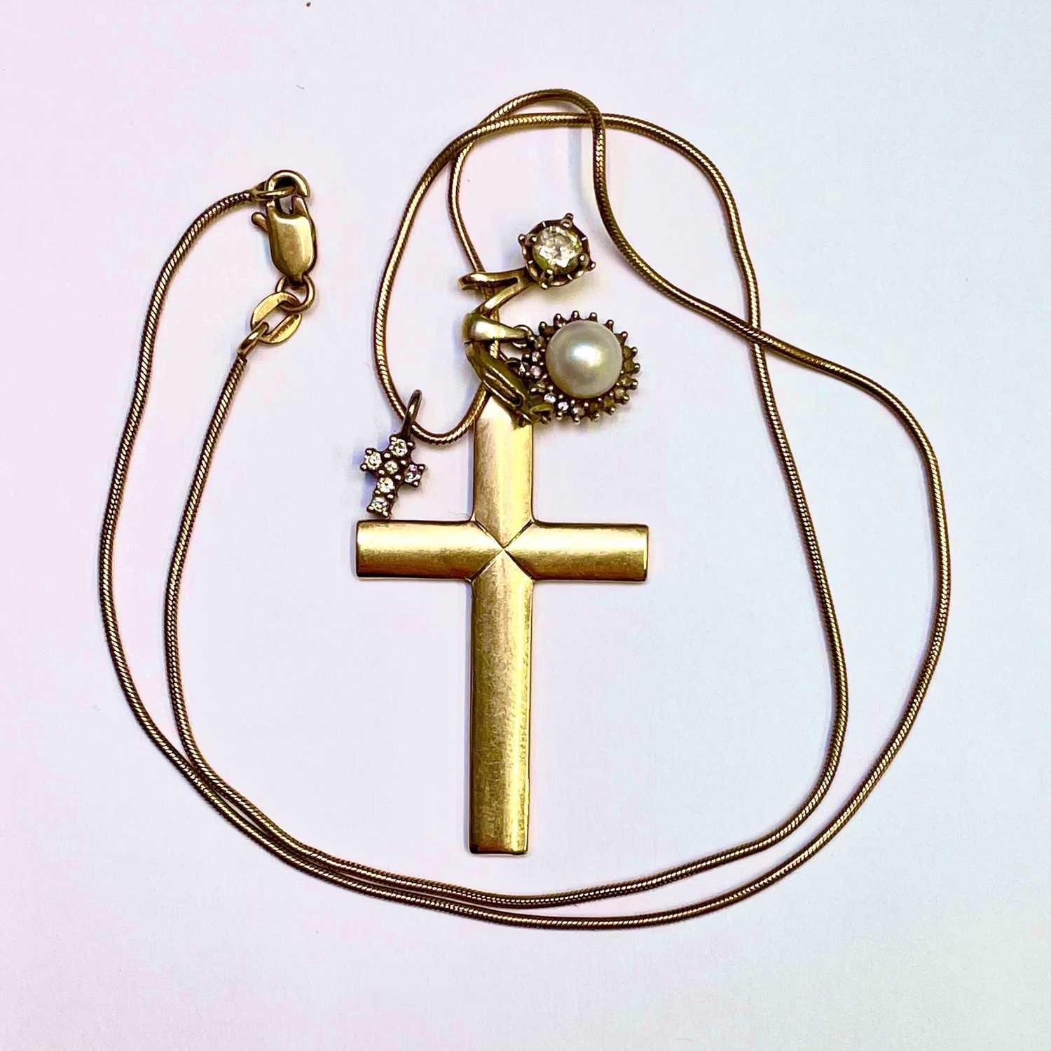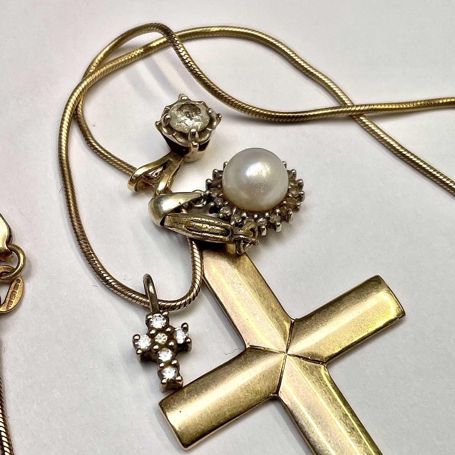 A diamond set pendant, 0.20ct, together with a diamond set small cross pendant, a diamond and pearl pendant and a 9ct cross pendant, all on a 9ct snake link chain, weight 12.4g. From the Estate of Julia & Sven Berlin