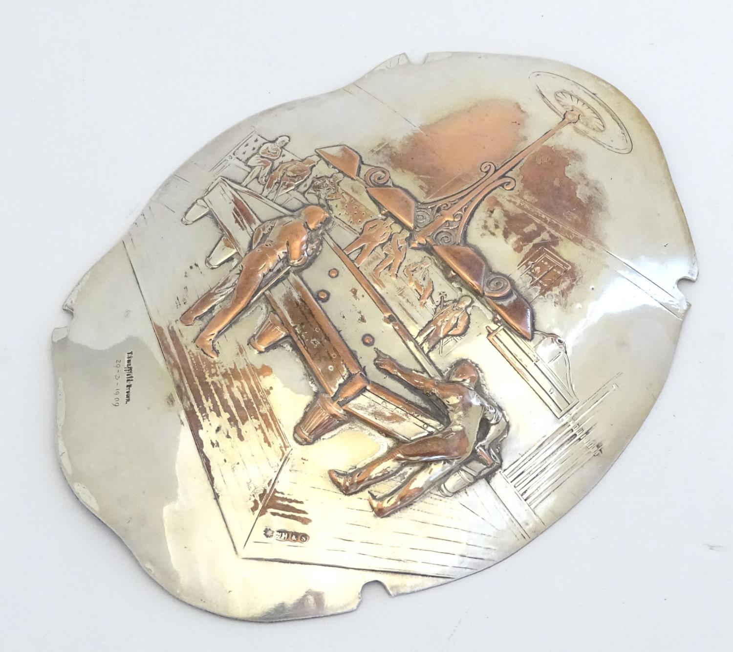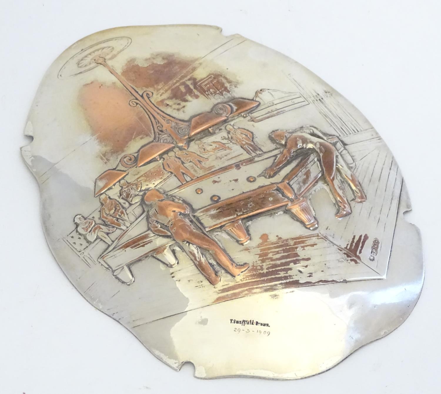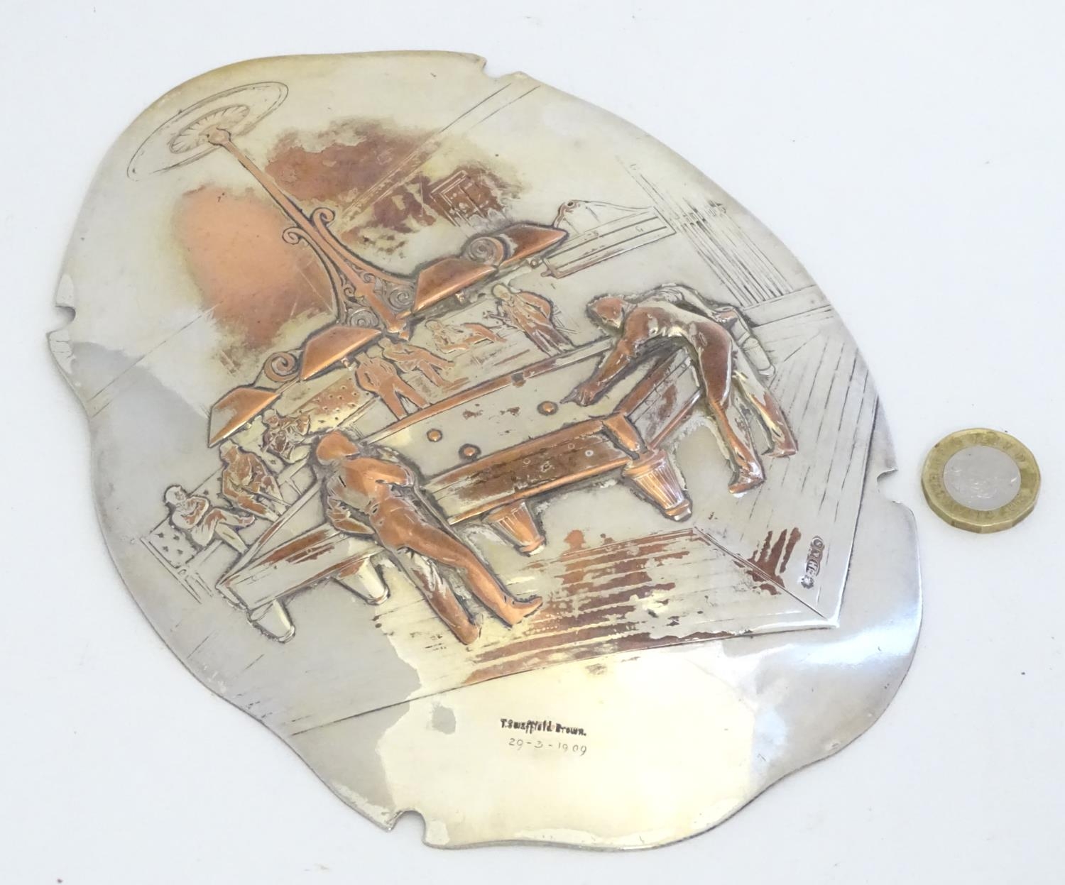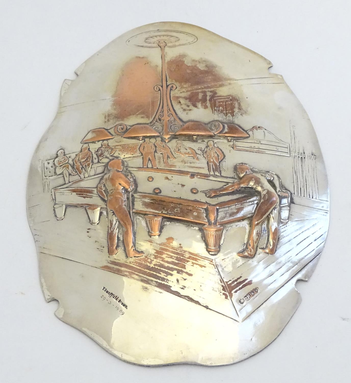 Billiards / snooker interest : An oval convex silver plate panel decorated with scene depicting a game of billiards. by T Swaffield Brown and dated 29-3-1909. Approx. 8" high