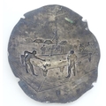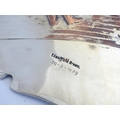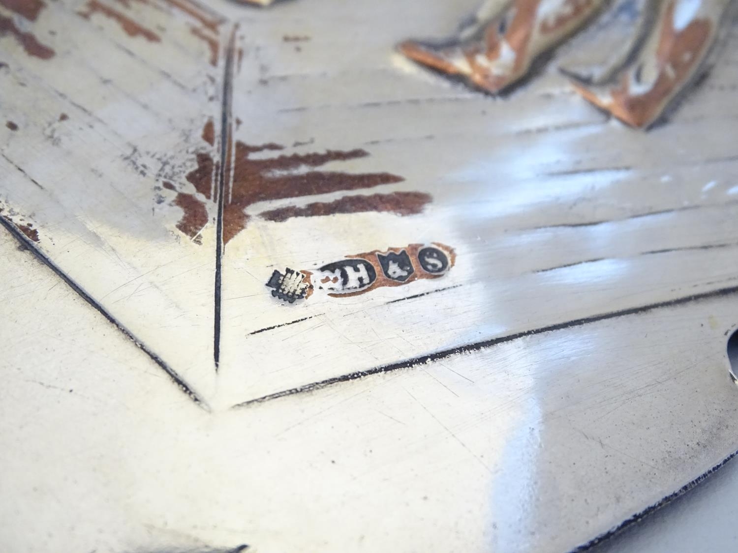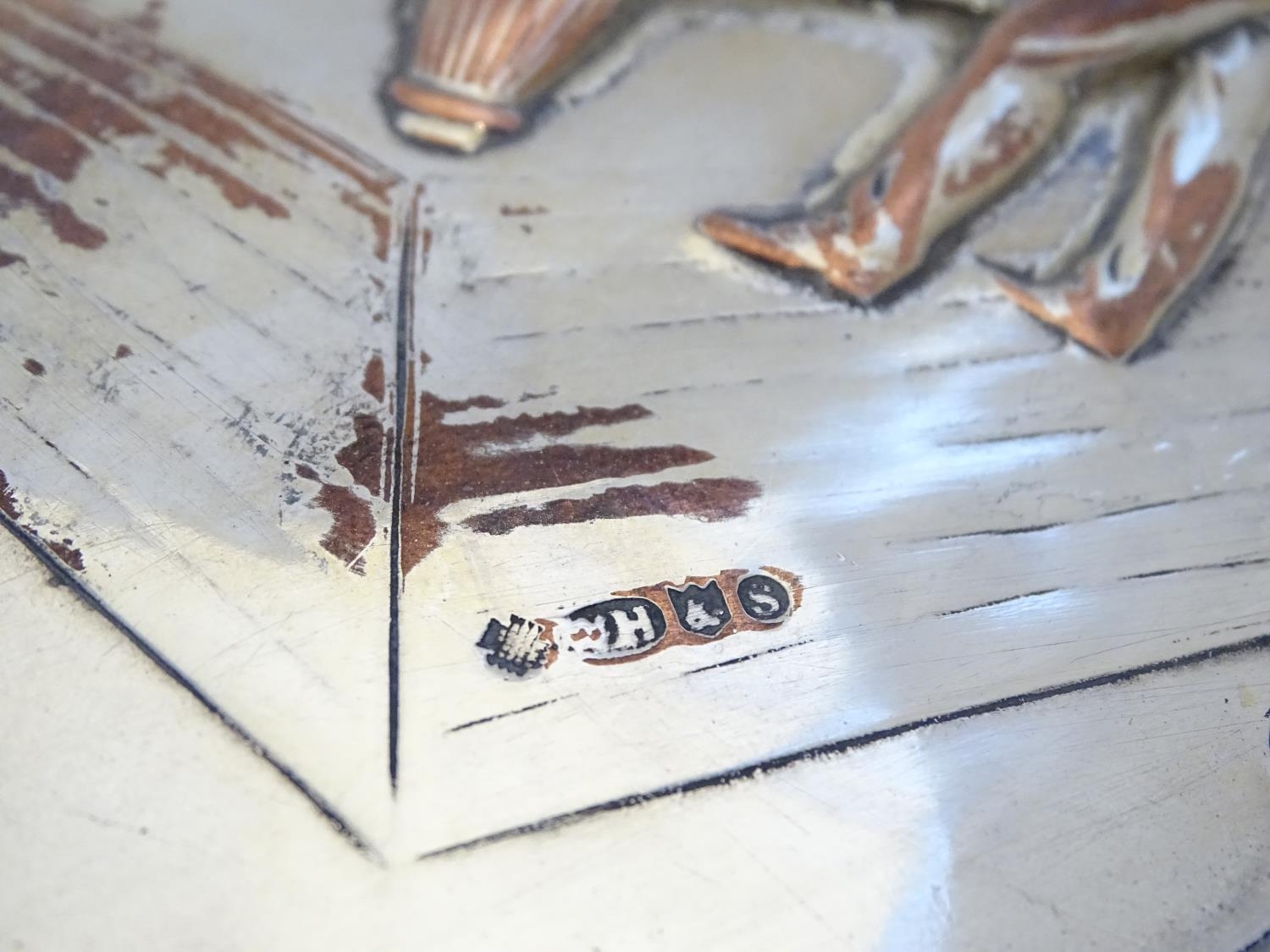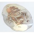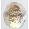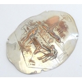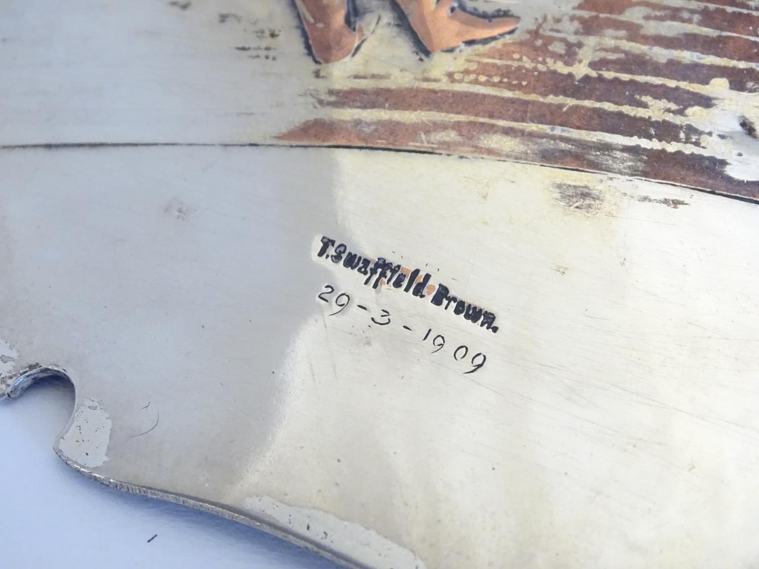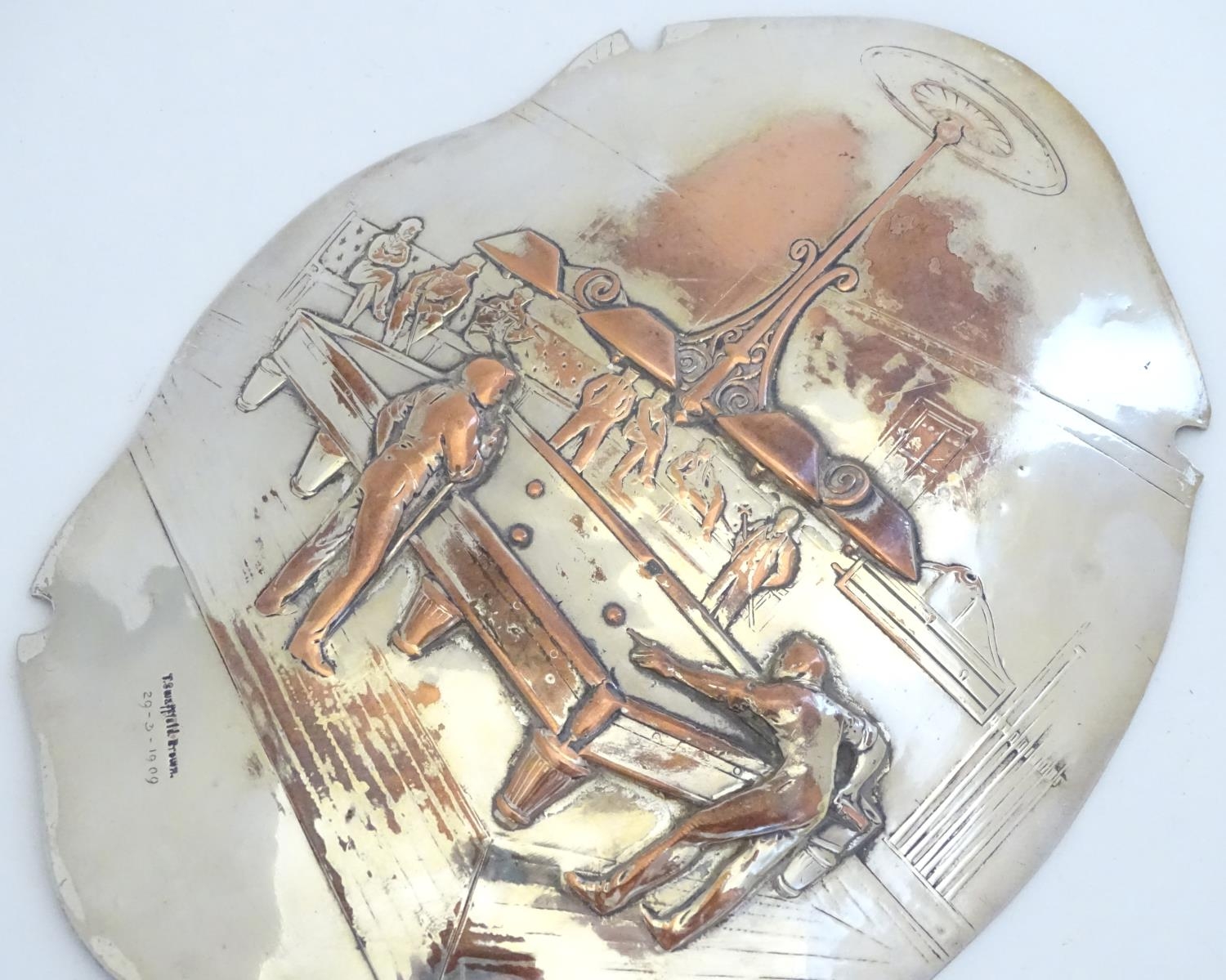 Billiards / snooker interest : An oval convex silver plate panel decorated with scene depicting a game of billiards. by T Swaffield Brown and dated 29-3-1909. Approx. 8" high
