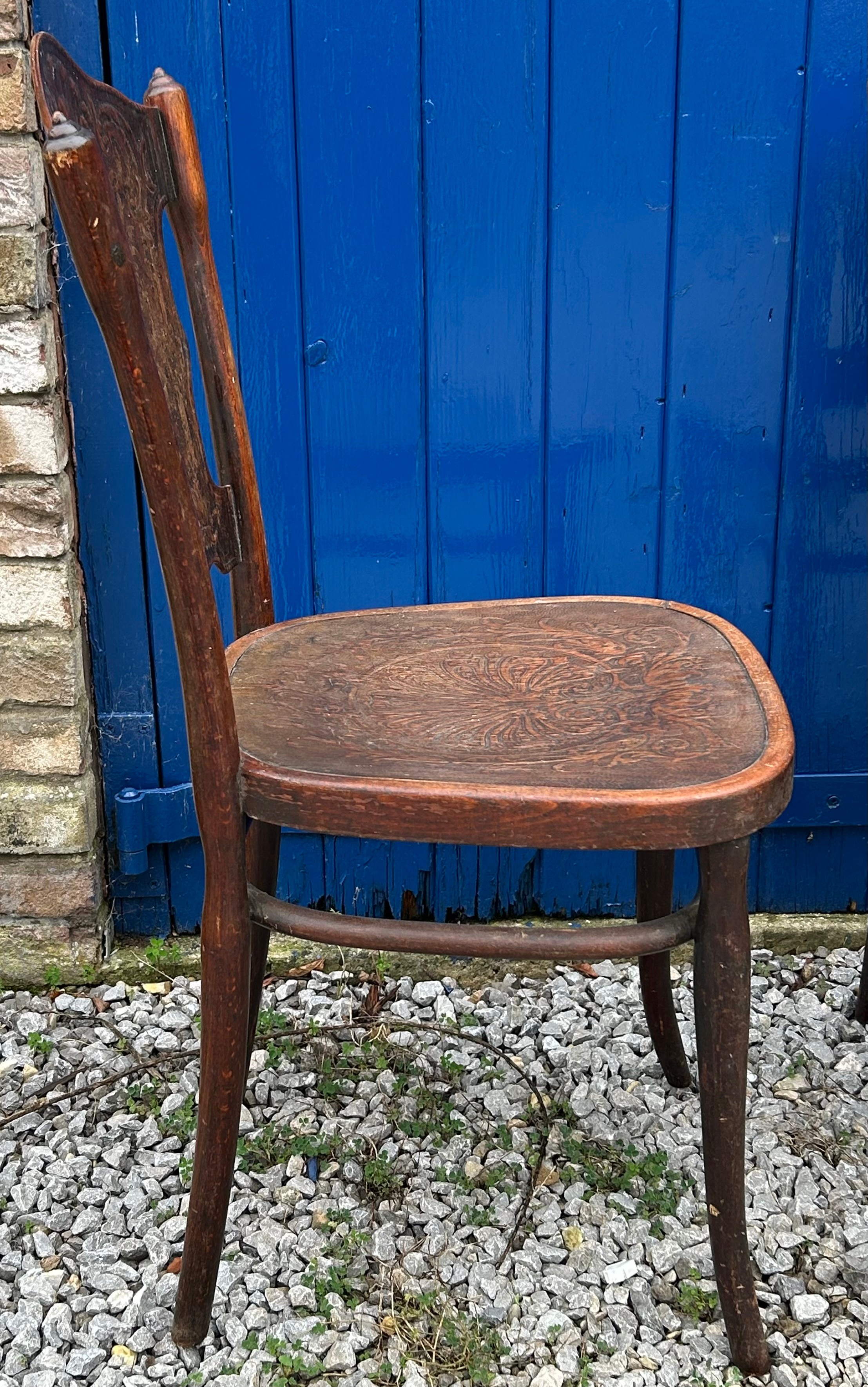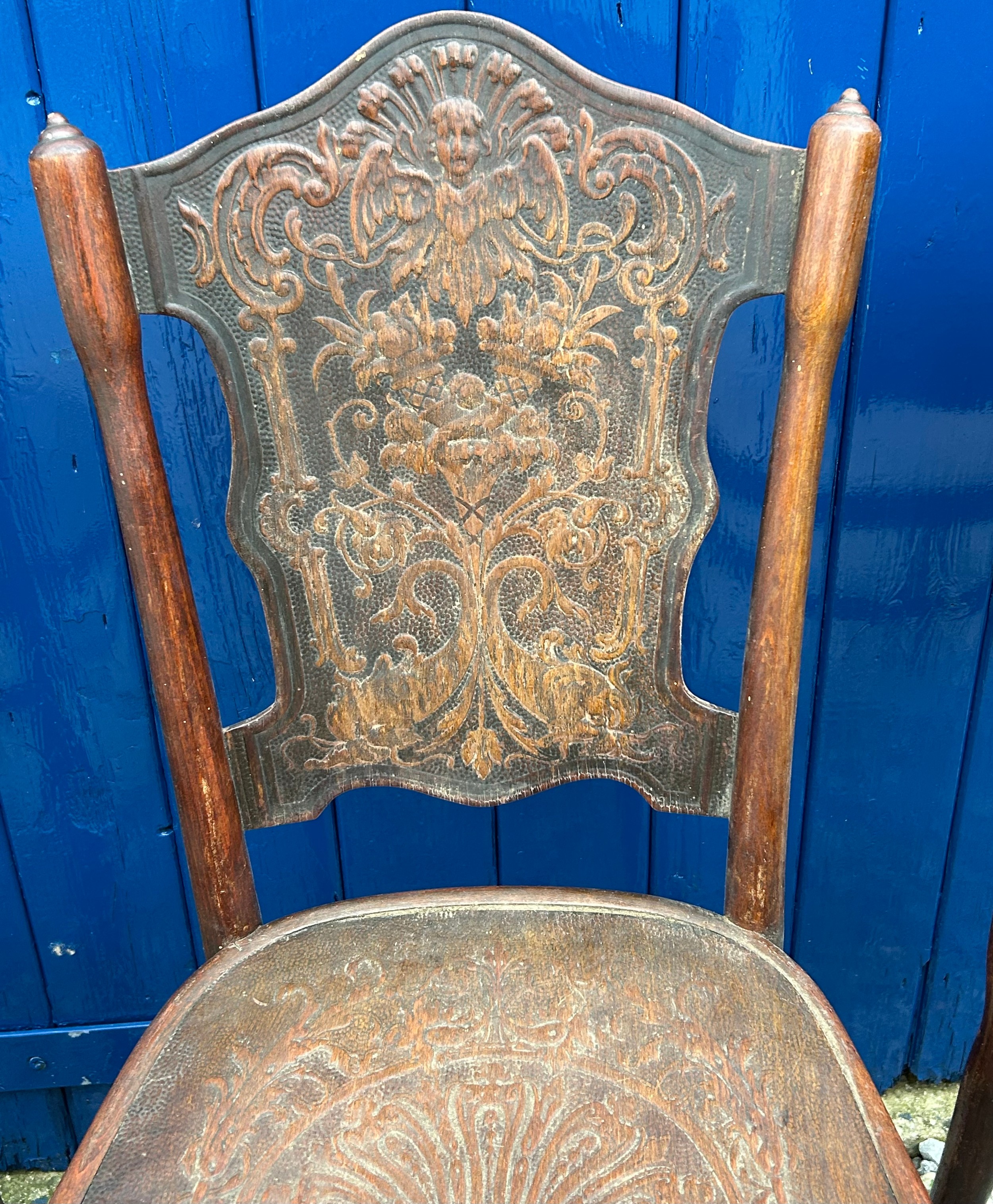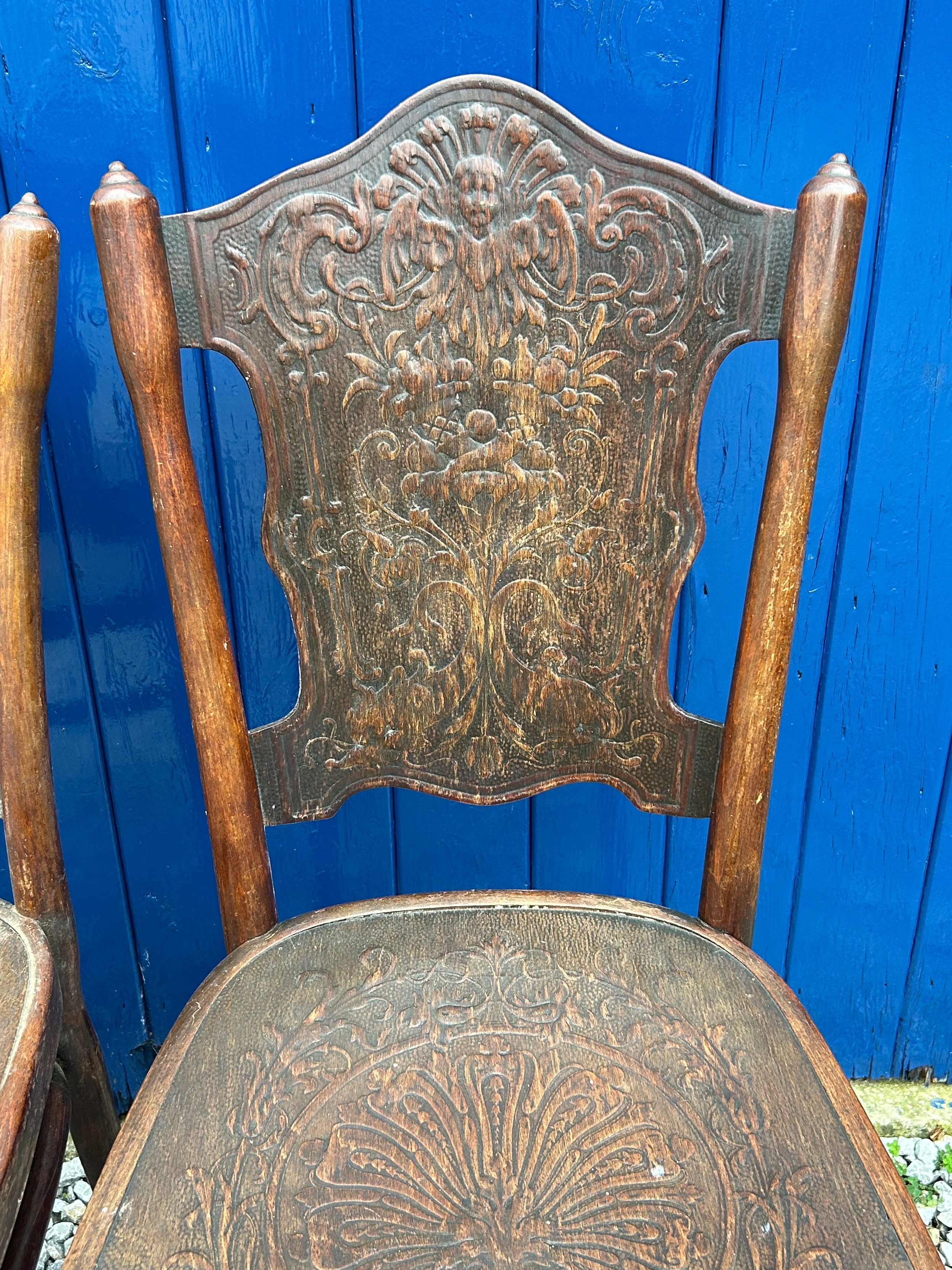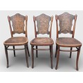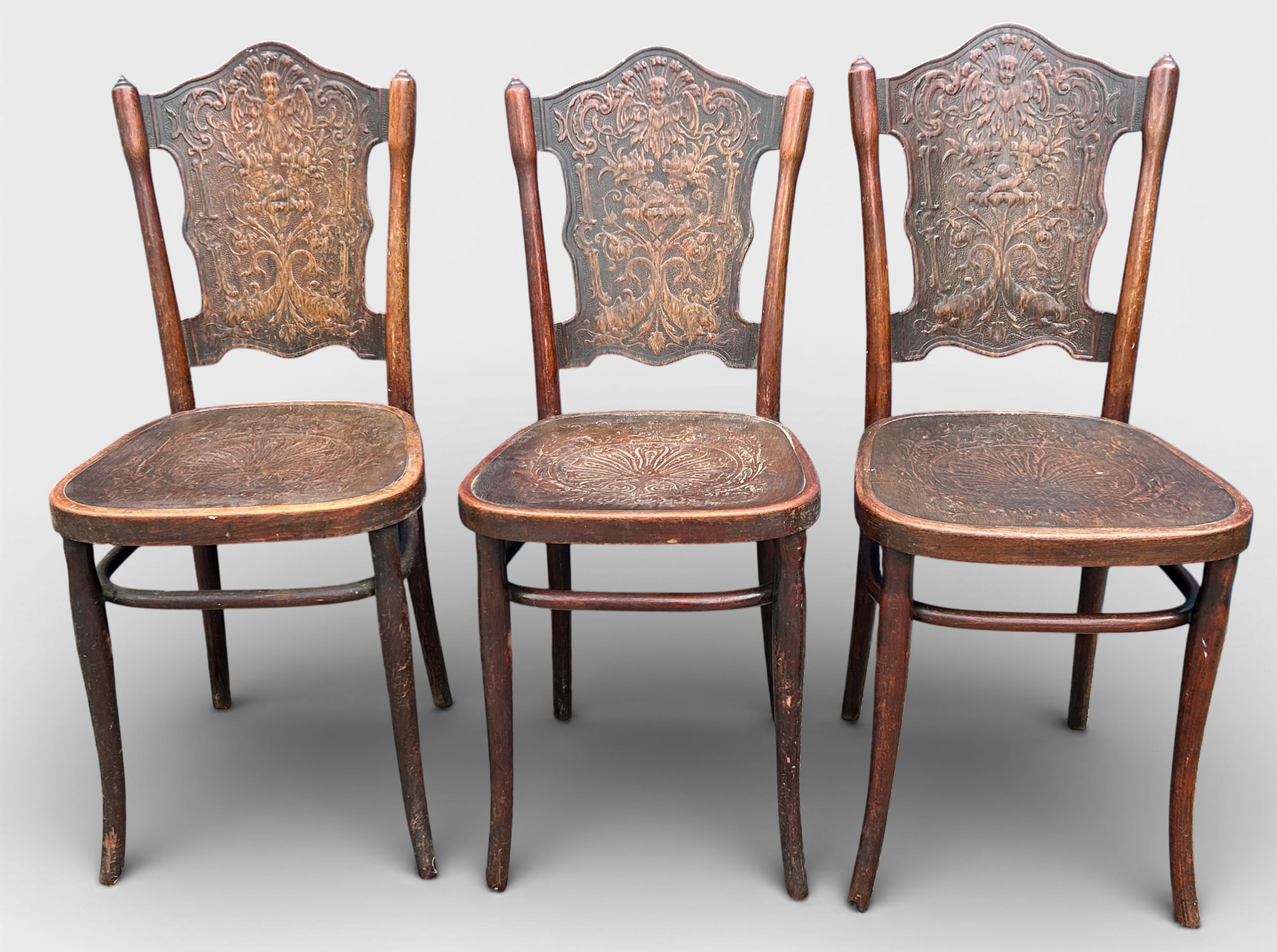 A set of three early 20thC Jacob and Josef Kohn of Vienna, Austria Arts & Crafts bentwood bistro cafe chairs with embossed design of an angelic figure with foliage. Maker's mark to underside of one. 94cm h, 47.5cm to seat. 40cm at widest point.