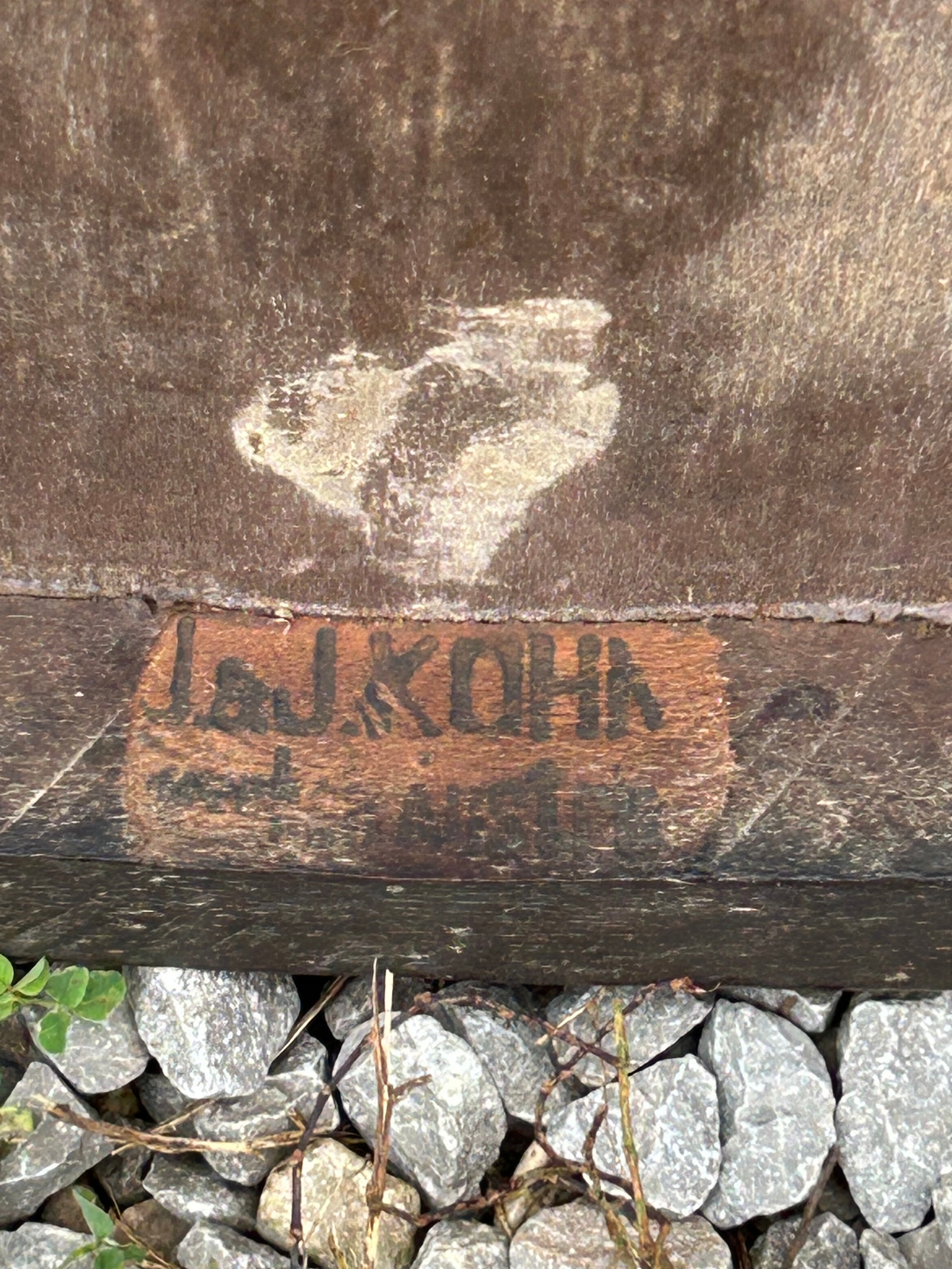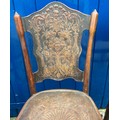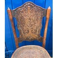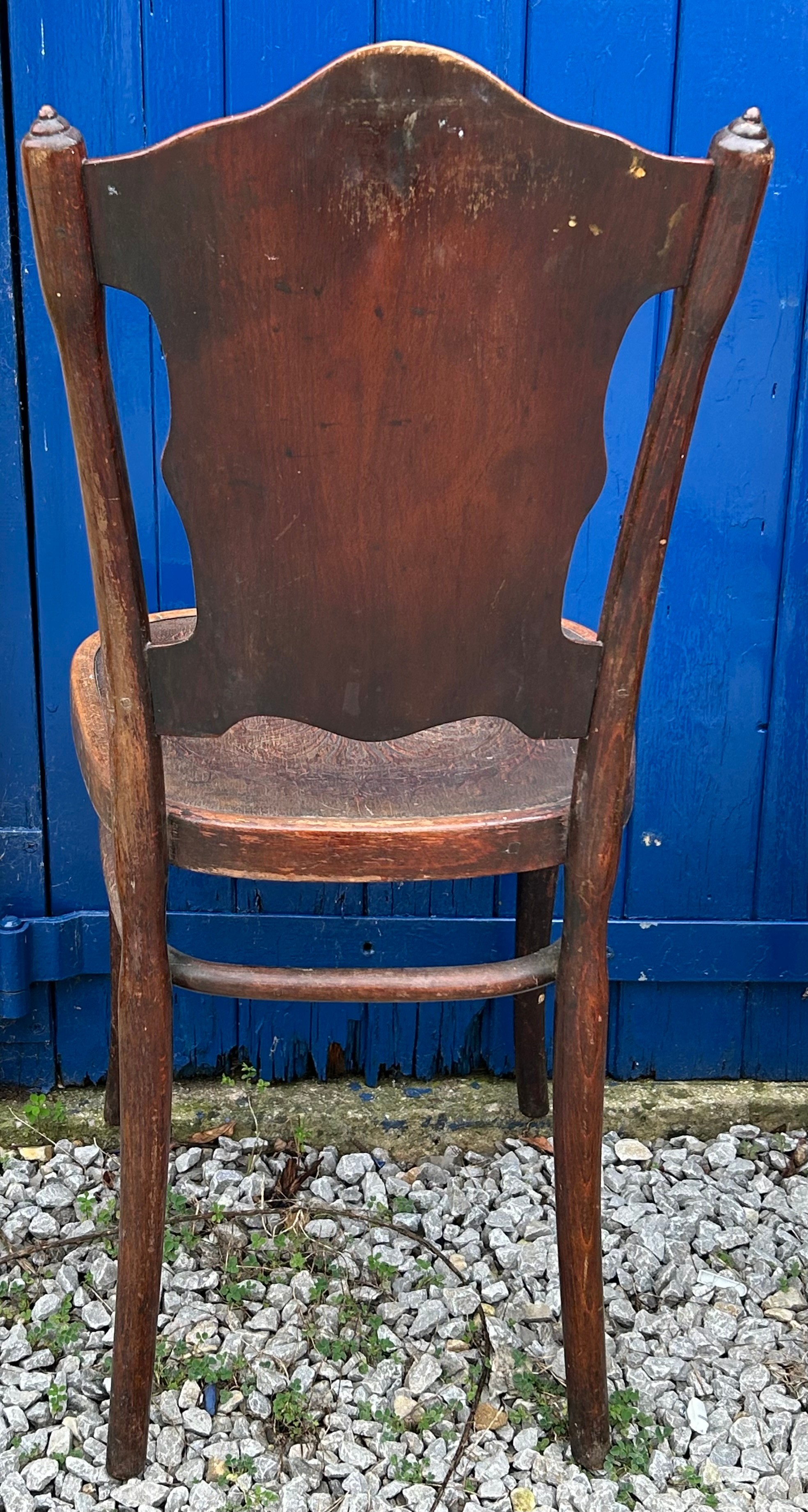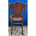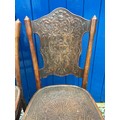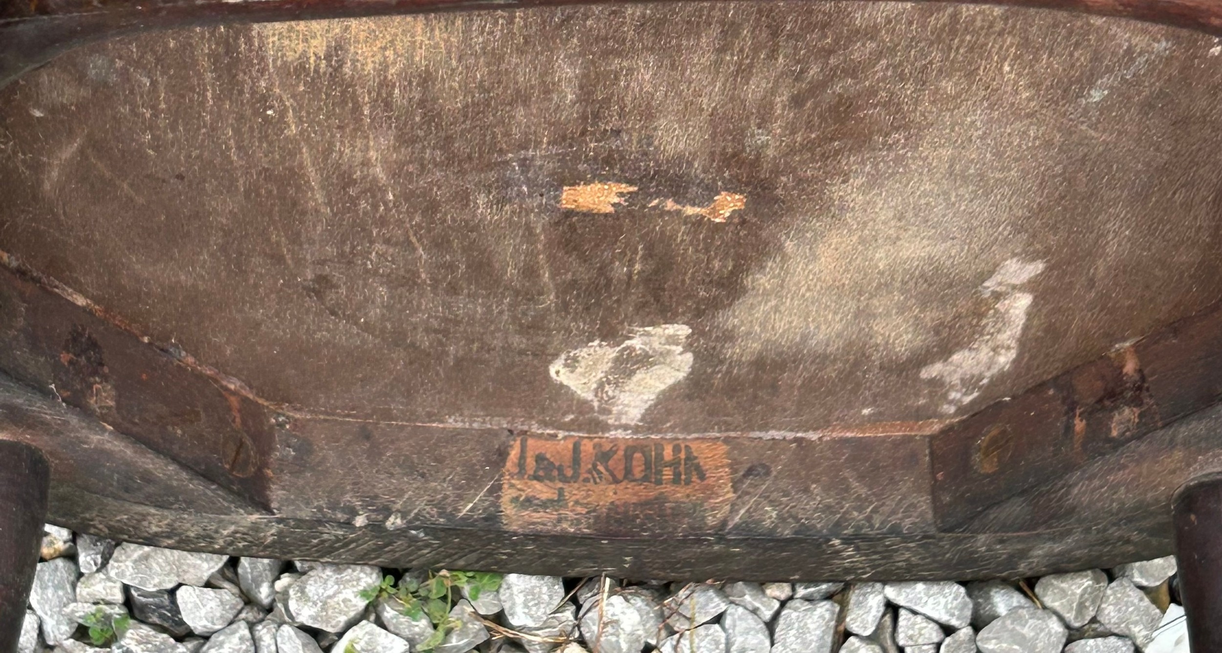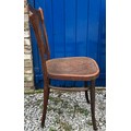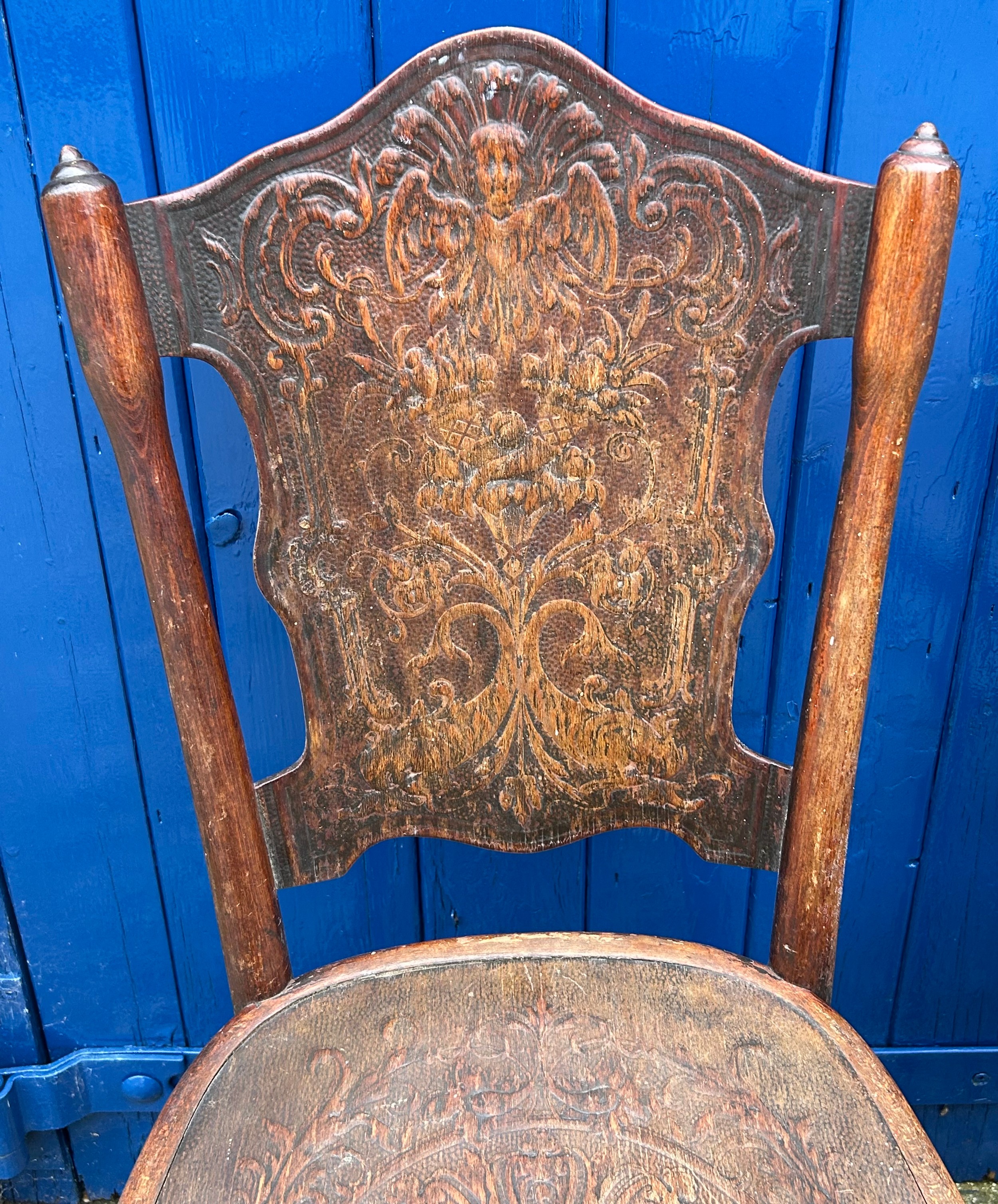 A set of three early 20thC Jacob and Josef Kohn of Vienna, Austria Arts & Crafts bentwood bistro cafe chairs with embossed design of an angelic figure with foliage. Maker's mark to underside of one. 94cm h, 47.5cm to seat. 40cm at widest point.