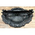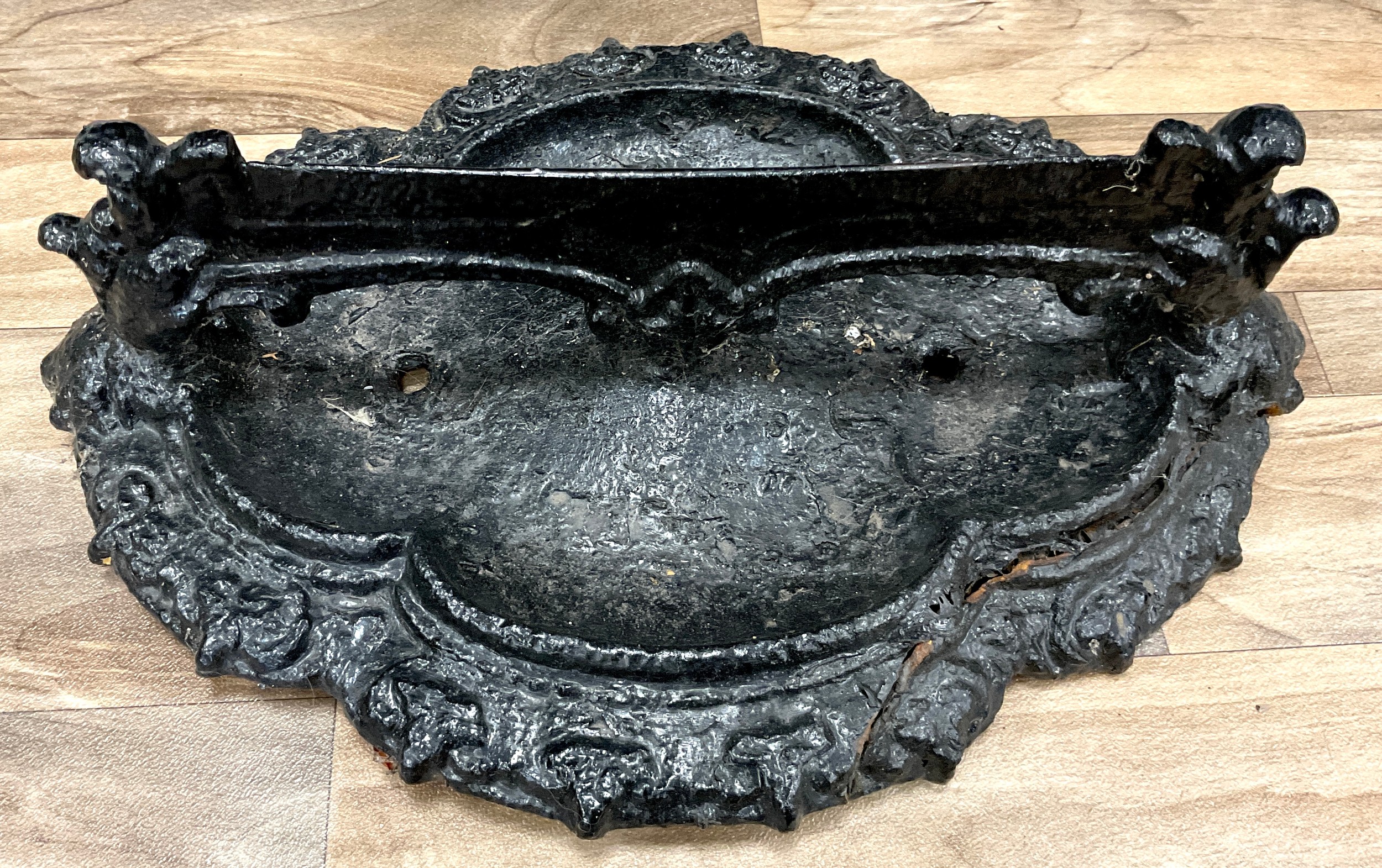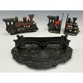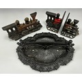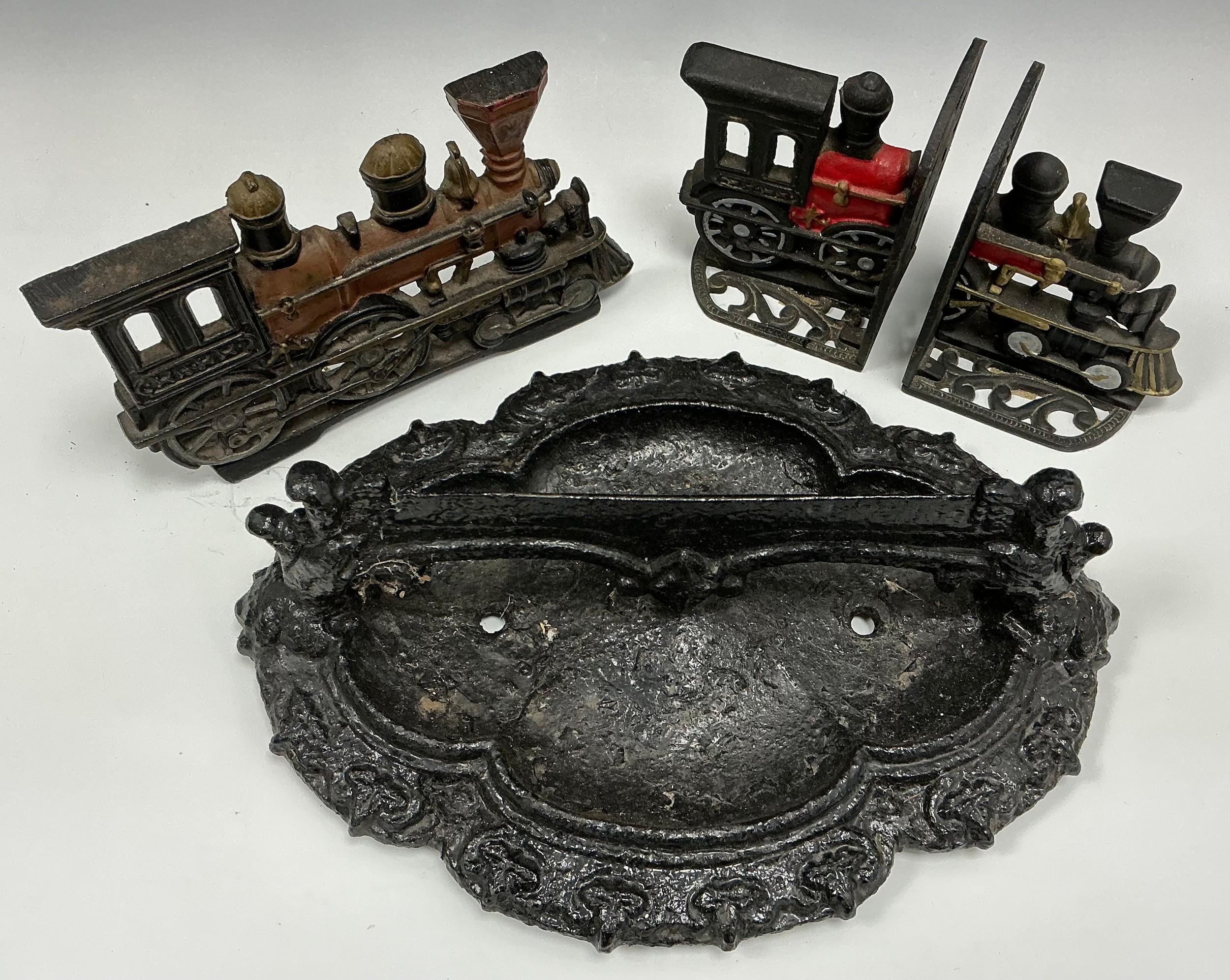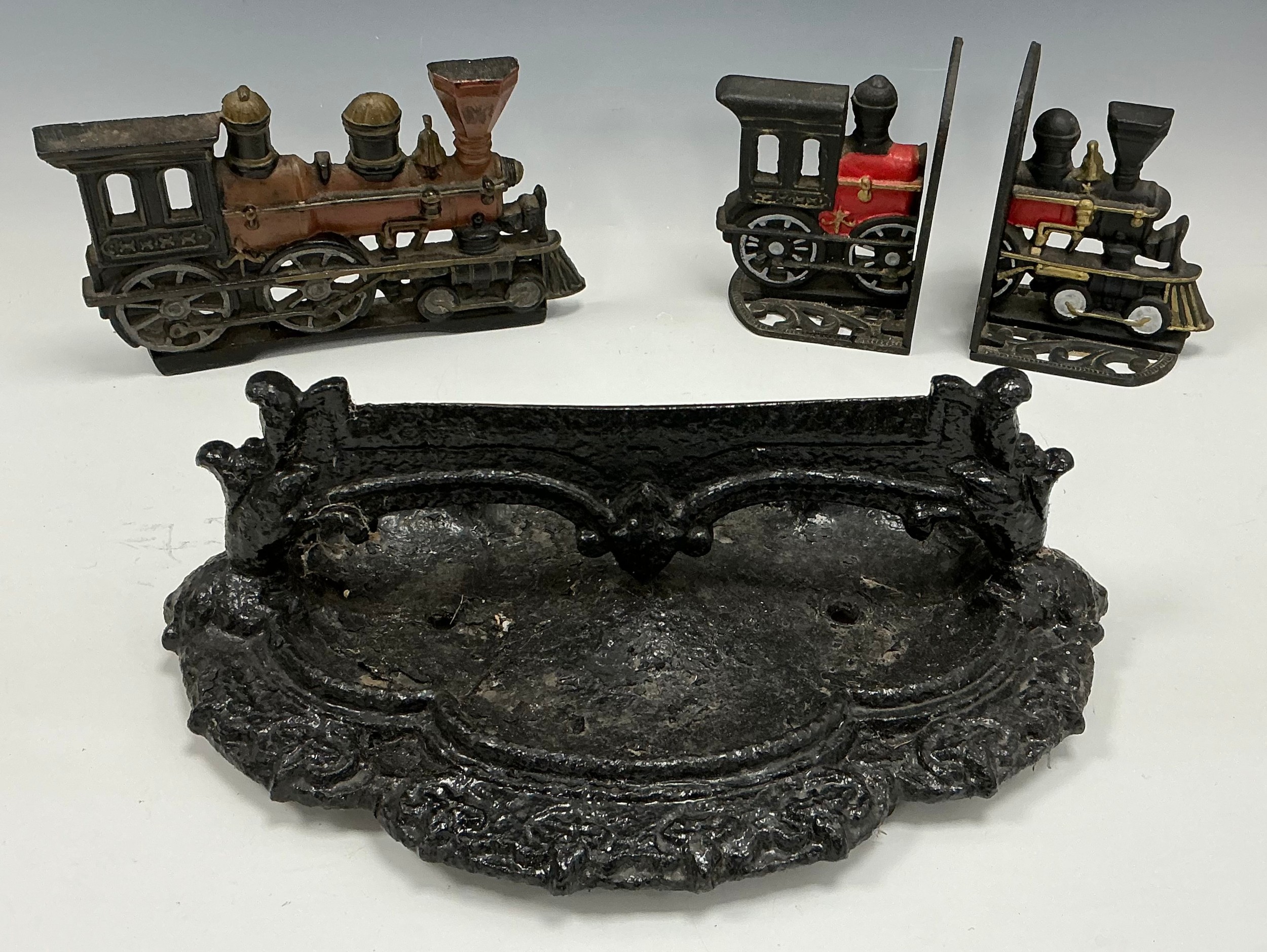 A 19th century cast iron boot scraper, razor bar top, scrolling quatrefoils base, 13cm high, 39cm wide, 27cm deep; and a cast iron door-stop in the form of a steam engine, and conforming book ends, (3).