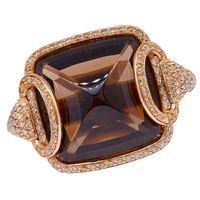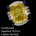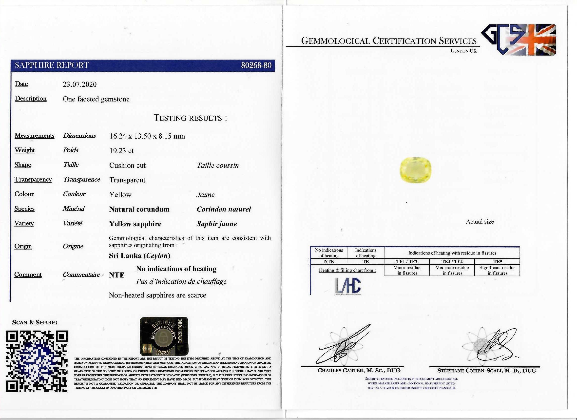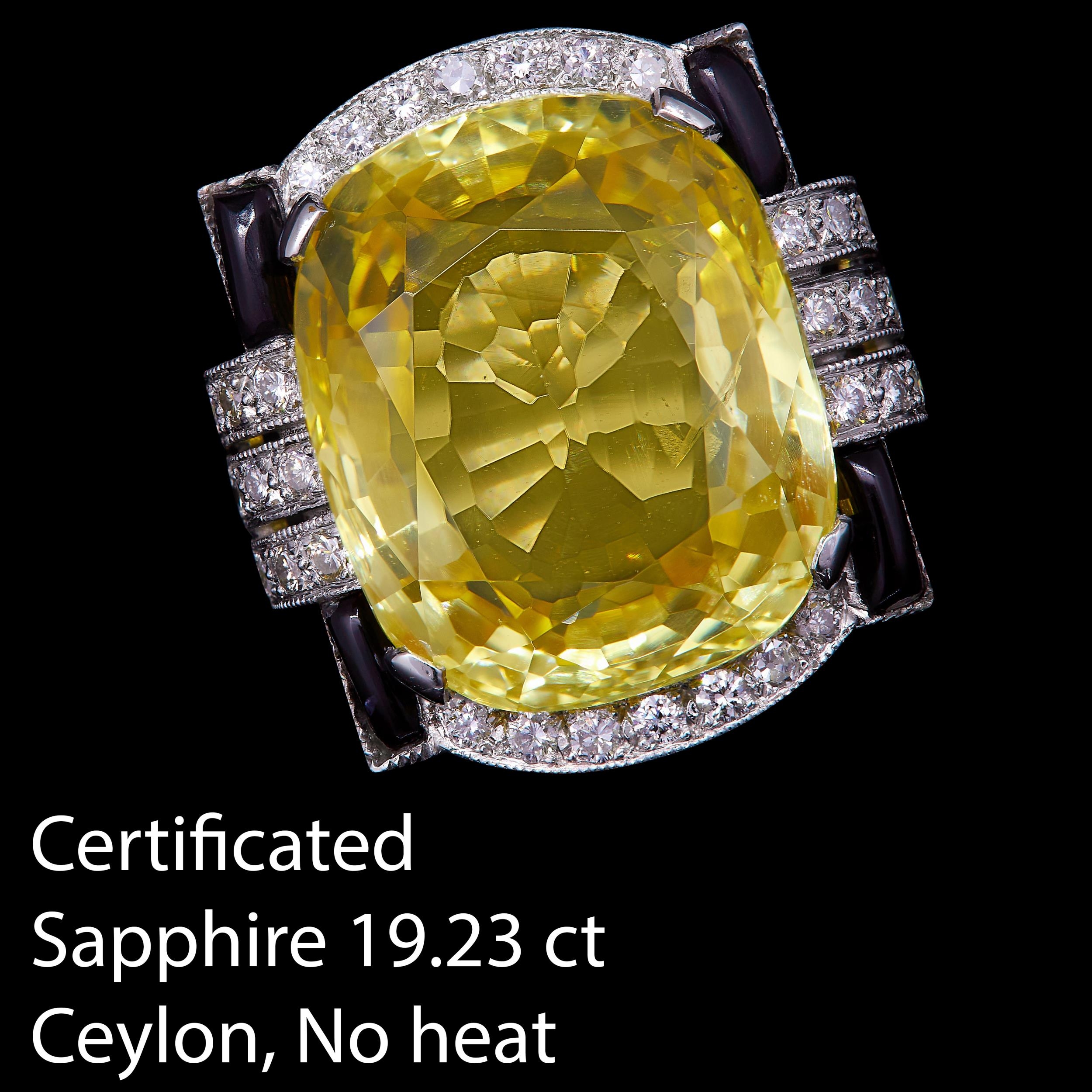 IMPORTANT YELLOW SAPPHIRE AND DIAMOND RING, set with a cushion cut yellow sapphire of 19.23 ct. Flanked by diamonds on the top, bottom and shoulders, and accentuated by 4 onyx. Size. M. 12.9 grams. Accompanied by GCS London report No. 80268-80 stating that the 19.23 ct. yellow sapphire is natural, Ceylon origin, with no indications of heating.