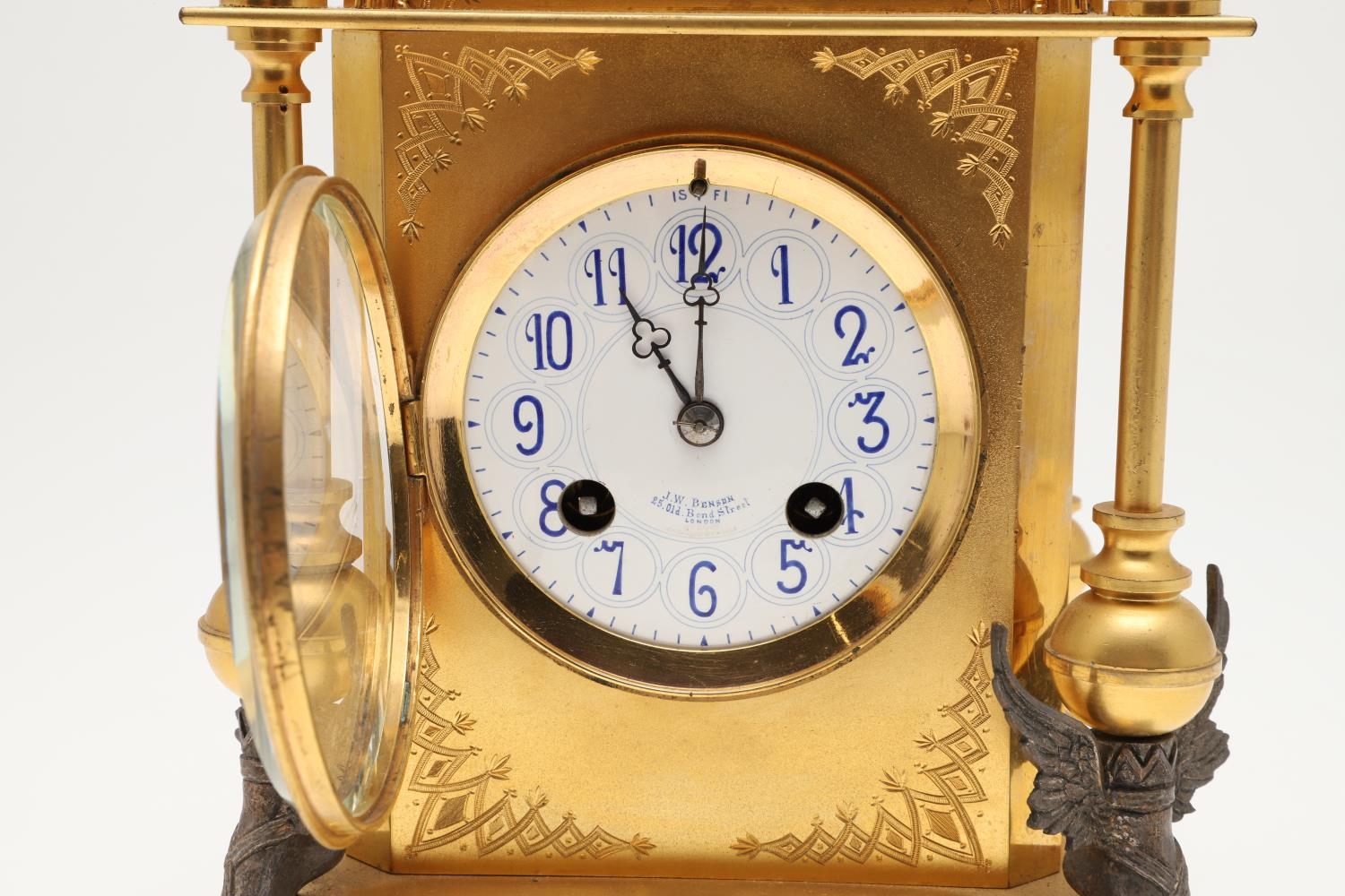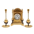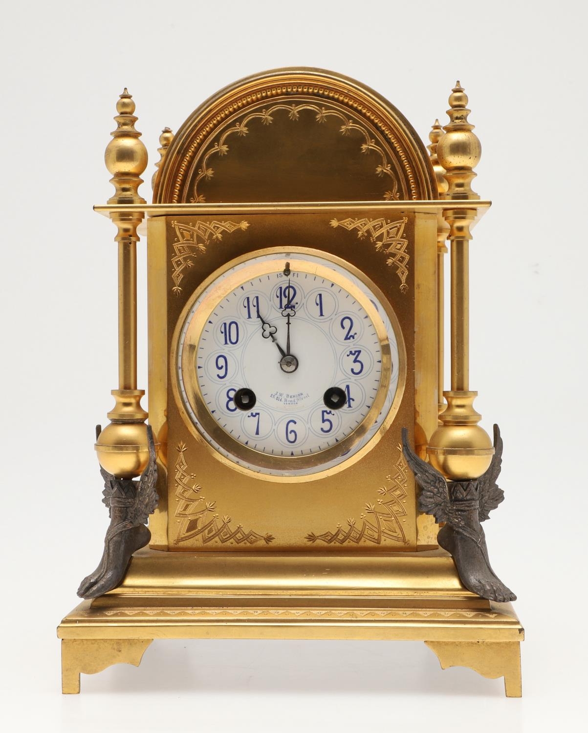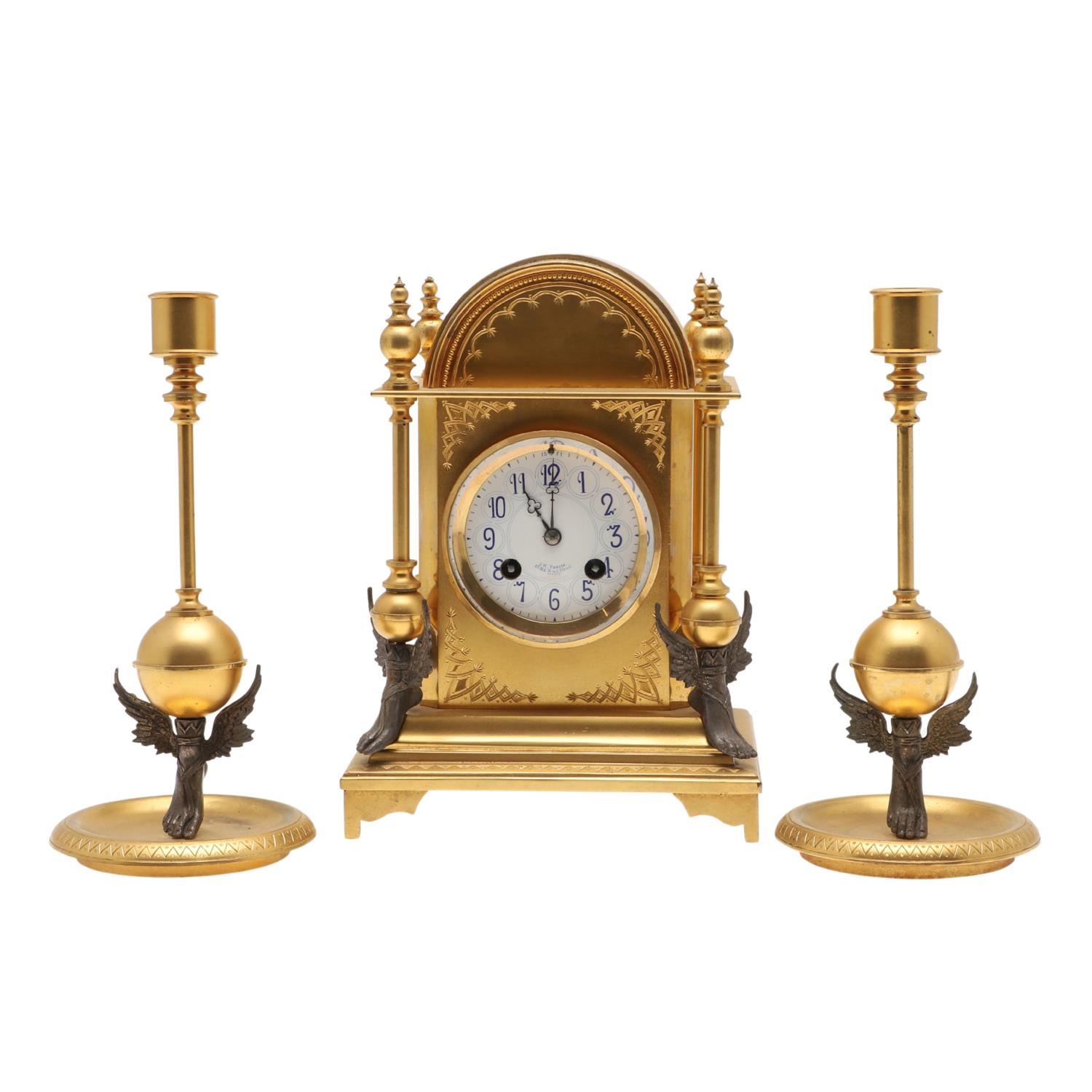 A FRENCH NEO-CLASSICAL GILT BRASS CLOCK GARNITURE. 19th century, the painted enamel dial signed J W Benson, Old Bond St London, the two train movement striking the half hours to a bell, serial number 23479, the arched architectural case with engraved decoration and four columns terminating in white metal winged feet, height 25cm, and a pair of matching candlesticks, height 24cm.