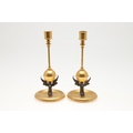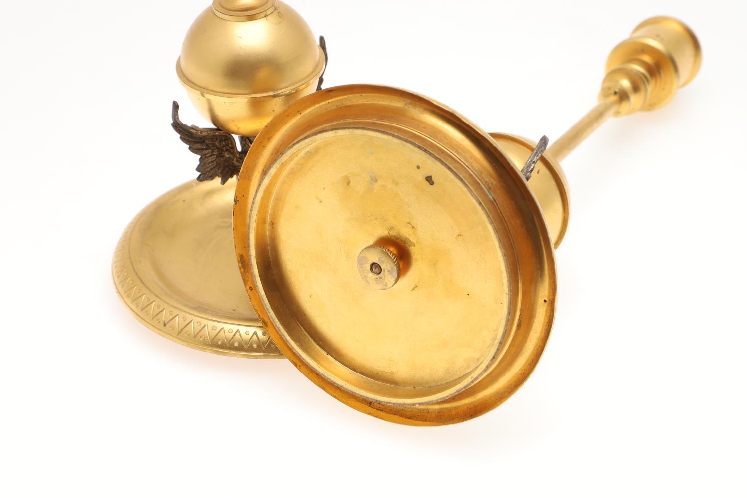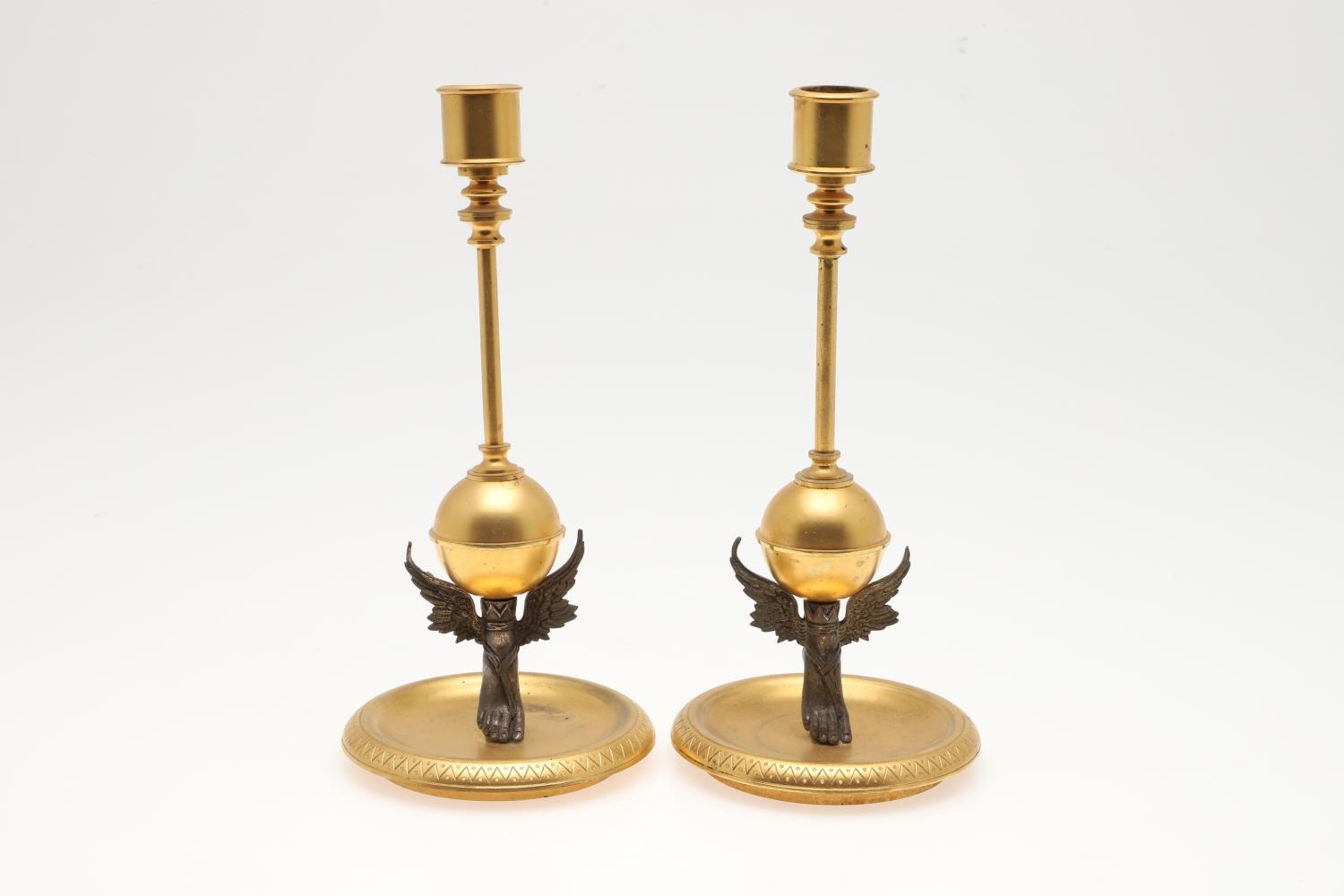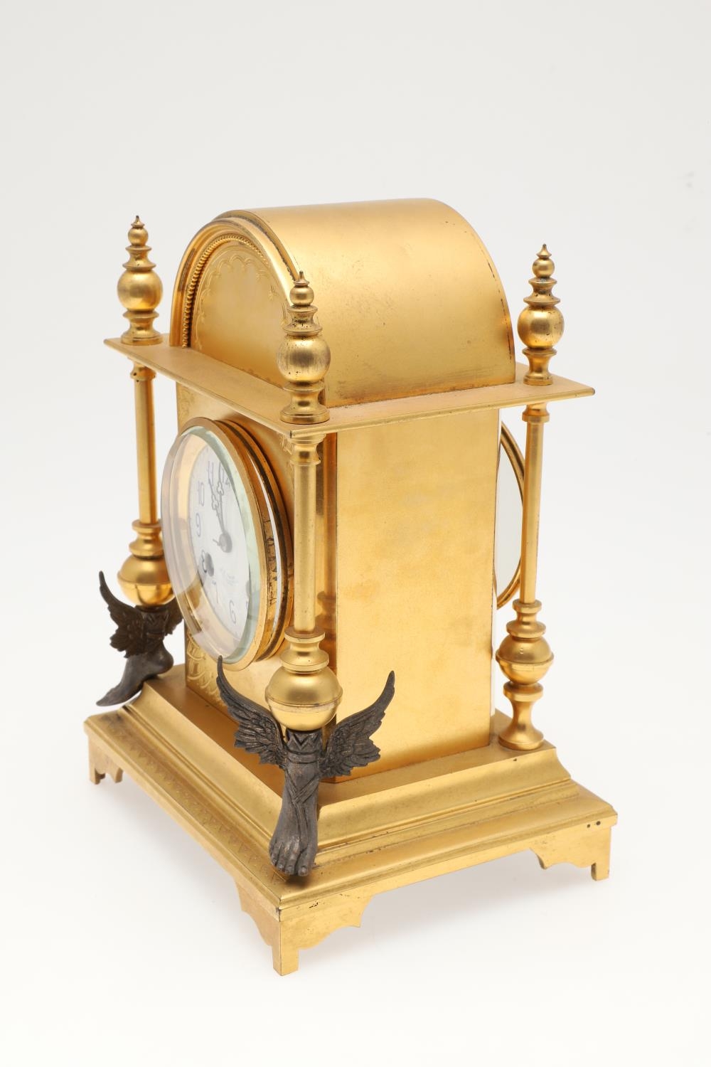 A FRENCH NEO-CLASSICAL GILT BRASS CLOCK GARNITURE. 19th century, the painted enamel dial signed J W Benson, Old Bond St London, the two train movement striking the half hours to a bell, serial number 23479, the arched architectural case with engraved decoration and four columns terminating in white metal winged feet, height 25cm, and a pair of matching candlesticks, height 24cm.