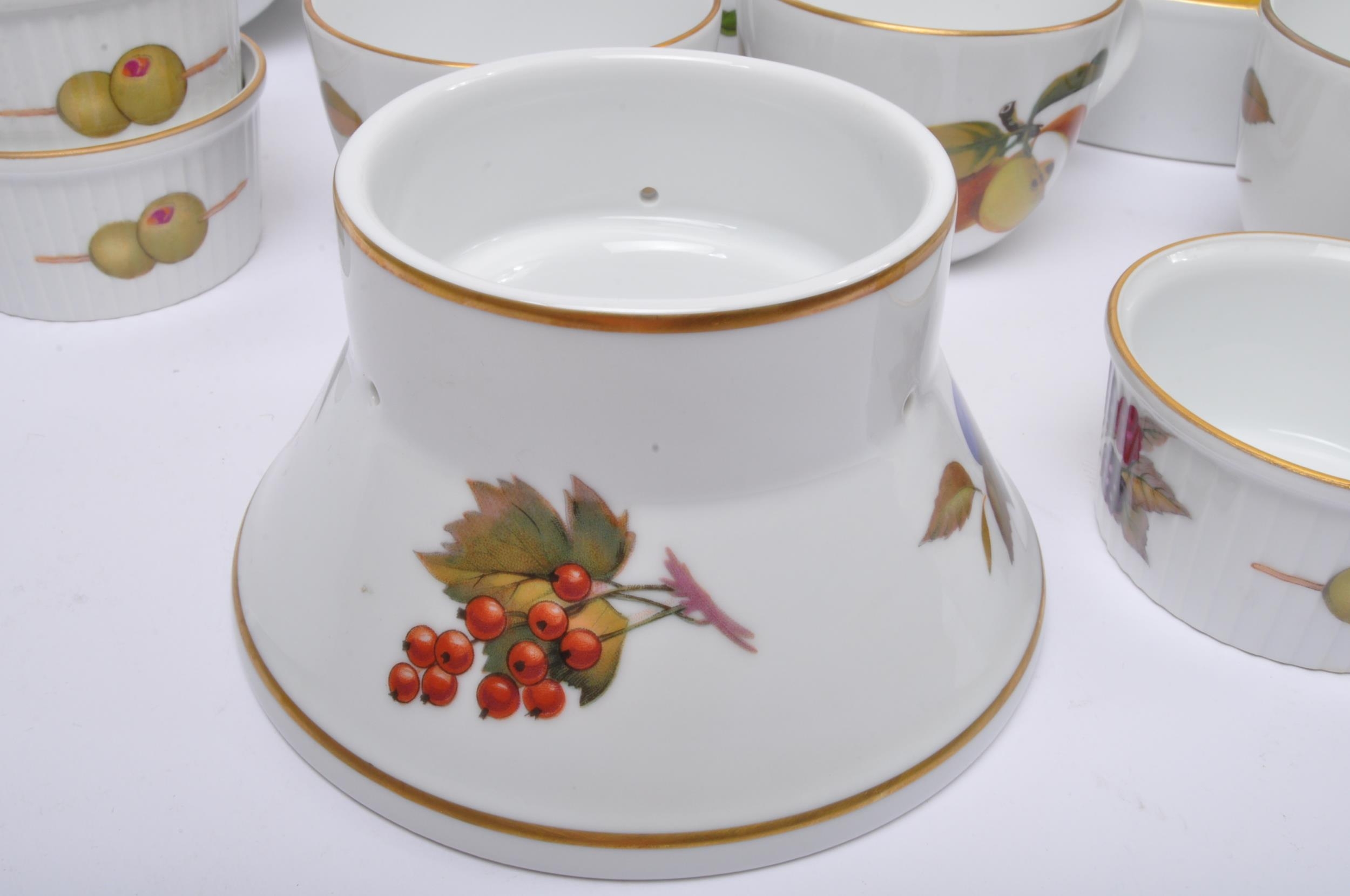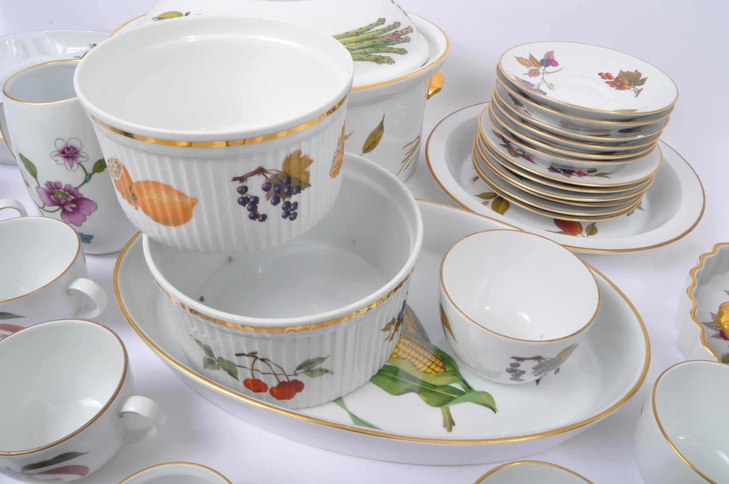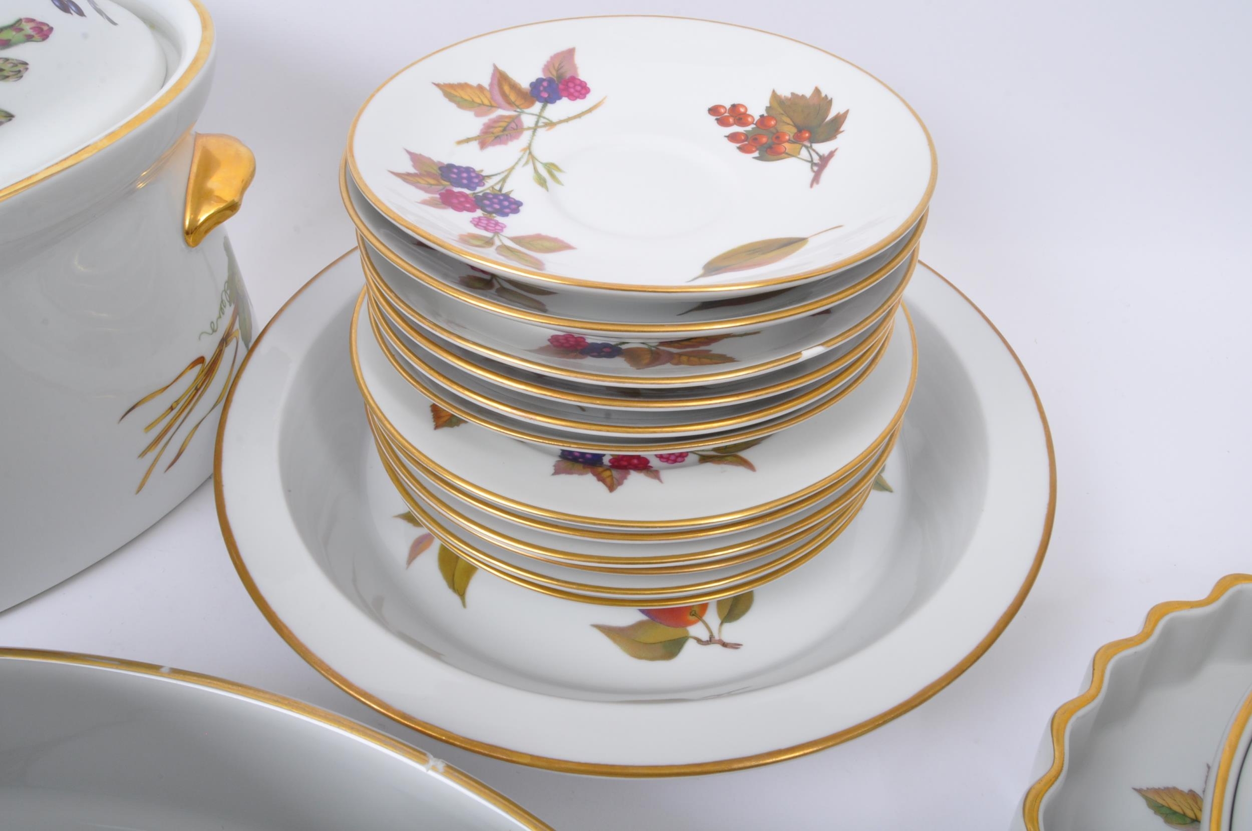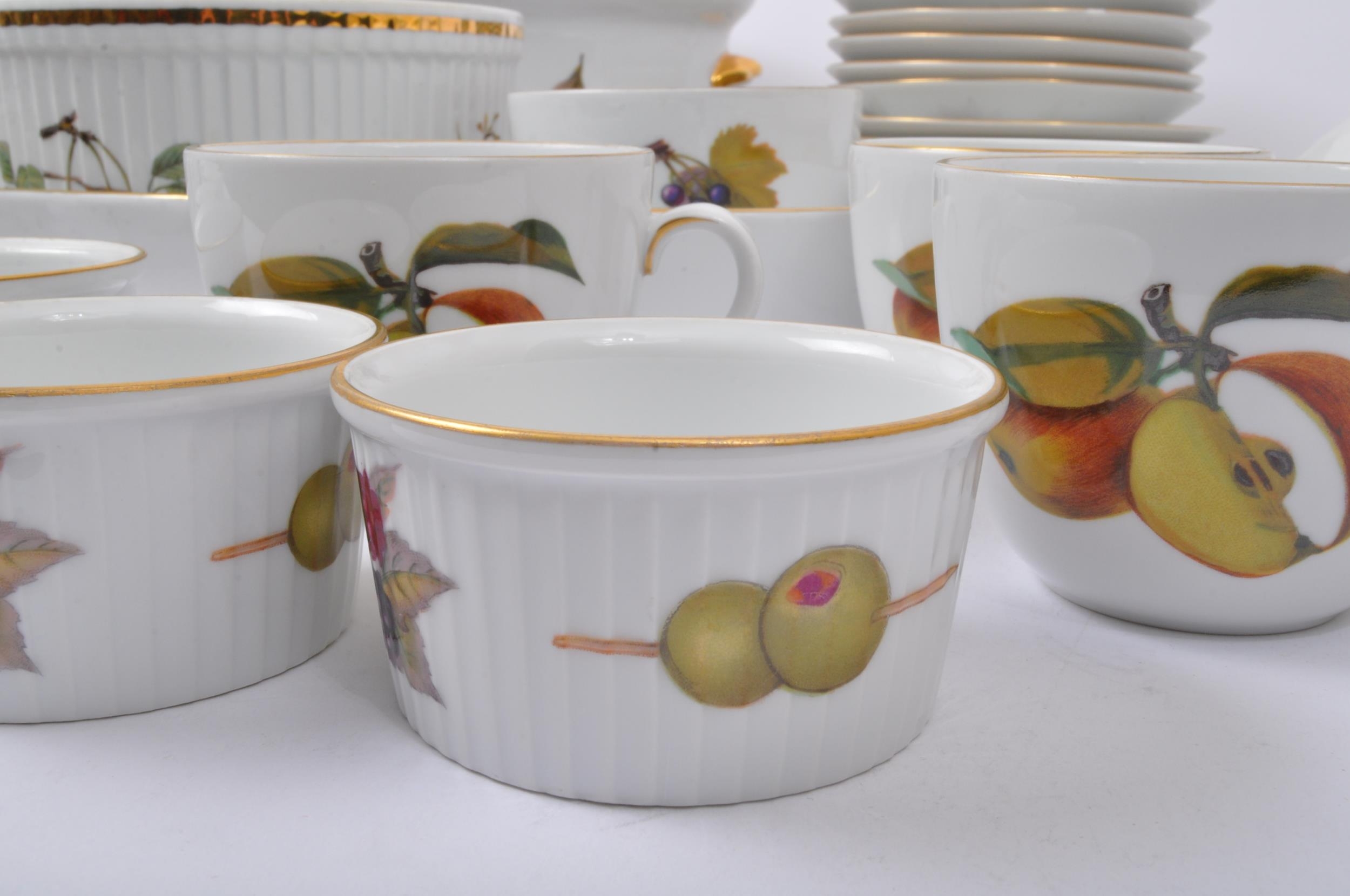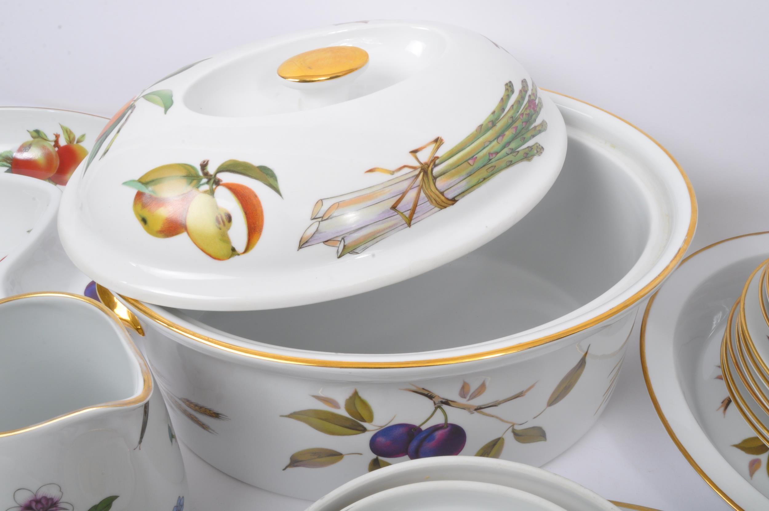 Royal Worcester - Evesham - A vintage 20th century Royal Worcester bone china tea and dinner service in the Evesham pattern. The set comprising of tureens, serving plates, large lidded casserole serving dish, sugar bowl, teacups, saucers, jug, peppertree and side plates.