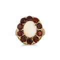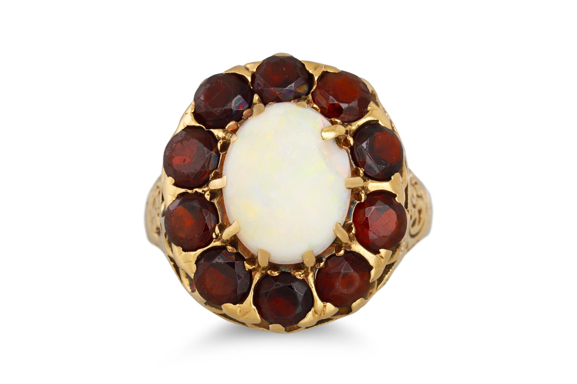 A VINTAGE OPAL AND GARNET CLUSTER DRESS RING, mounted in 18ct yellow gold, size N Condition: opal chipped