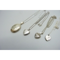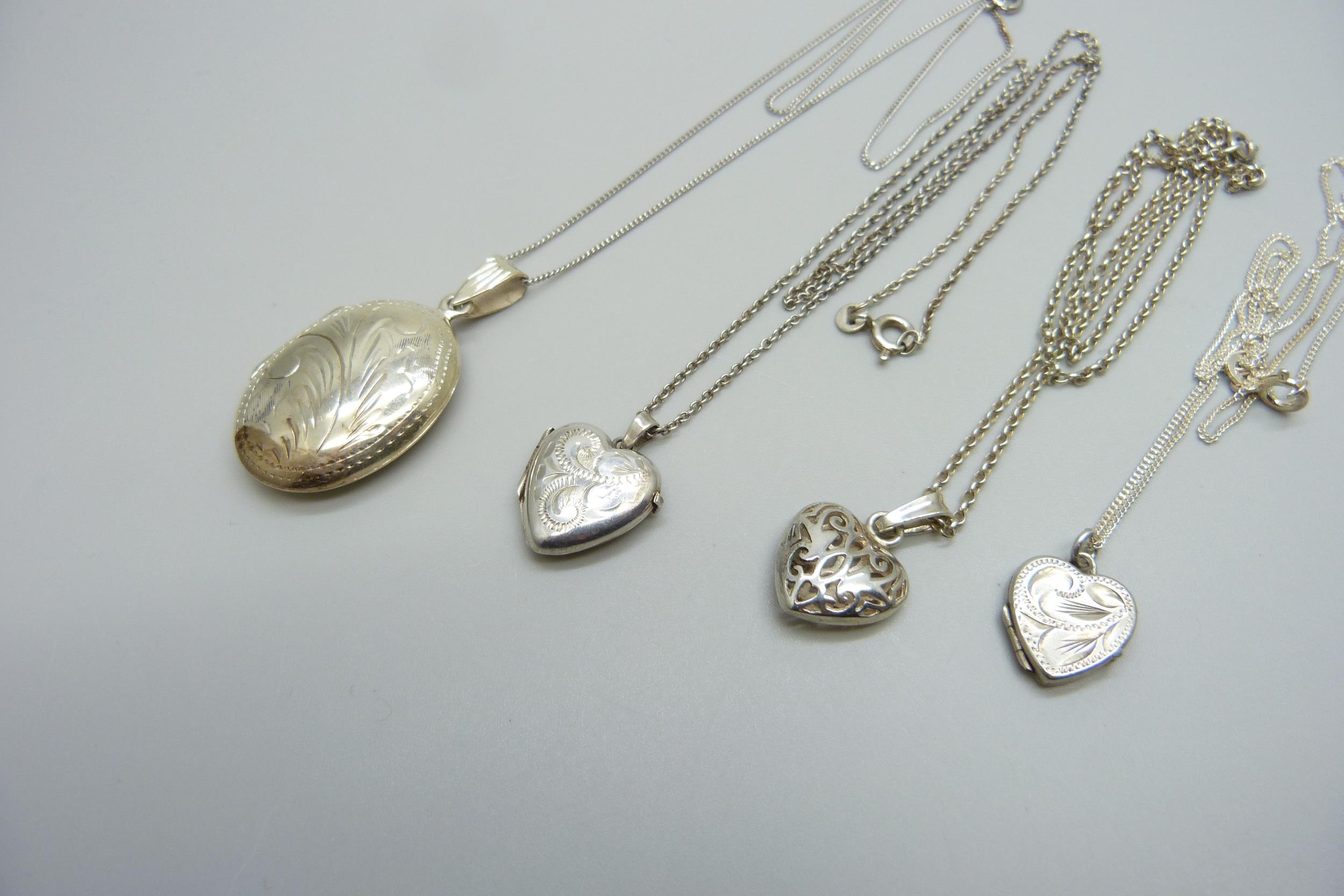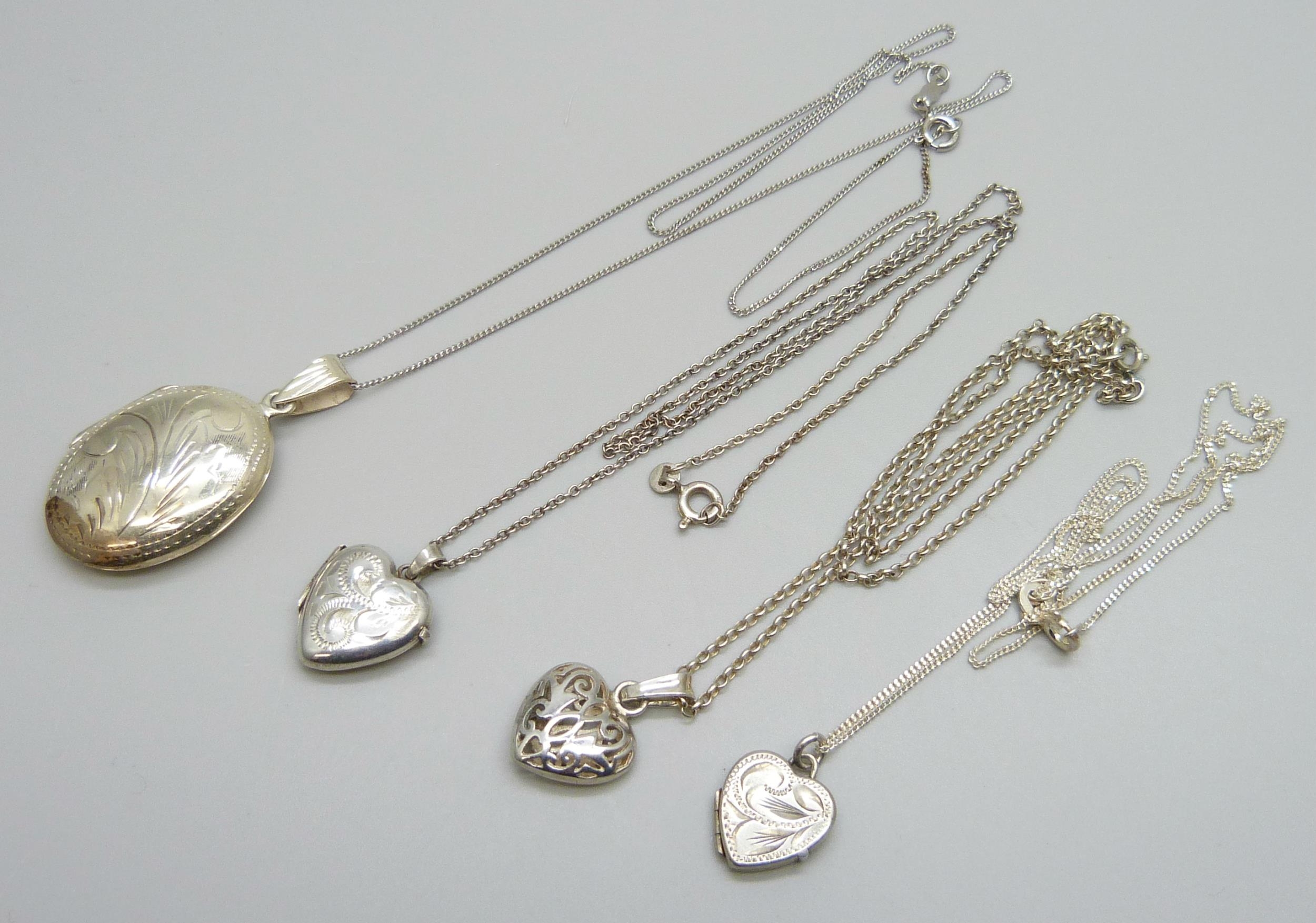 Three silver lockets and chains and a silver heart pendant and chain, 17g