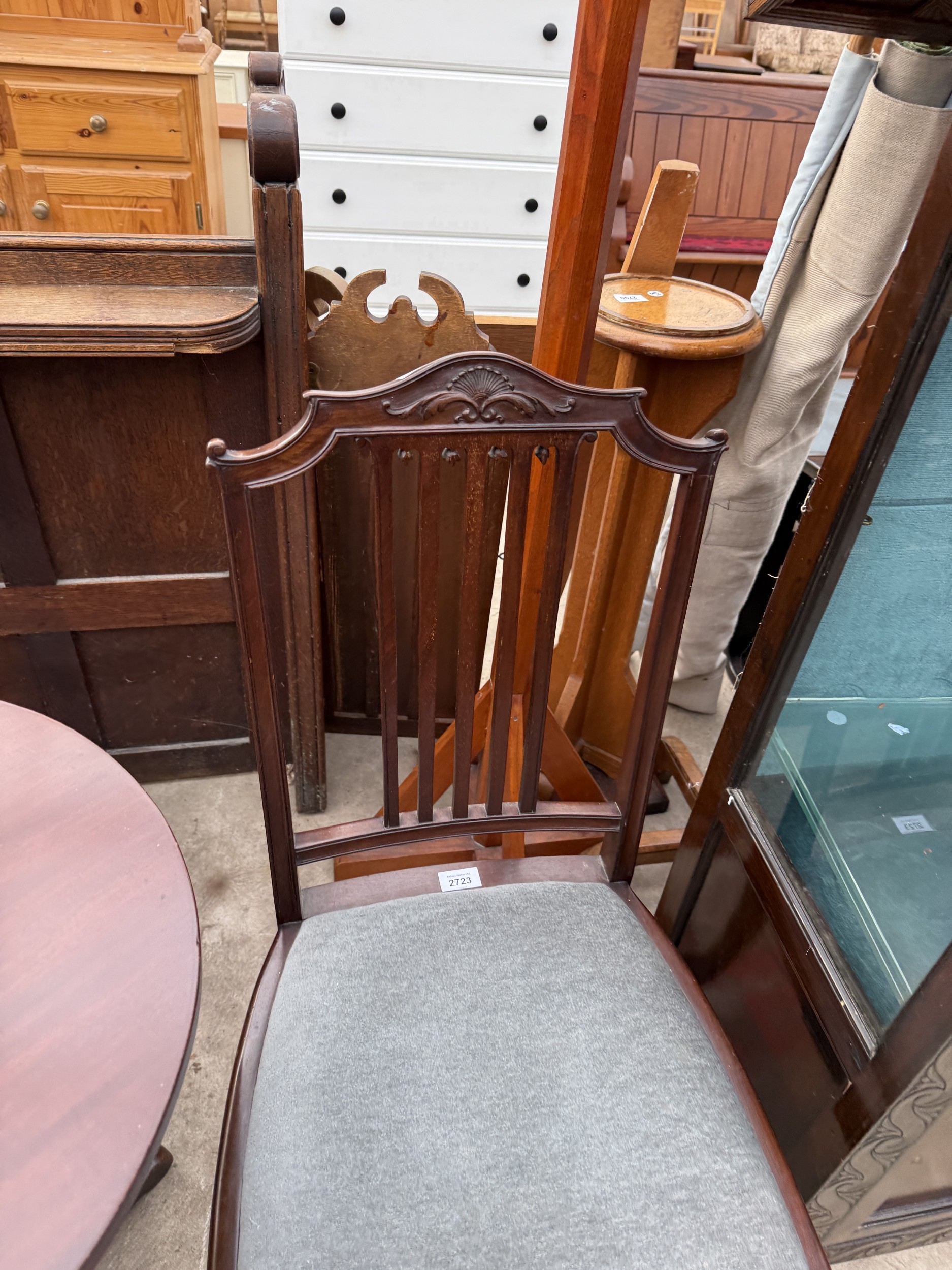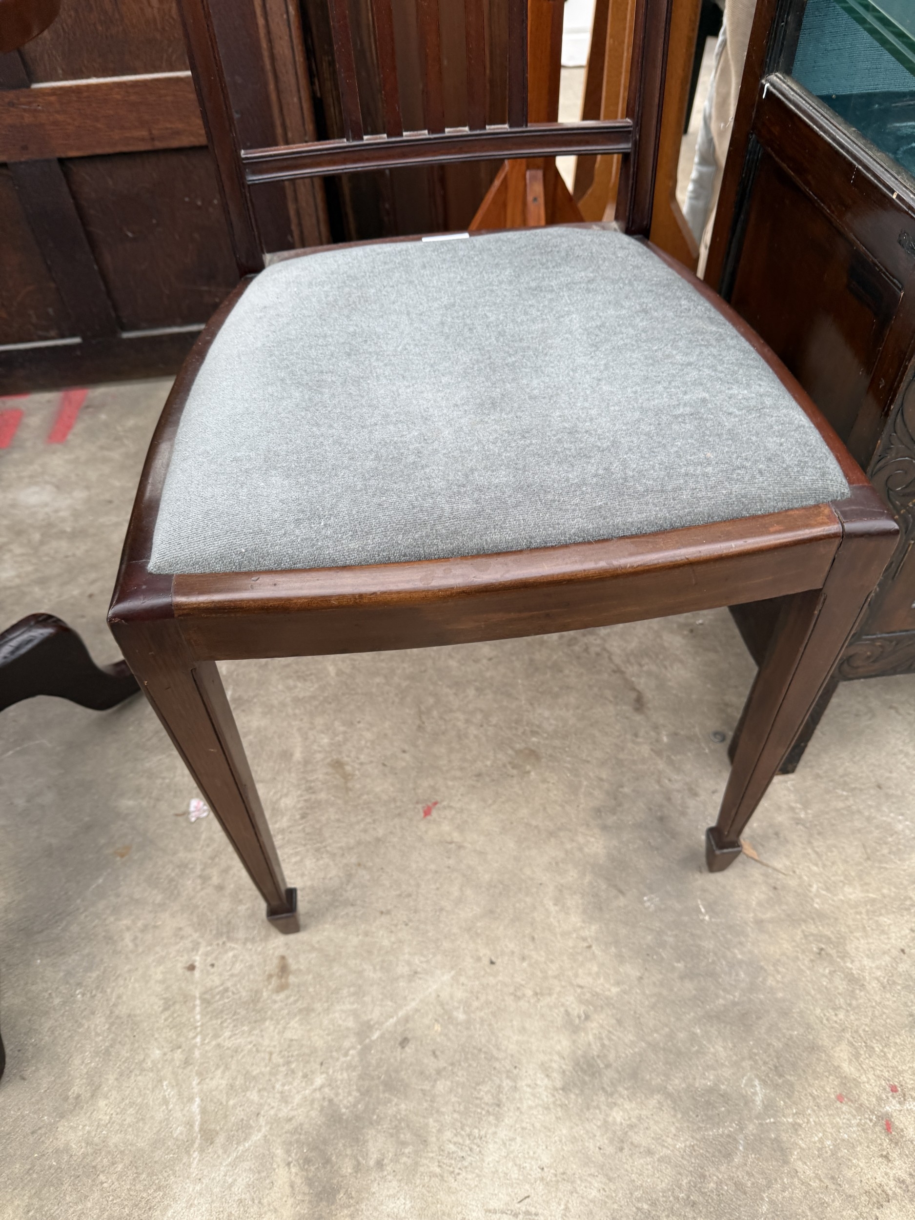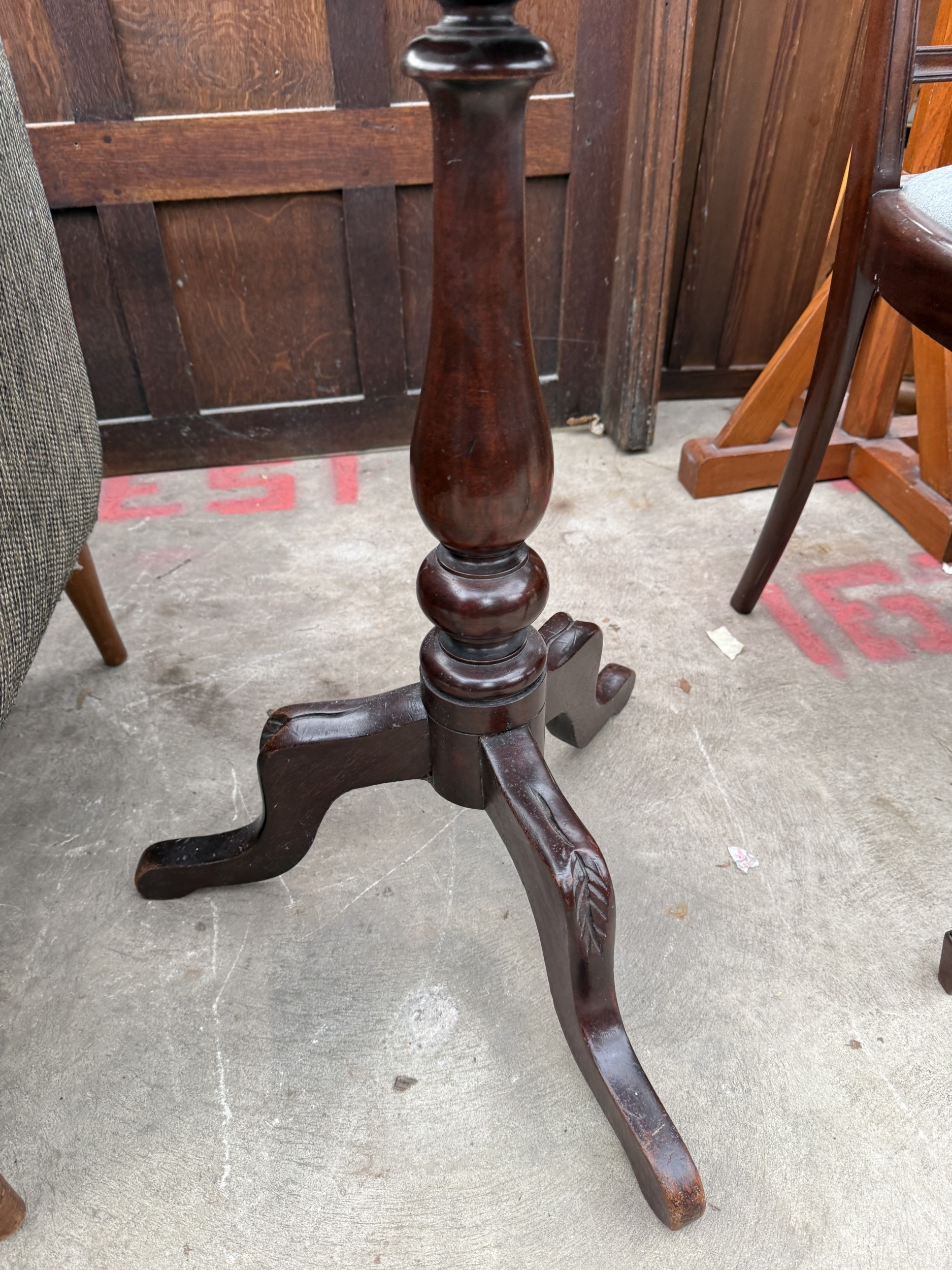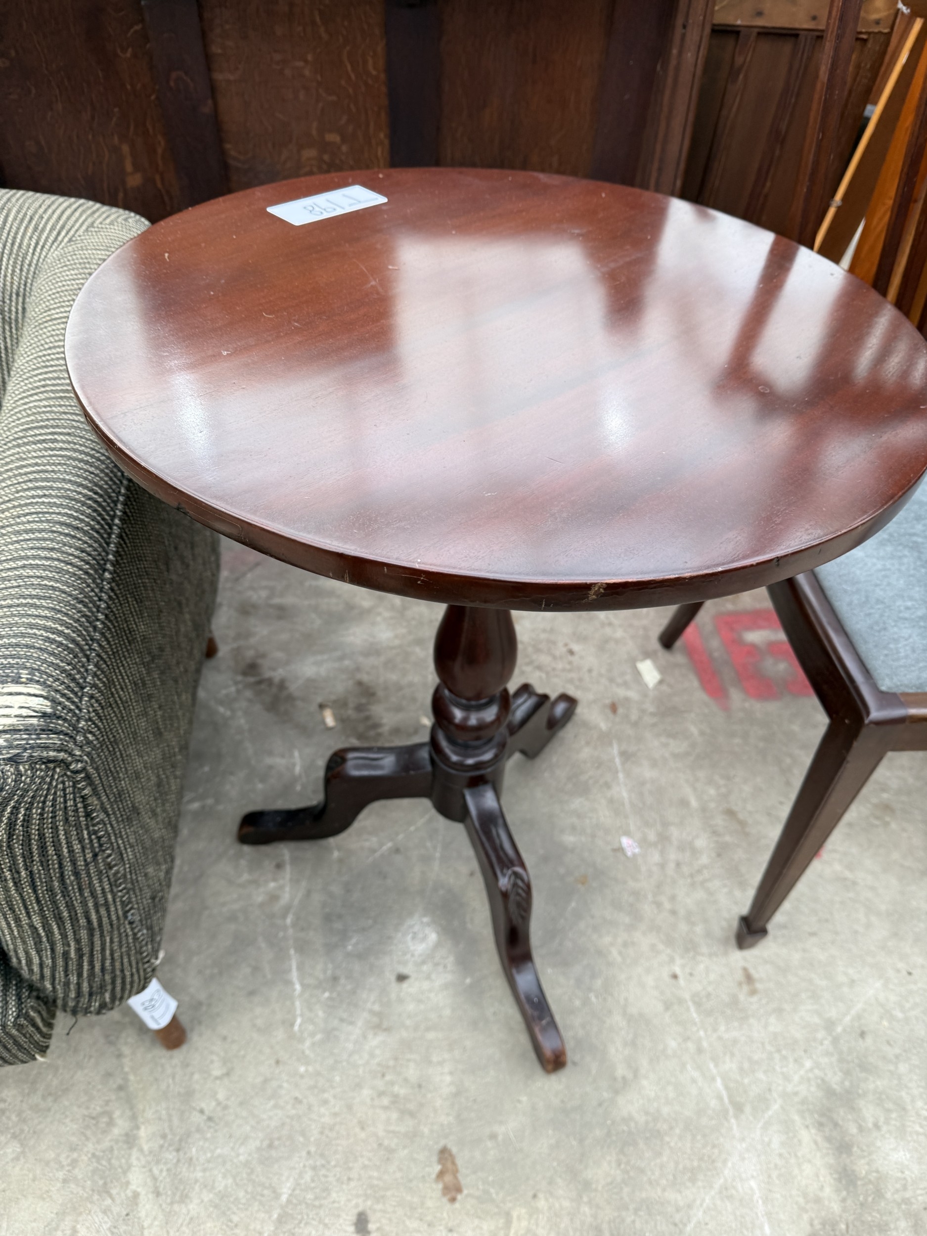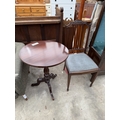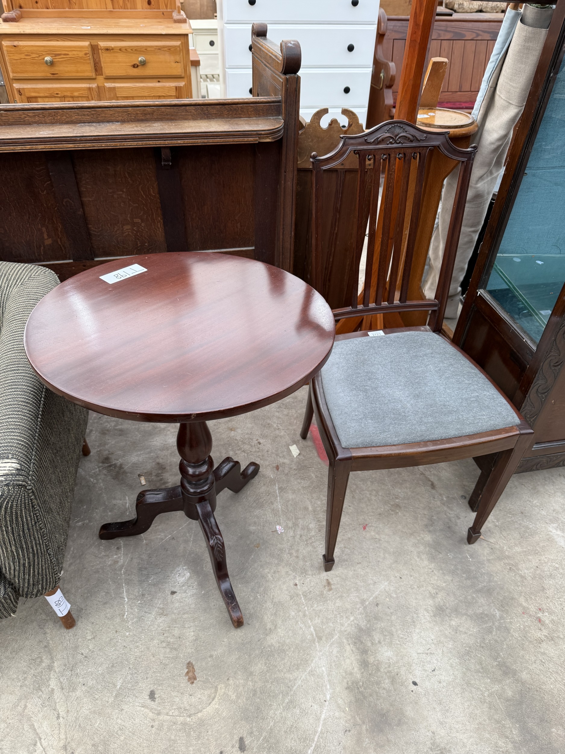 A 19TH CENTURY STYLE MAHOGANY TRIPOD TABLE, 21.5" DIAMETER, AND MAHOGANY BEDROOM CHAIR ON TAPERING LEGS