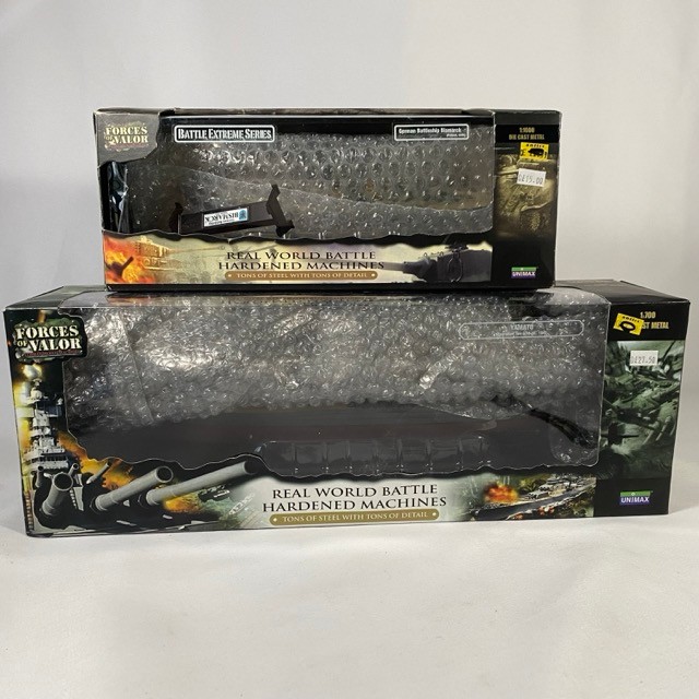 Forces of Valor Unimax die-cast metal models German Battleship Bismark 1:1000 (Fair - signs of repair) and Yamato Operation Ten-ichi-go 1:700 (Very Good) - boxes Fair/Good (2) 1400g