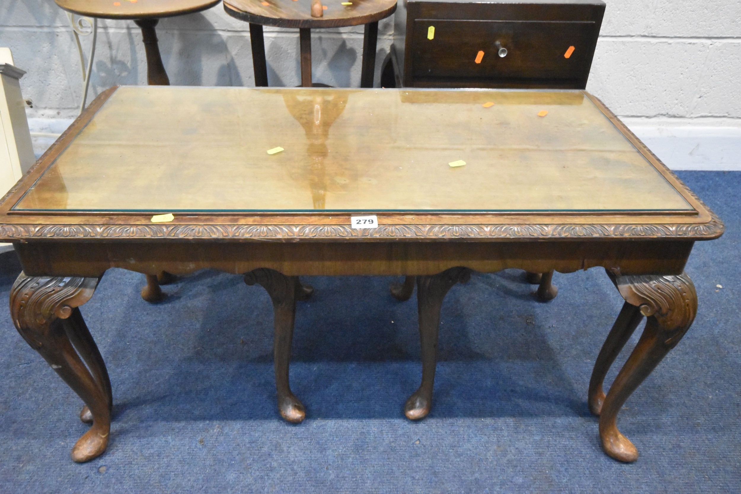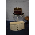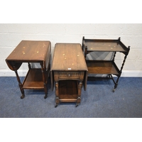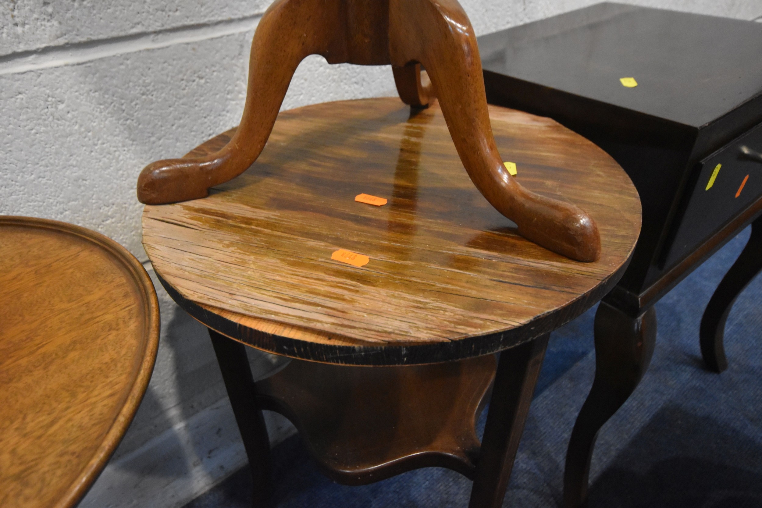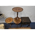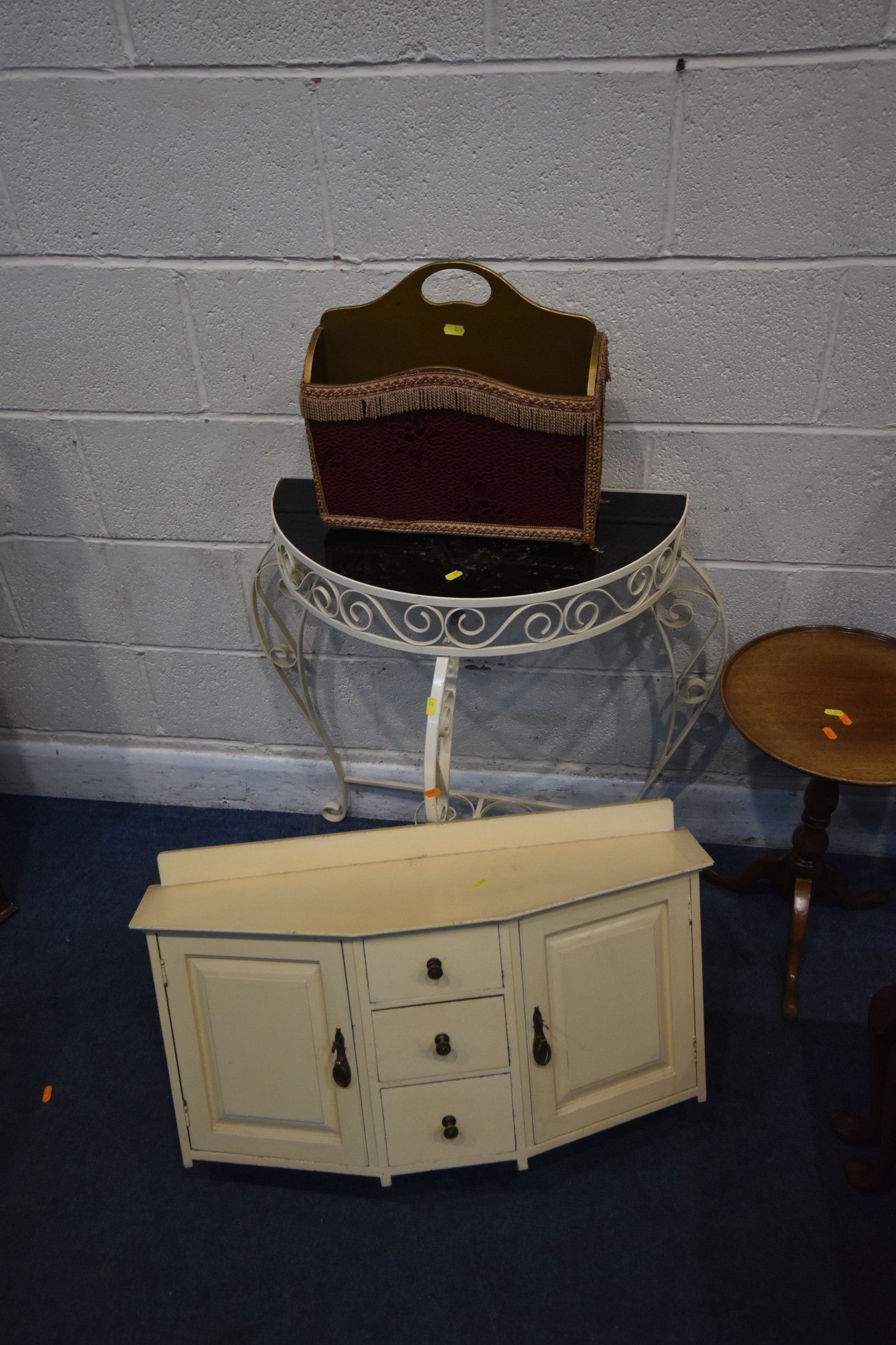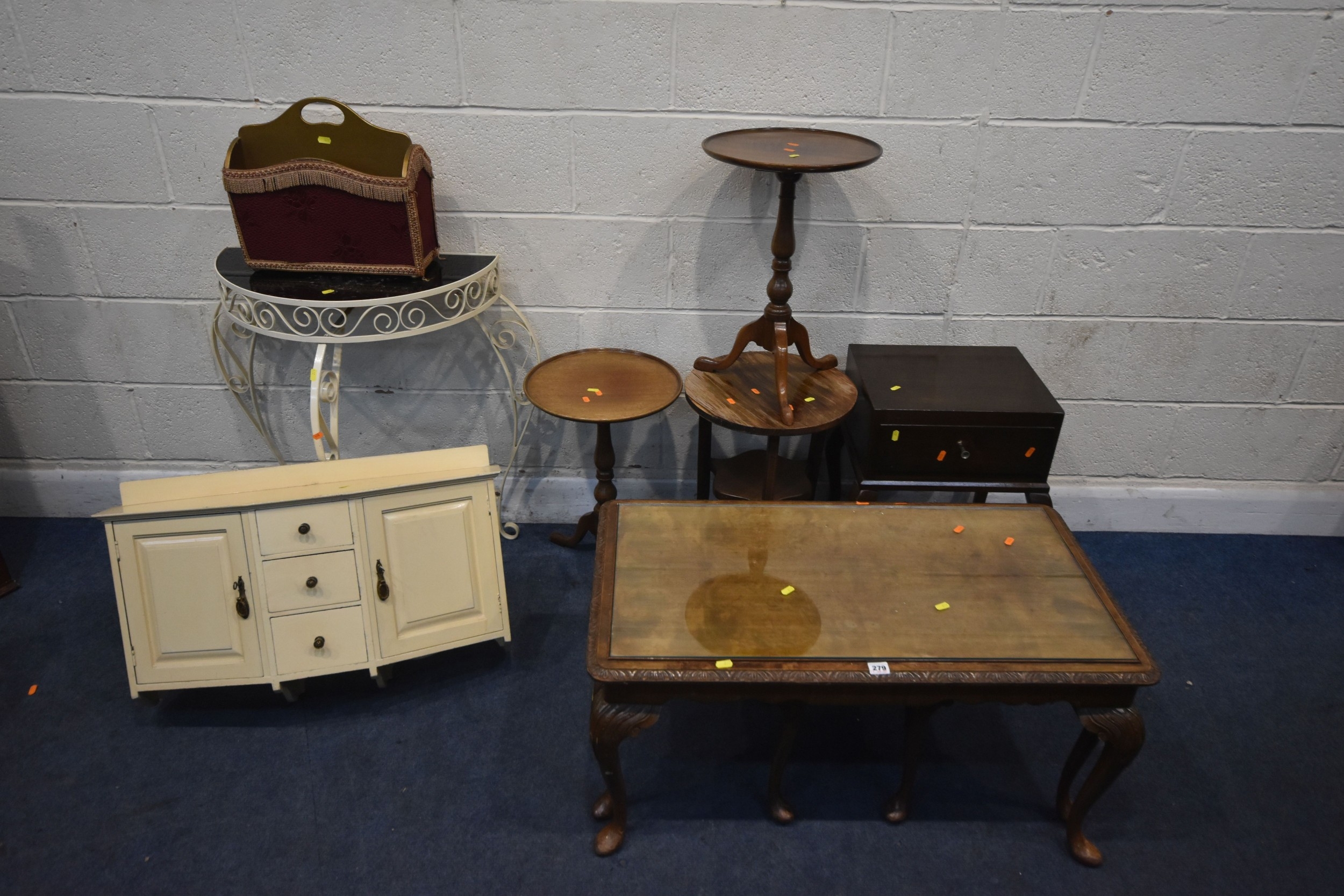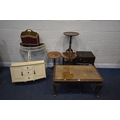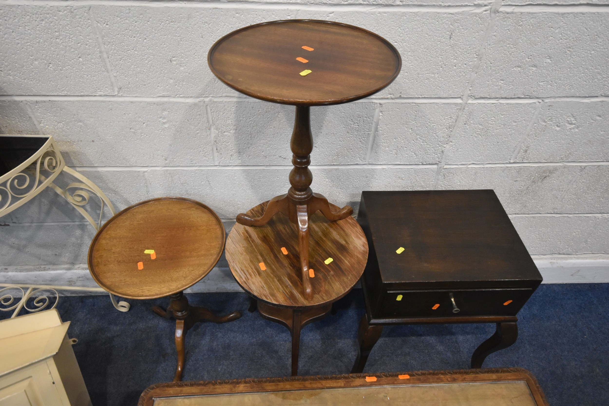 A SELECTION OF OCCASIONAL FURNITURE, to include a nest of three tables, largest table width 92cm x depth 52cm x height 46cm, a lamp table with a single drawer, three tripod tables, a white painted metal side table with a smoked glass insert, a wall hanging cabinet and a magazine rack, condition report: all with imperfections, such as marks, scuffs, stains, discolouration, one tripod table in need of restoration, hanging cabinet with two keys, other wear and usage (8)