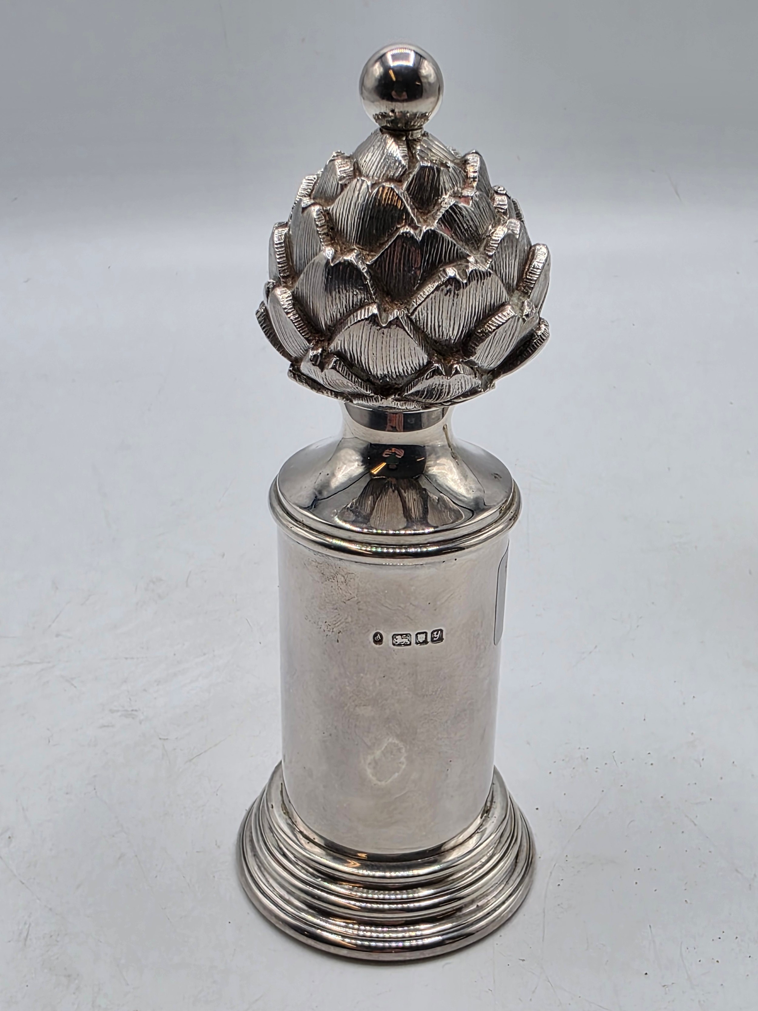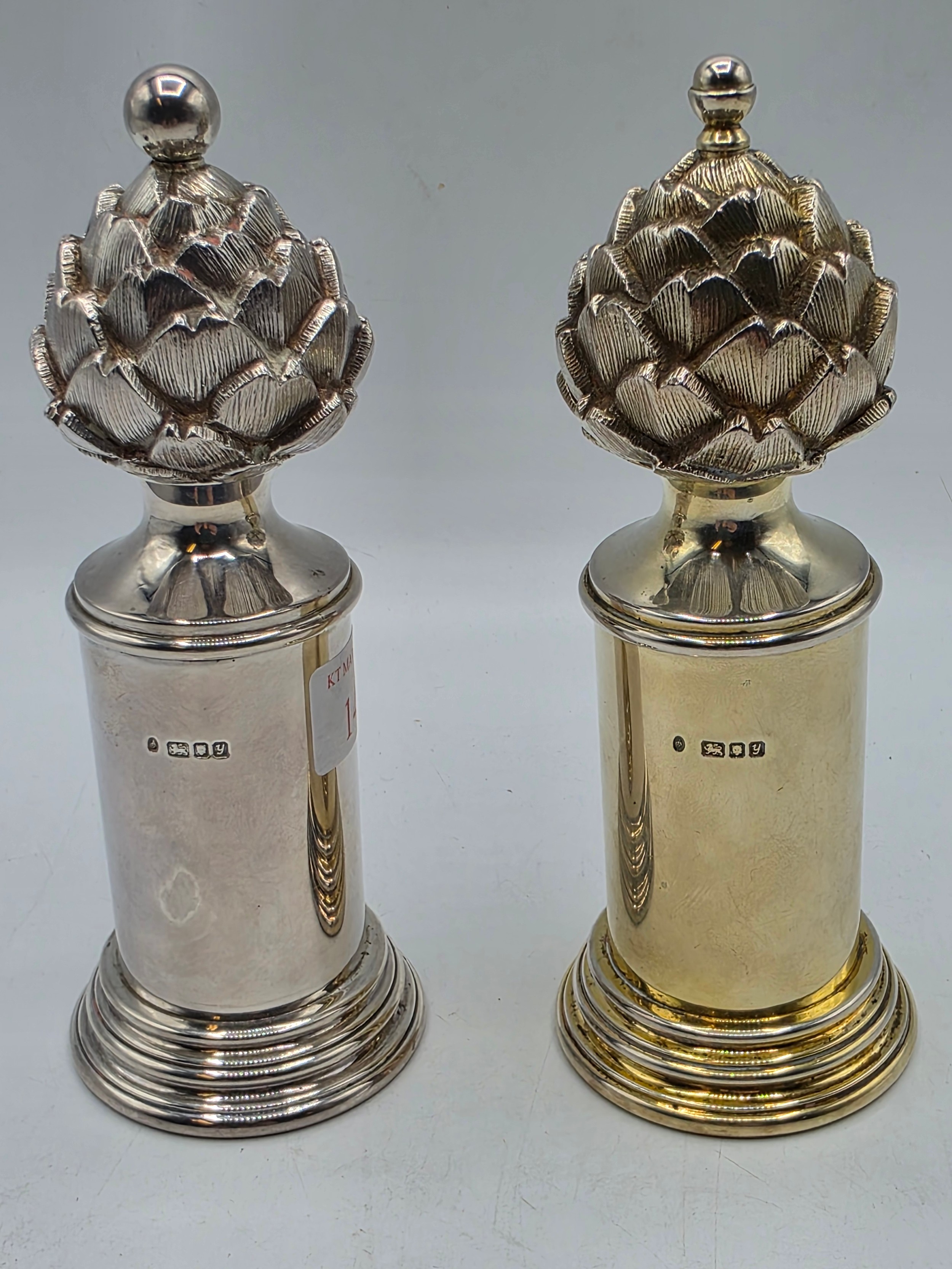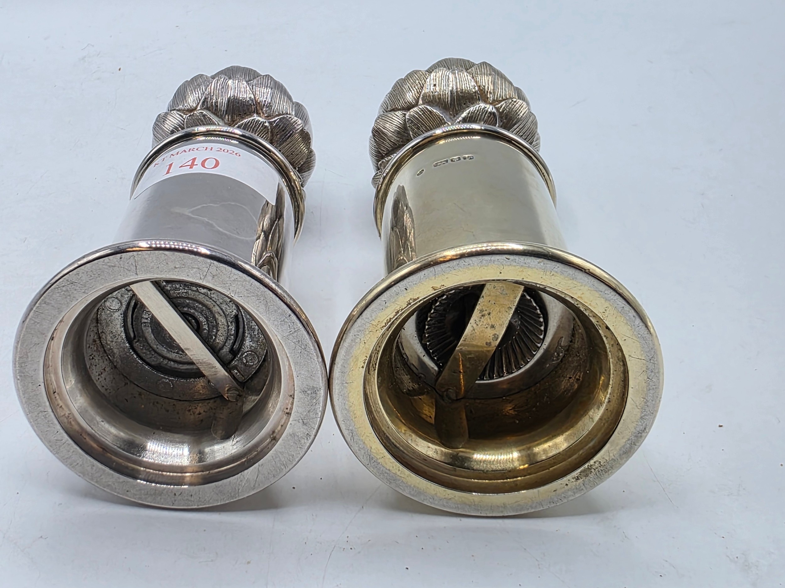 A SIMILAR pair of sterling silver pepper grinders, with stylised artichoke finials. Each 15cm (h) by Asprey & Co London 1998. Metal cored. Gross weight 900g. the tinials as per the photo - are slightly different, and the mechanism are slightly different. the colours are slightly different.