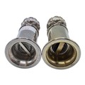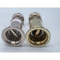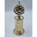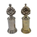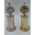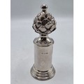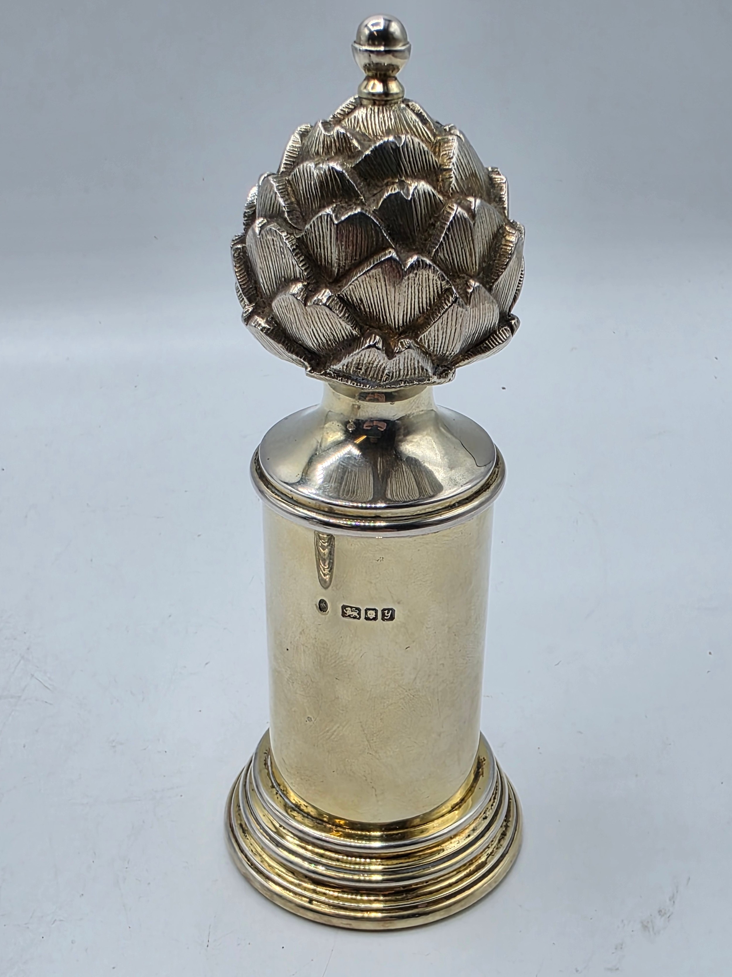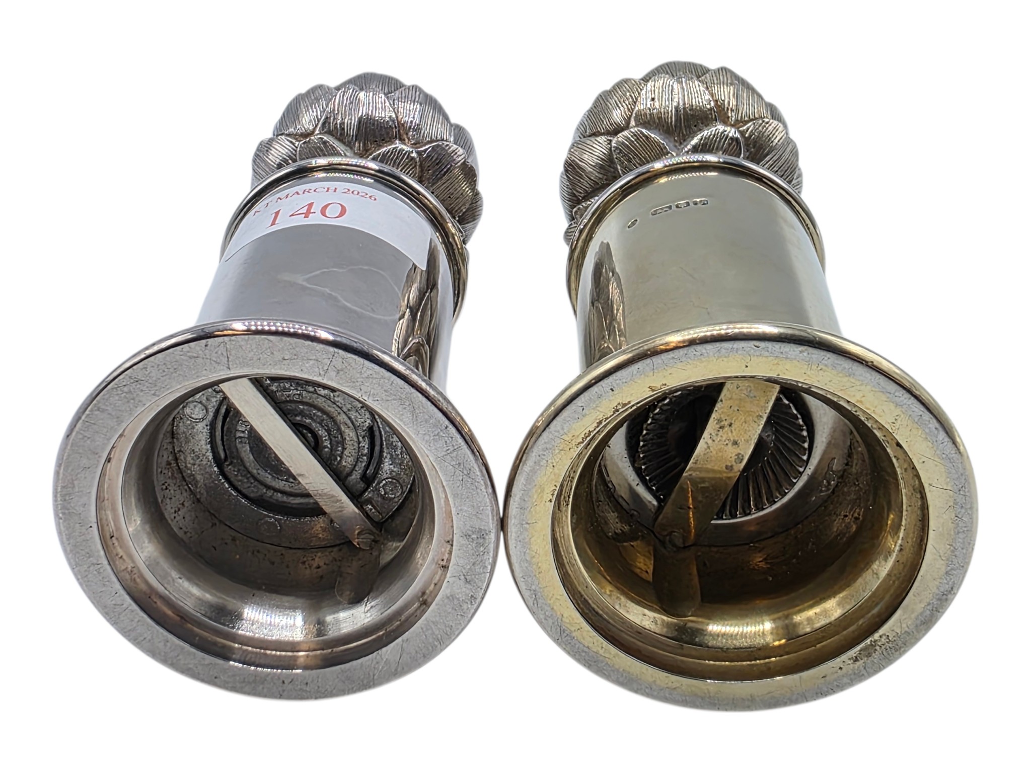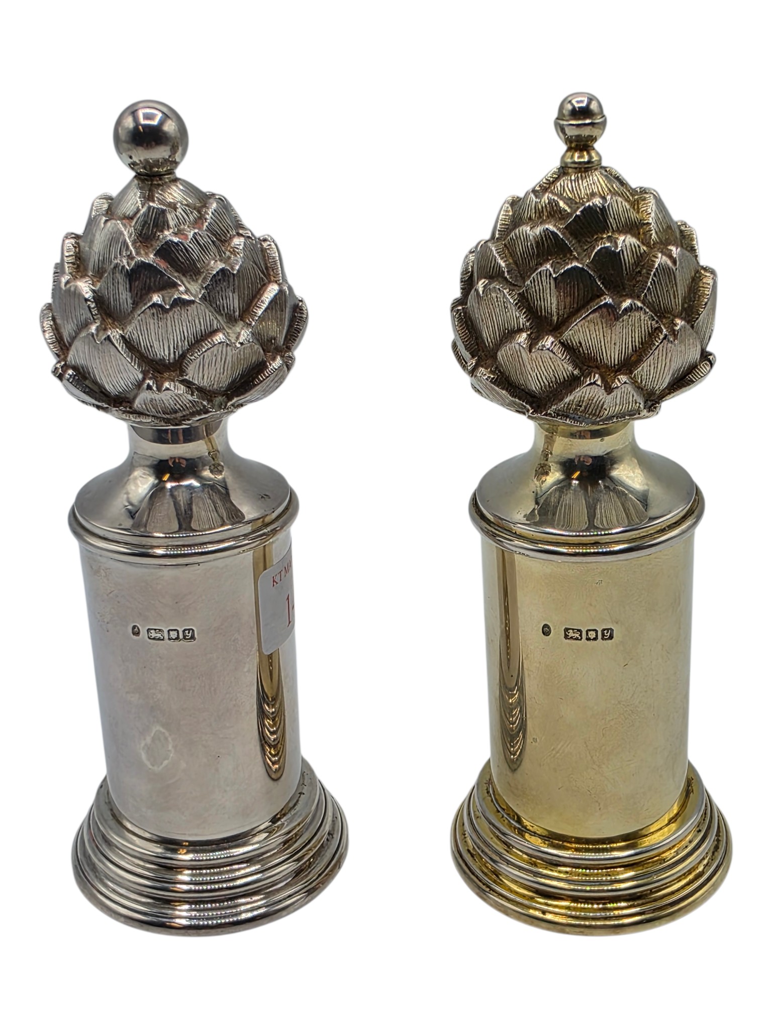A SIMILAR pair of sterling silver pepper grinders, with stylised artichoke finials. Each 15cm (h) by Asprey & Co London 1998. Metal cored. Gross weight 900g. the tinials as per the photo - are slightly different, and the mechanism are slightly different. the colours are slightly different.