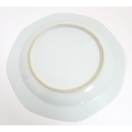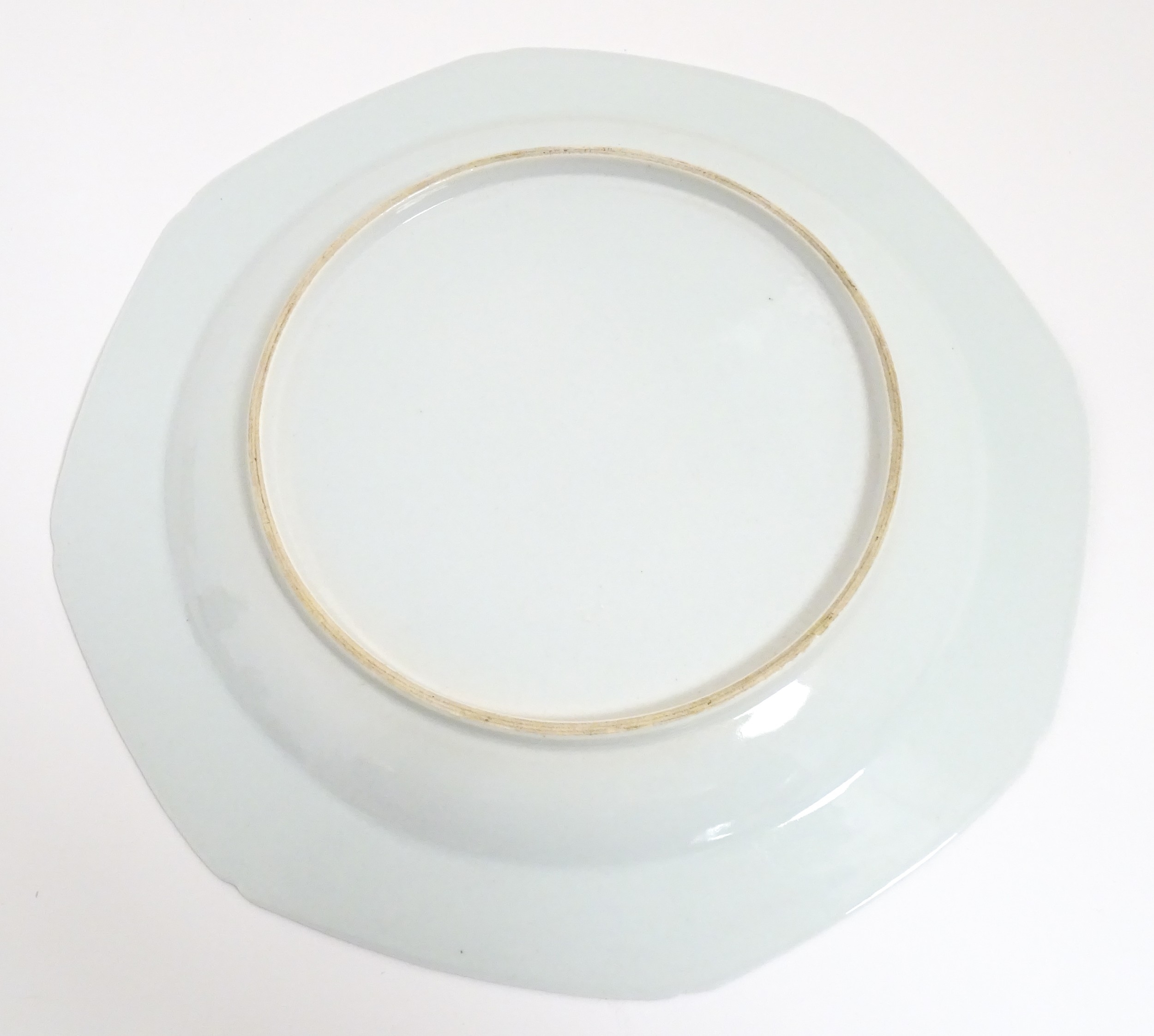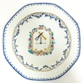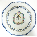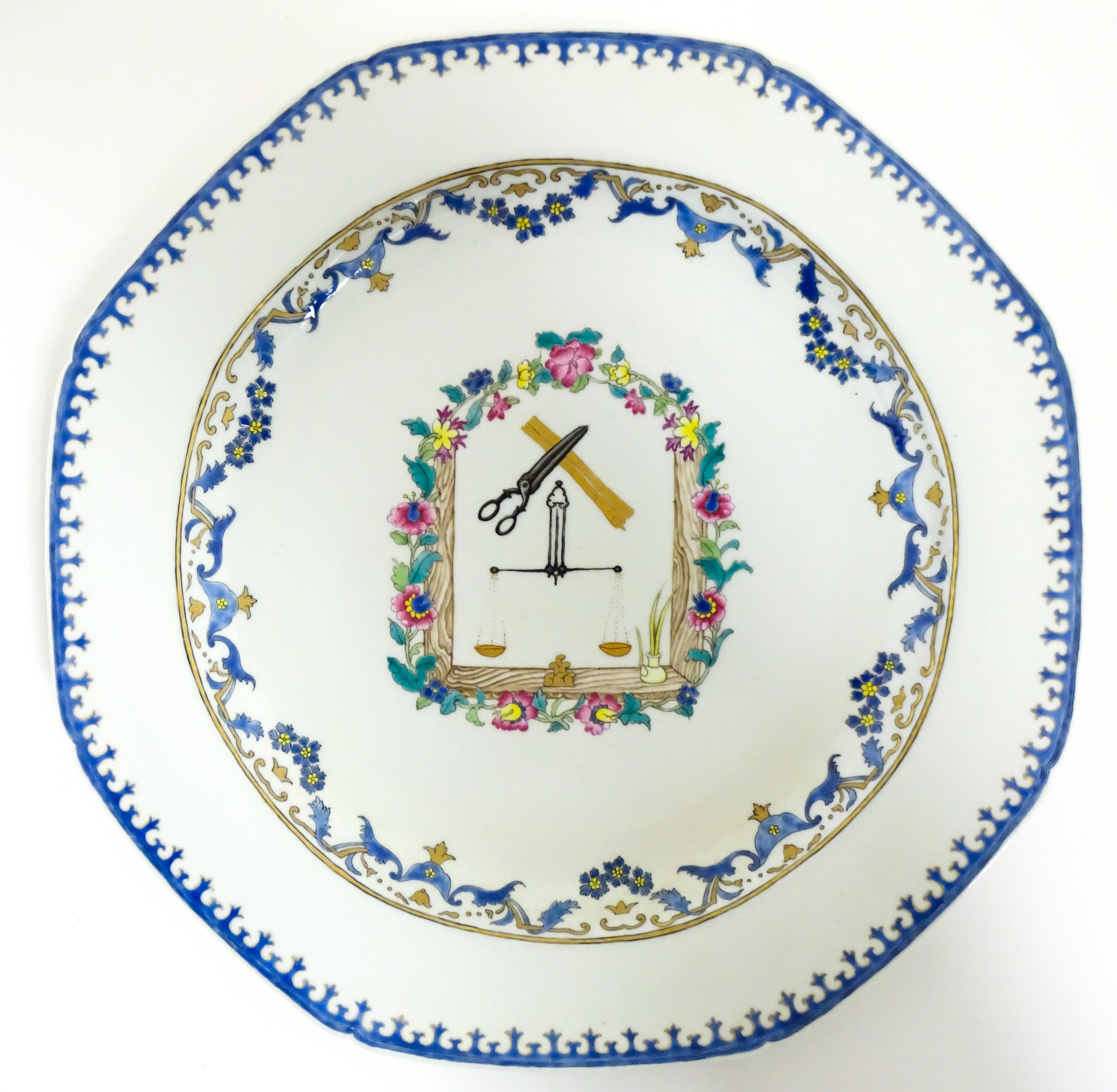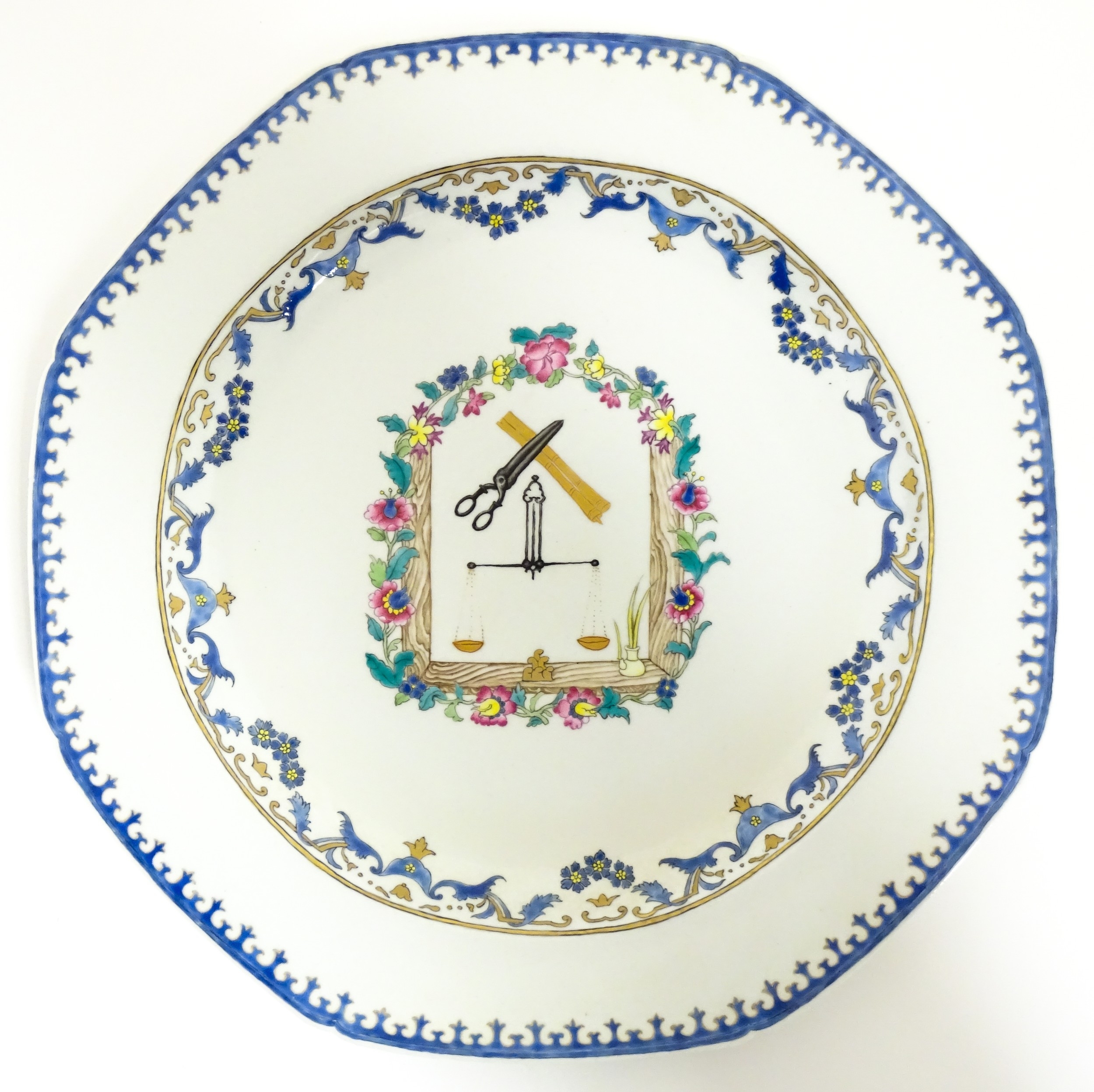 A Chinese export famille rose plate decorated with commerce motifs of scales, shears and bamboo. With a floral border. Approx. 11" wide