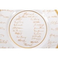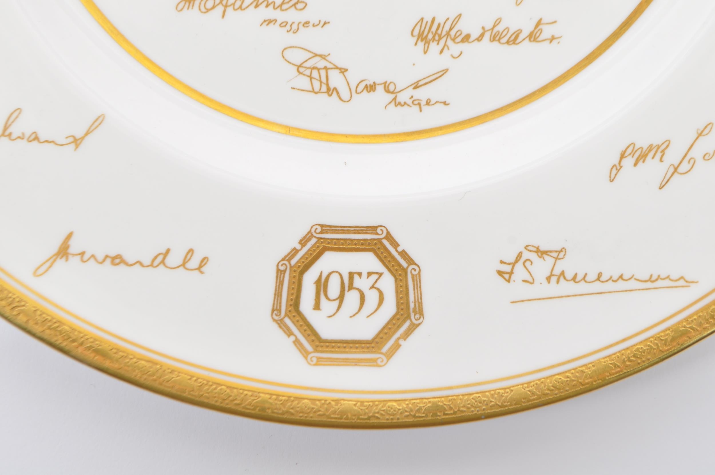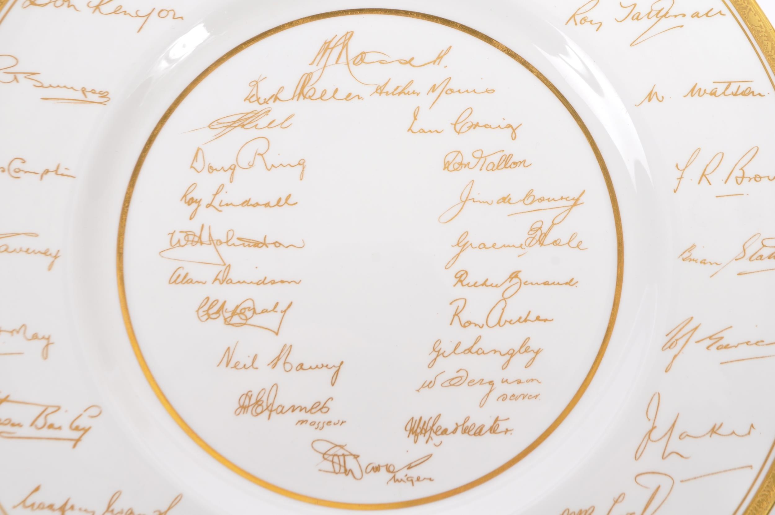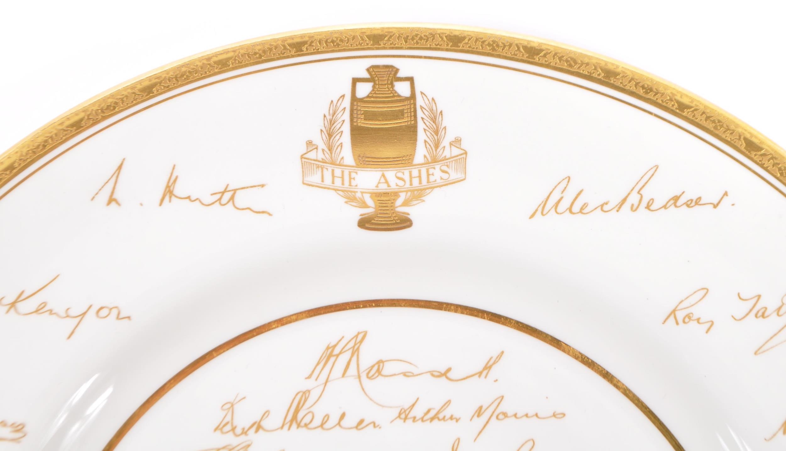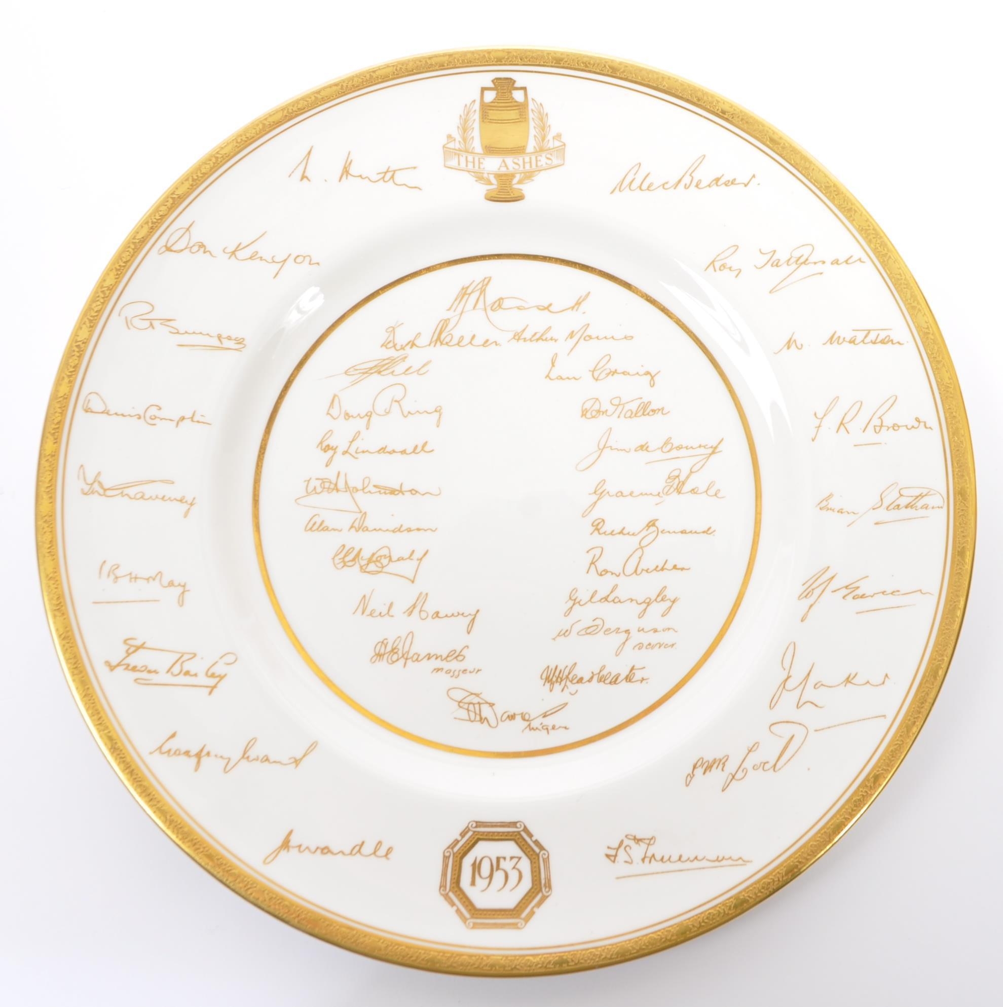 A mid 20th century 1953 Royal Worcester commemorative The Ashes wall plate. The plate having white ground with gilt detailing to rim and gilt signatures. Measures approx. 27cm