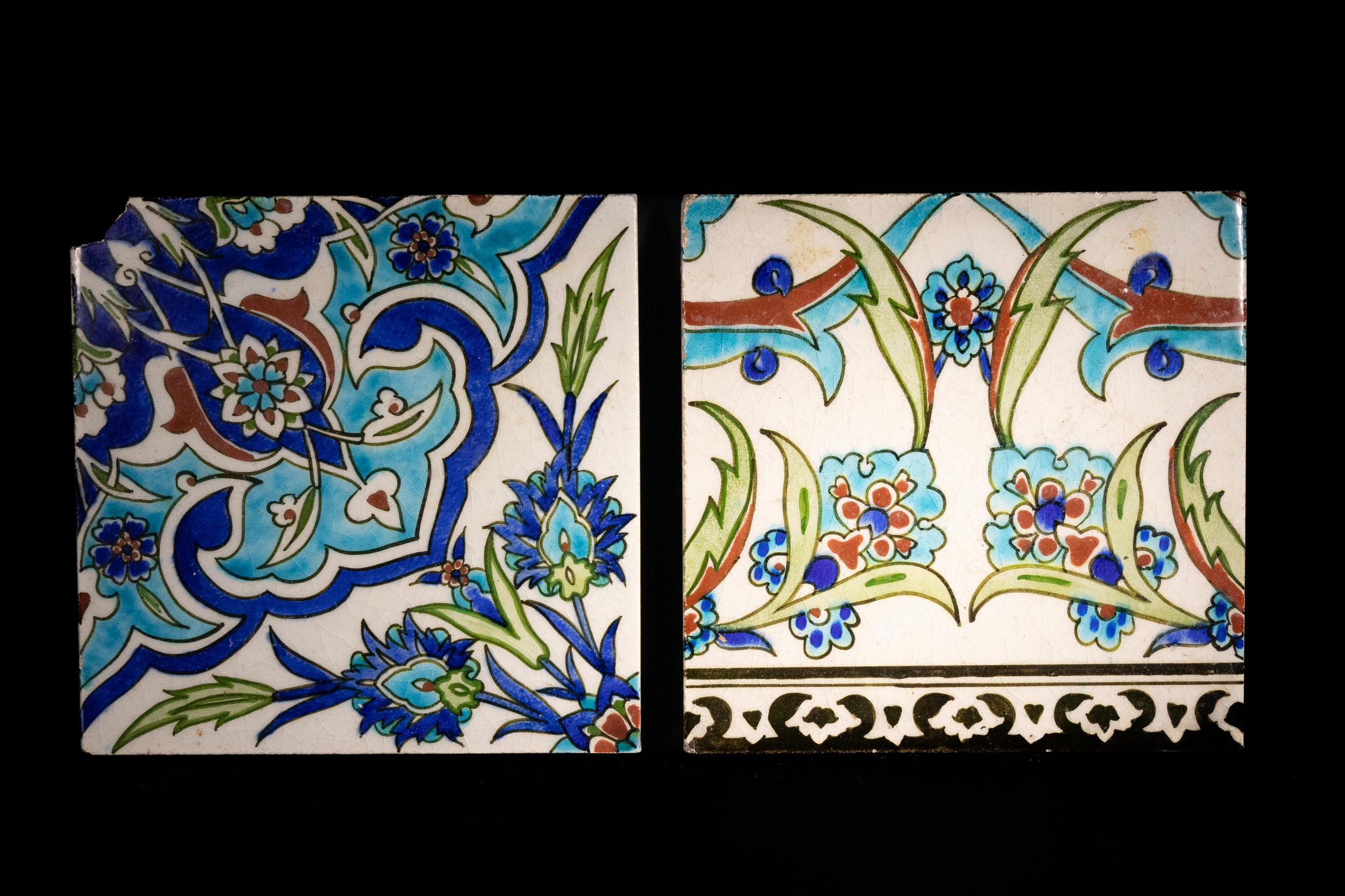 A Lot of Two Iznik-Style Floral Tiles with Arabesque and Saz Leaf Motifs.