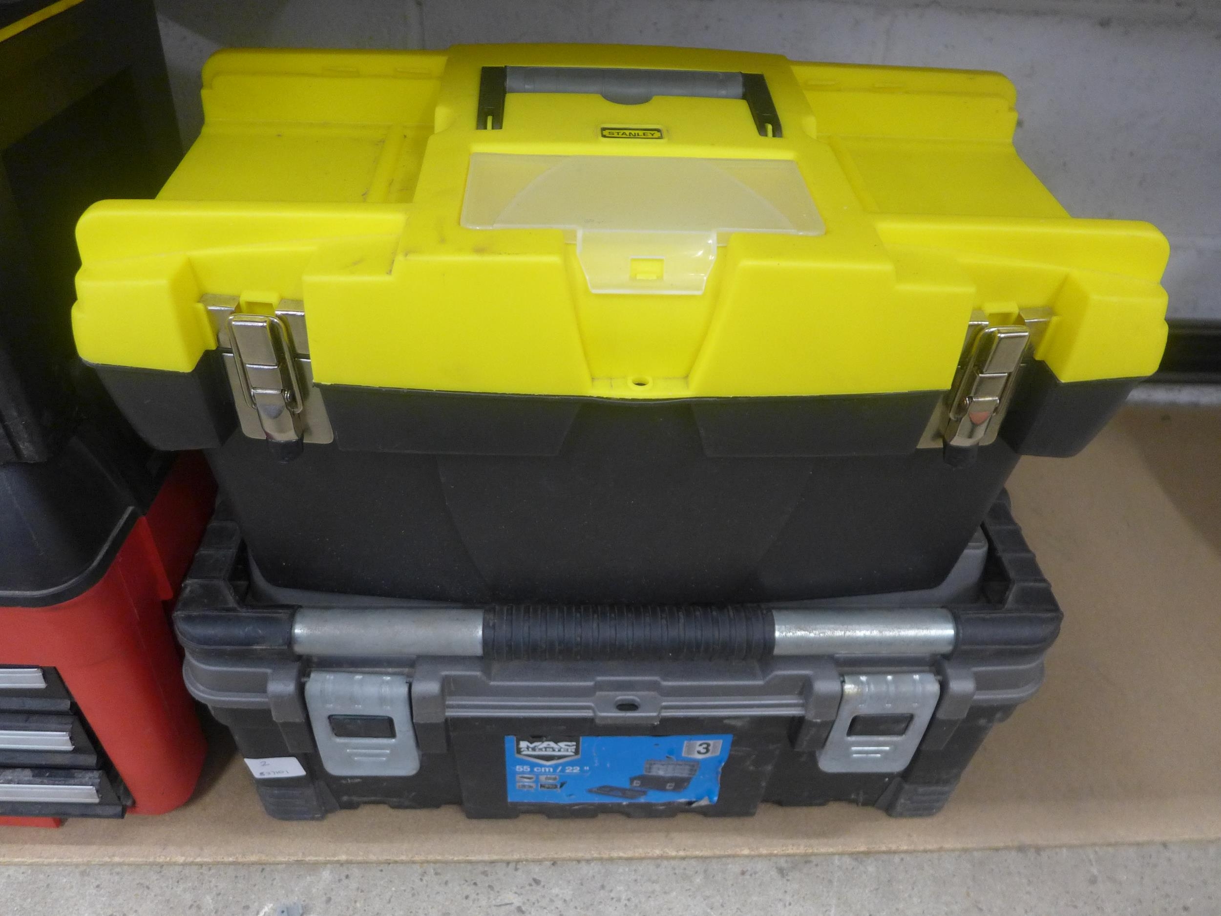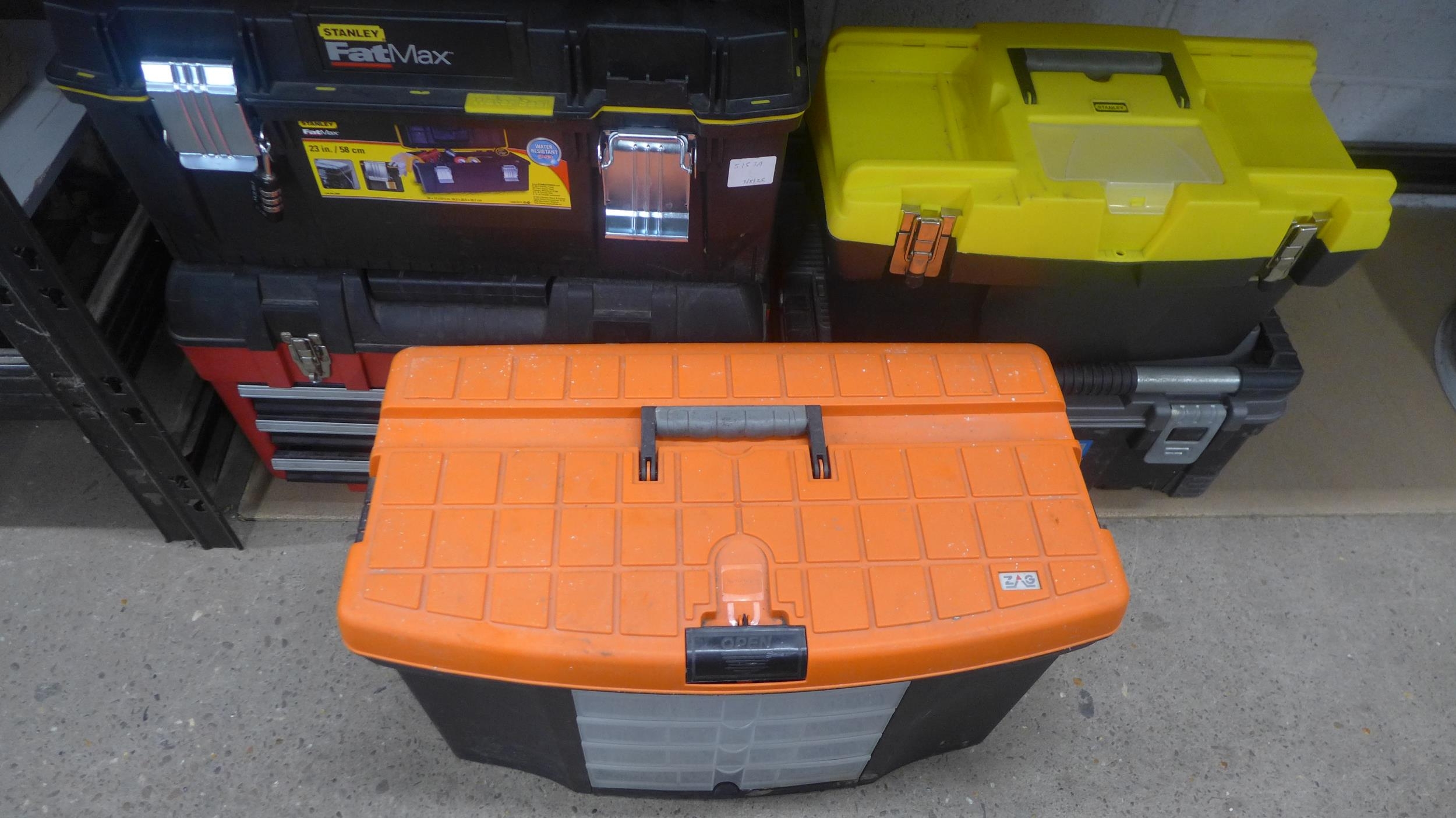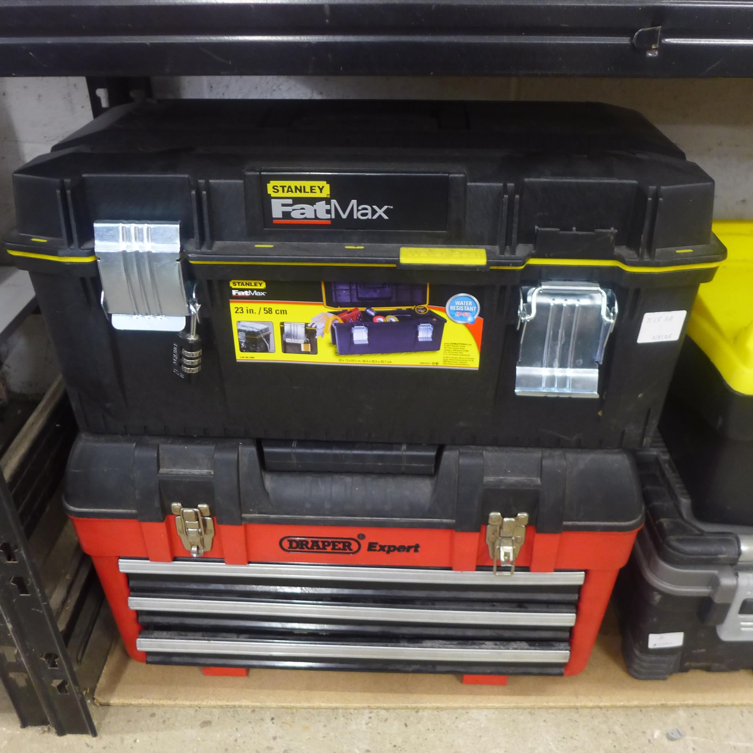 Five various tool boxes including Stanley Fat Max, Draper, Mac Allister and ZAG