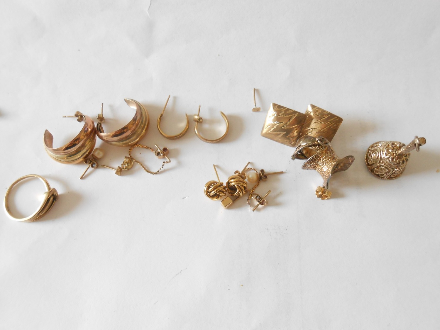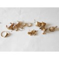 A selection of 9ct. gold earrings, a 9ct. gold buckle form ring and two charms