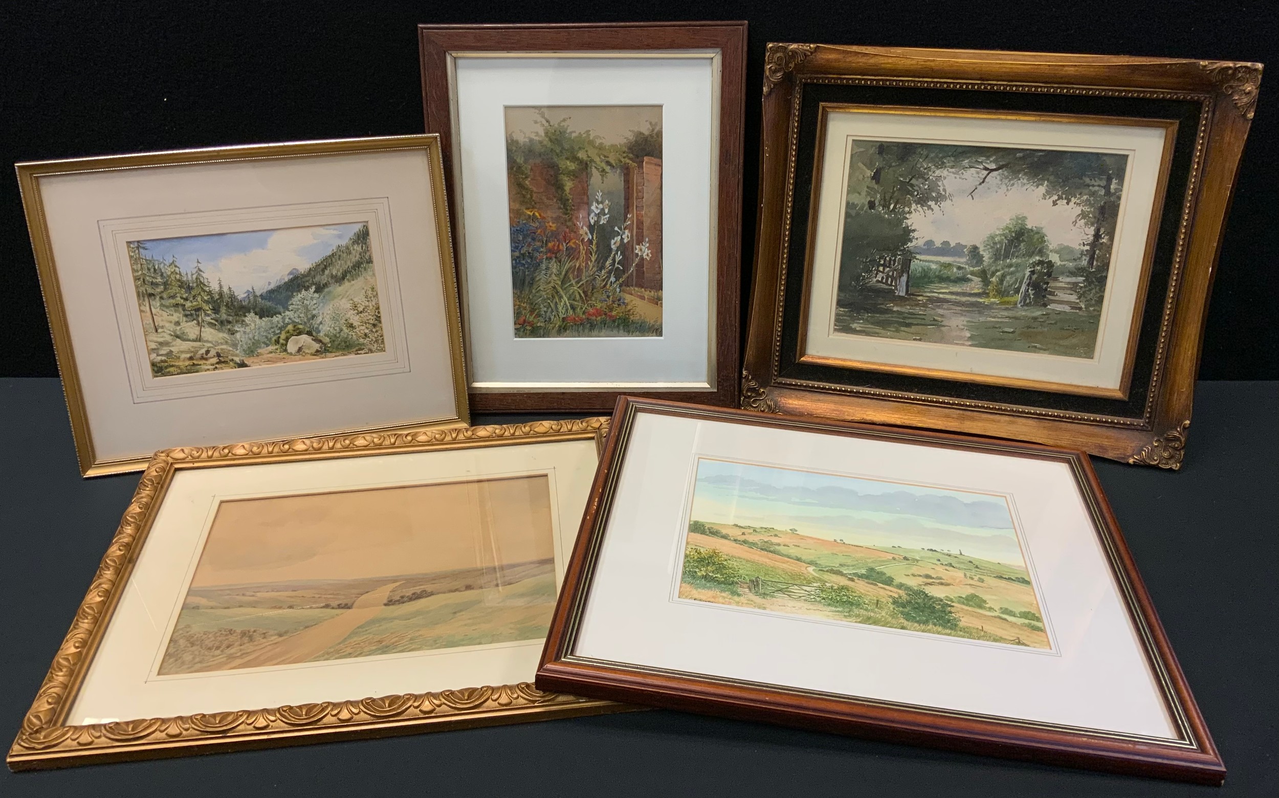 Charles C Smith, Werneth Low, Hyde, Greater Manchester, signed, watercolour, 19cm x 26.5cm; G Carrington, Looking Across the Plains, signed, 20cm x 28cm; Walled Garden in Bloom, unsigned, water colour, 23cm x 15cm etc (5)
