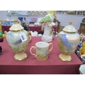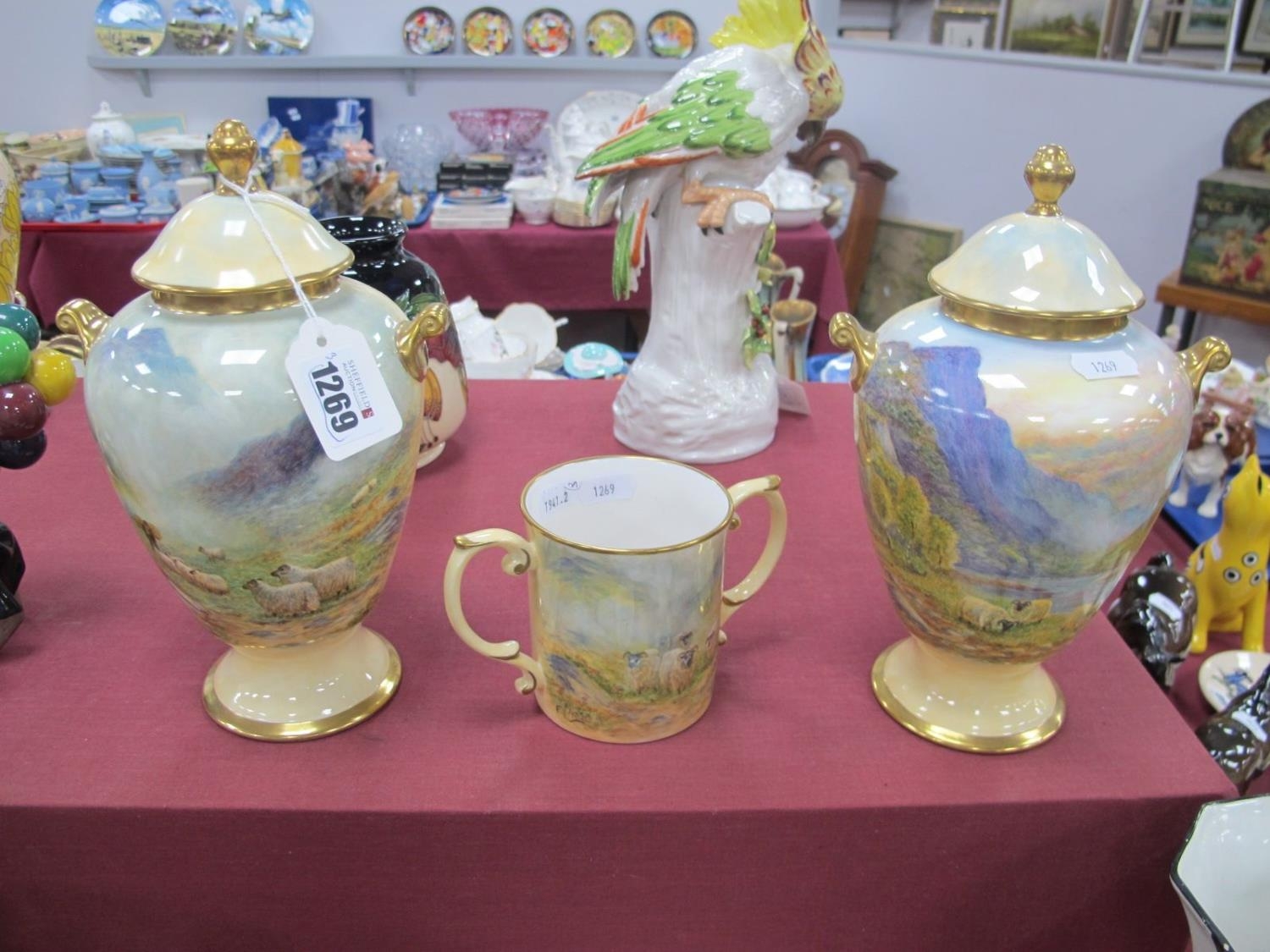 A Royal Worcester Style Twin Handled Vase and Cover, signed F. Clark to underside, handpainted with a moorland scene with shepherd and sheep in foreground, 23cm high; another similarly painted and a a twin handled cup. (3)