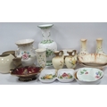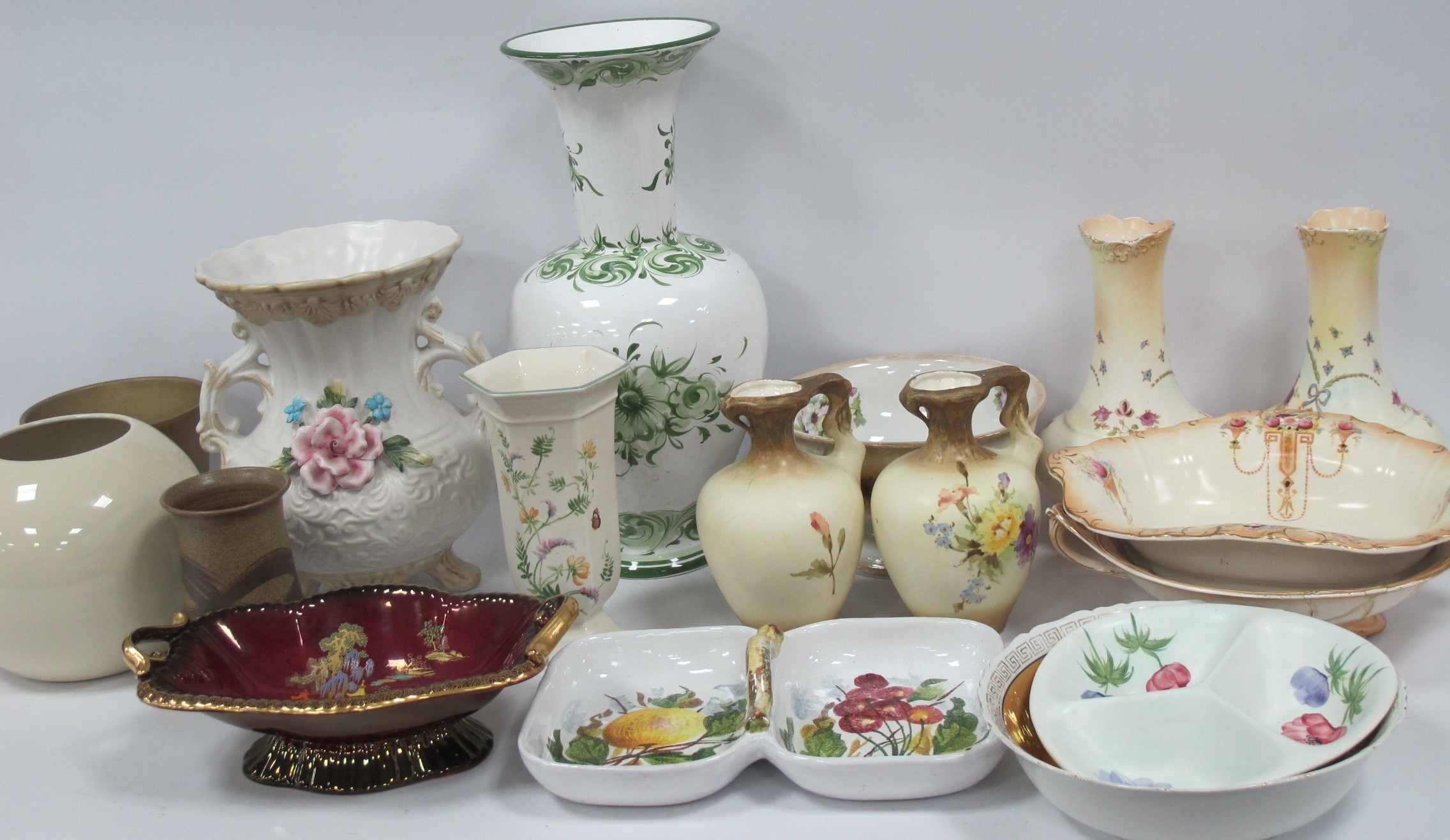 Ceramics, including Italian Capodimonte twin-handle flower relief vase (H26cm), Portuguese hand painted vase (H39cm), pair of Crown Devon floral vases and "Fieldings" red lustre dish and assorted jugs, large bowls etc. Two boxes.