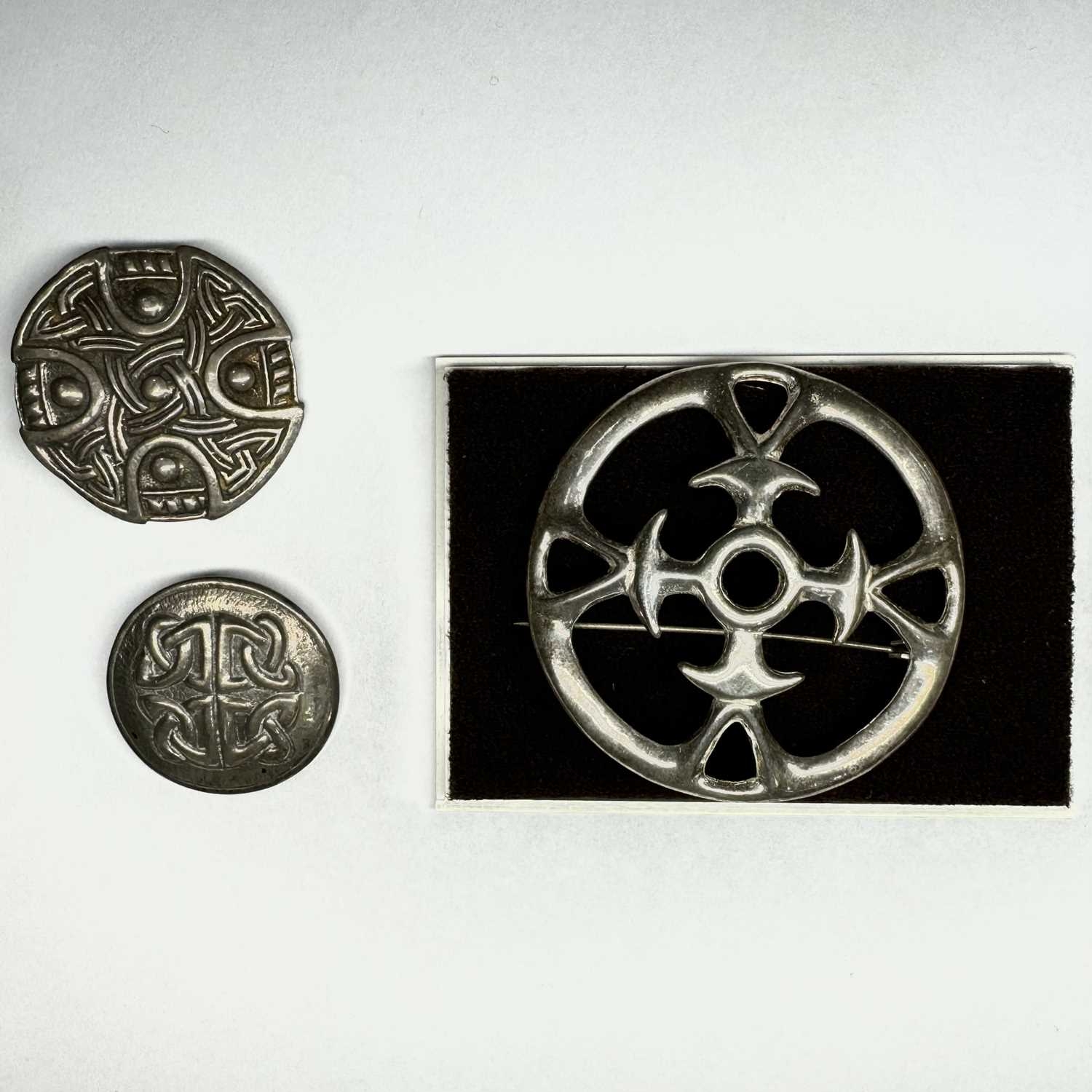 Three silver brooches, to include a Finnish Kalevala Koru Heporisti brooch, a Scottish Iona brooch by Ian McCormick and a third example, total weight 42.7g