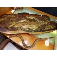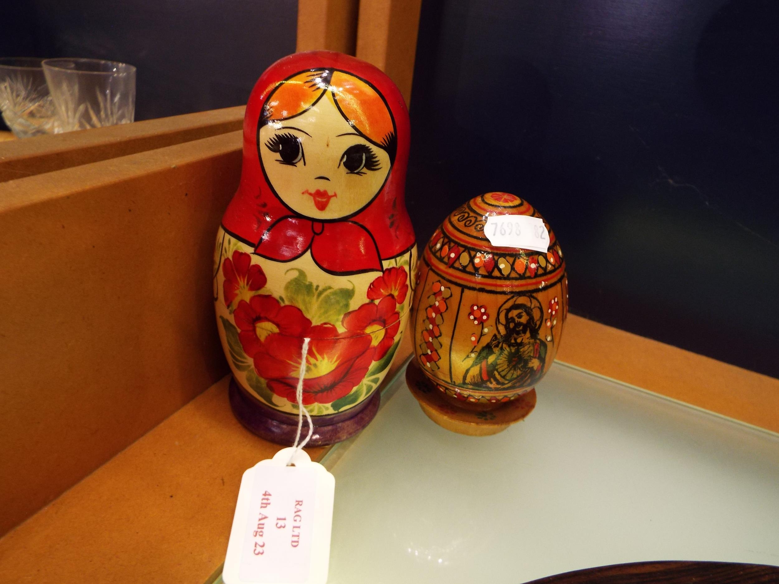 A set of seven Russian Matryoshka dolls together with a religious icon egg resting on stand