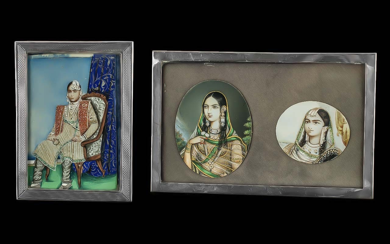Three Antique Indian Portrait Miniatures, depicting princesses, housed in two silver frames. Largest image size 80 x 55 mm.