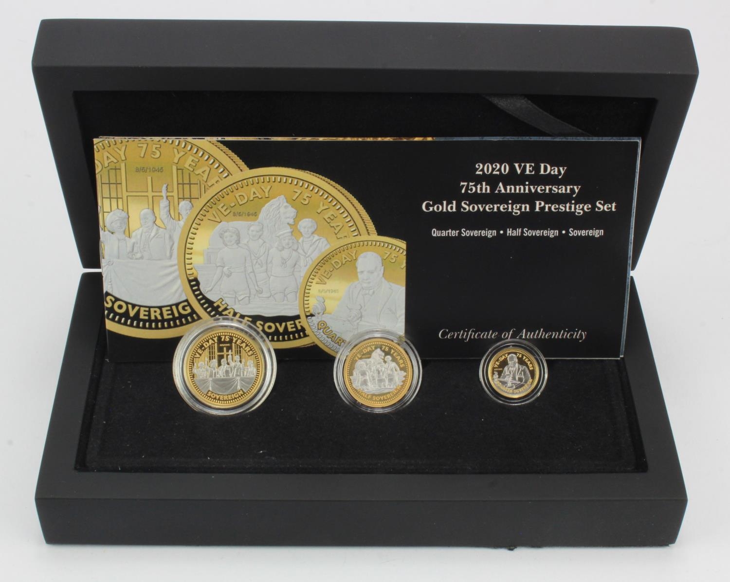 Tristan Da Cunha Three coin gold set 2020 (Sovereign, Half Sovereign & Quarter Sovereign) "VE 75th Anniversary". FDC boxed as issued