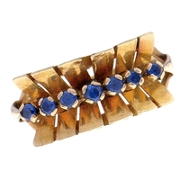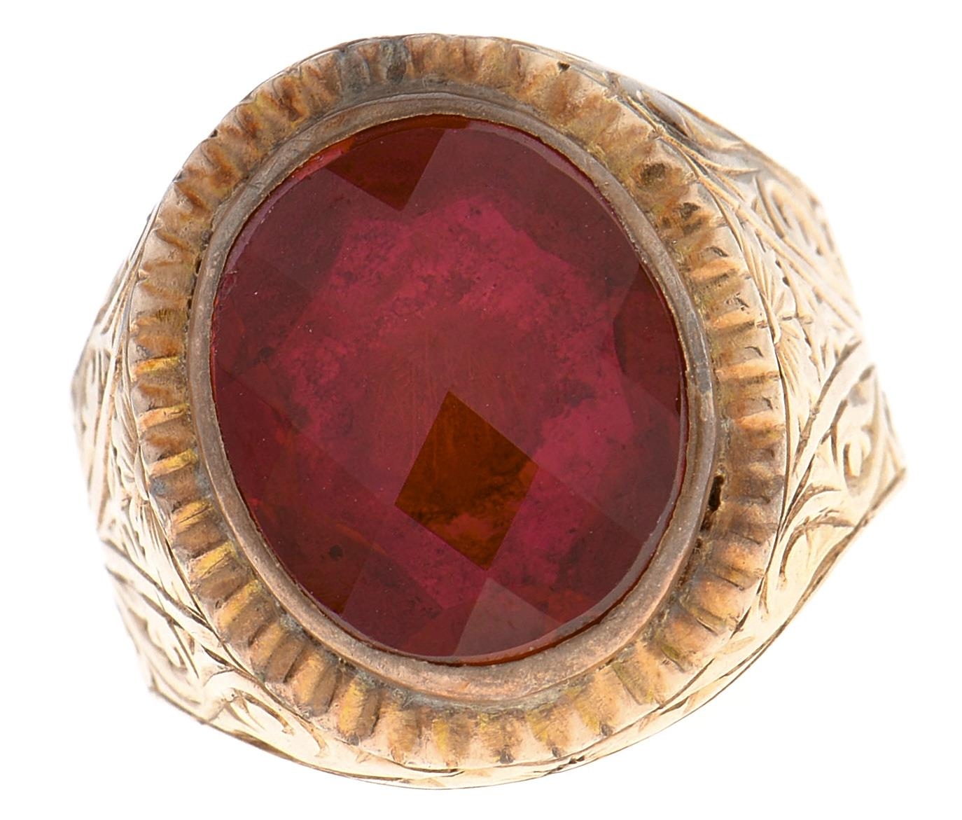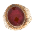 A synthetic ruby ring, engraved and fluted gold band, 6.5g, size K½