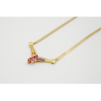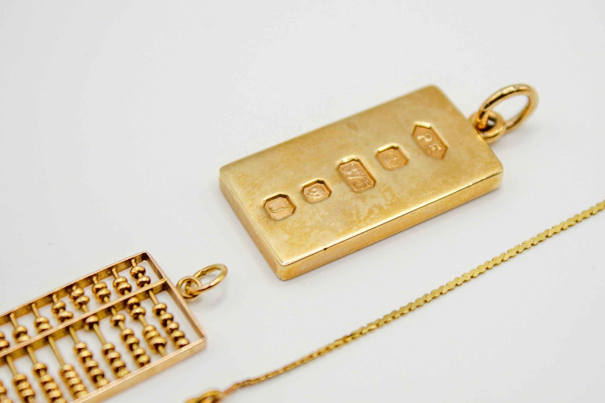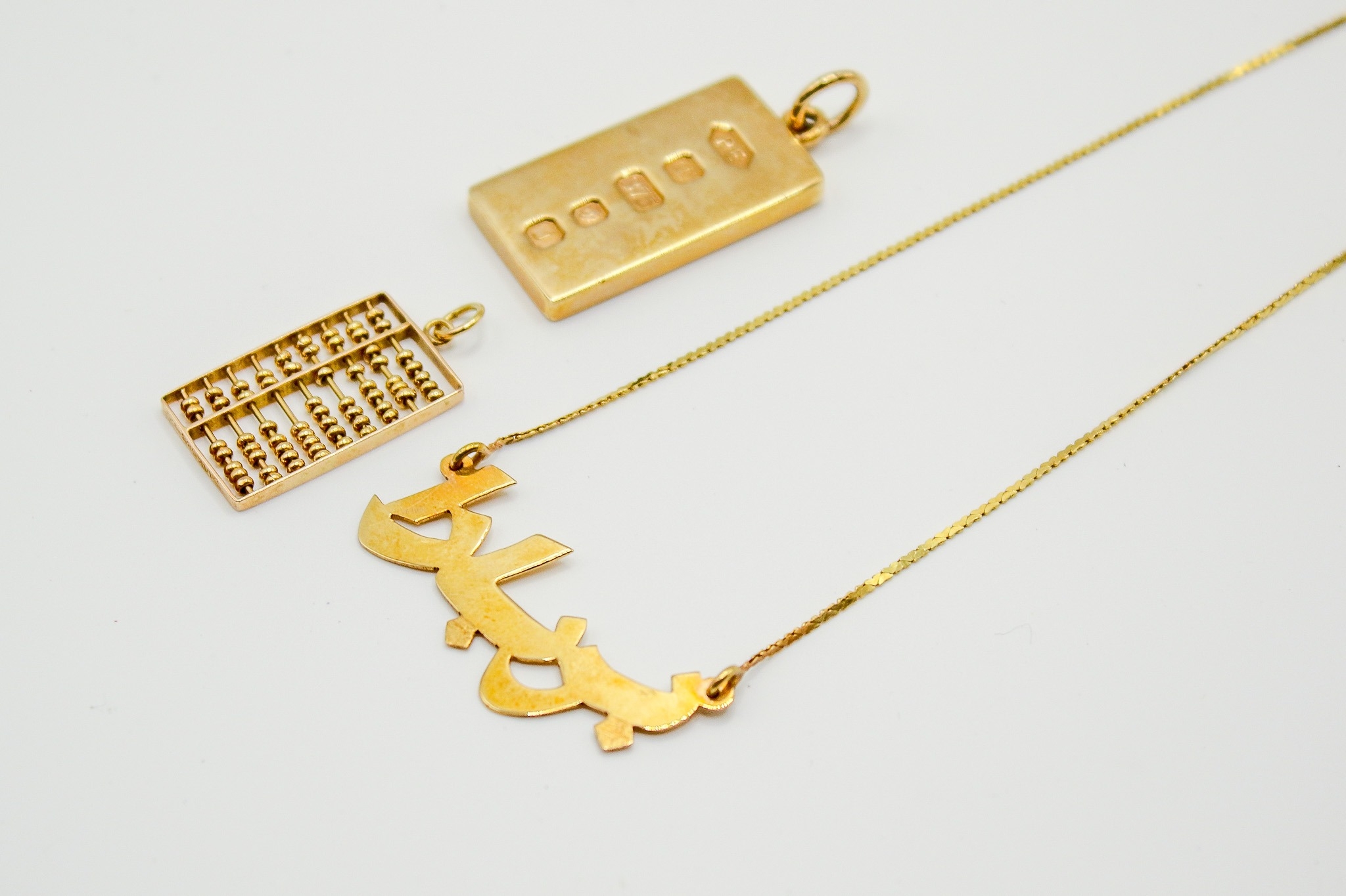 Three gold and yellow metal pendants and necklace. Including a hallmarked 9ct gold ingot, weight 15.5g; a yellow metal abacus pendant marked 14K 585 and weighing 2.4g; and a yellow metal thin chain marked 750 with Arabic text pendant, this chain and pendant weighing 4.3g.