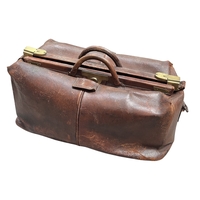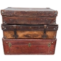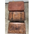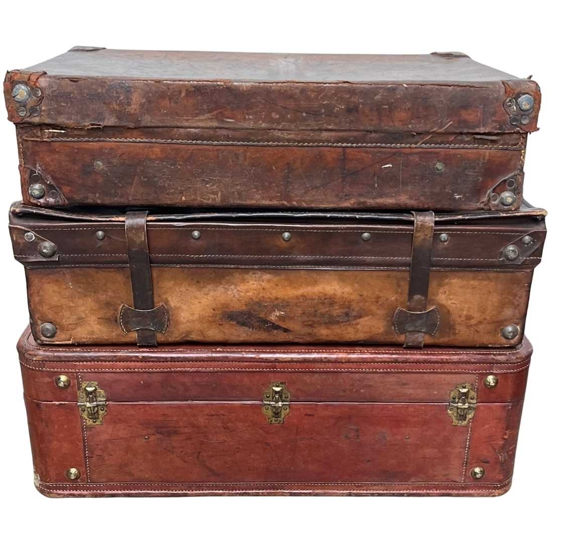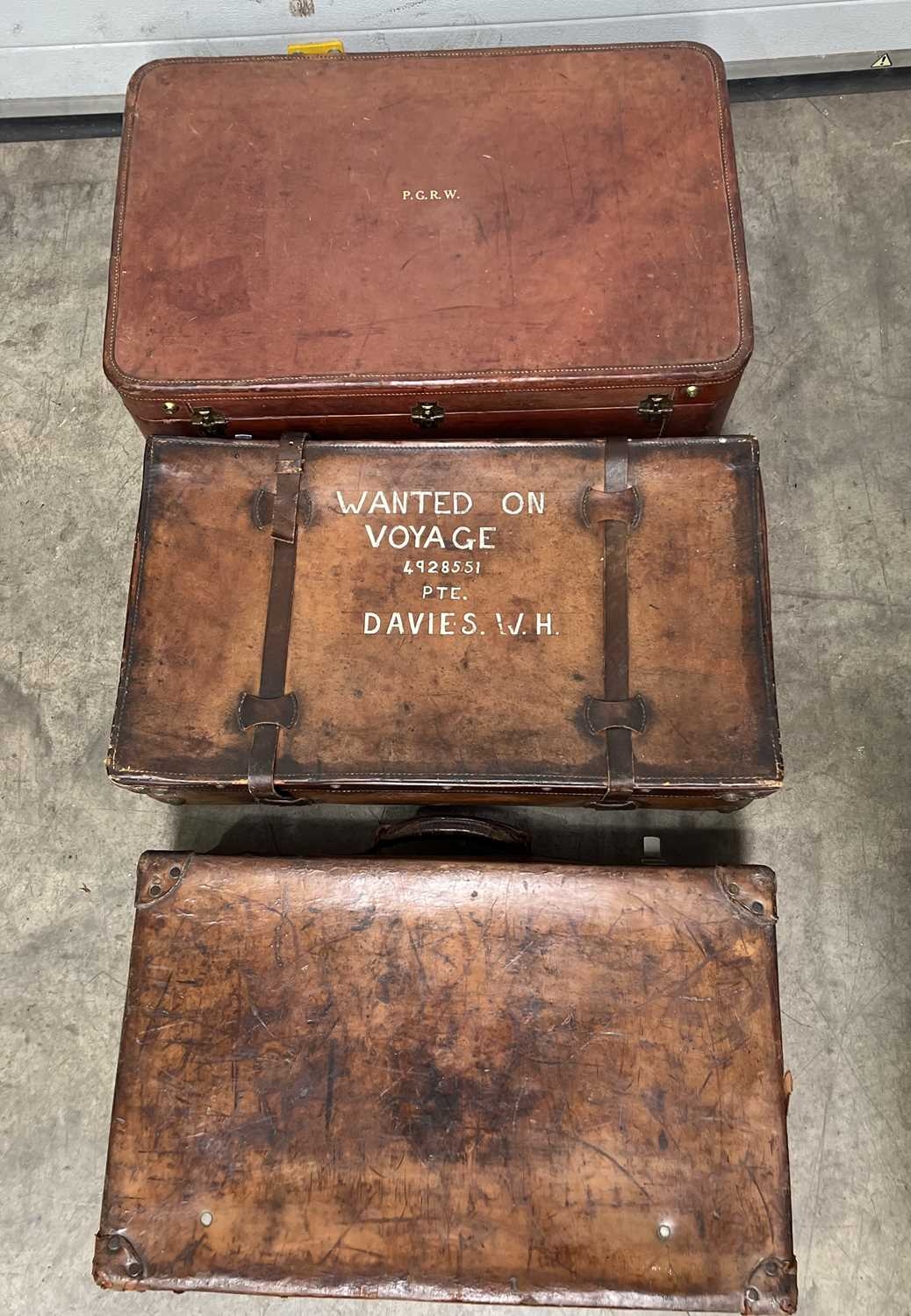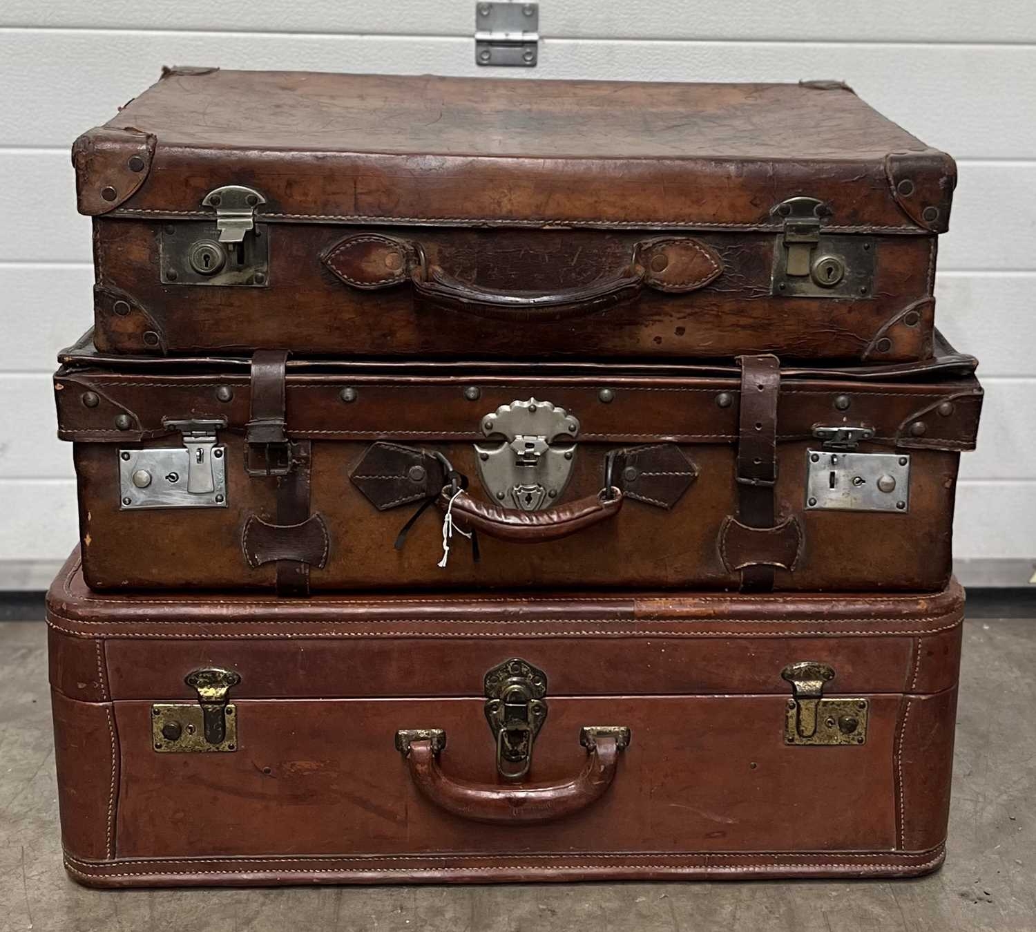 A large brown leather suitcase, brassed fittings and studs for feet, brown silk interior, height approx 25cm, width 74cm, depth 47cm, together with two further brown leather suitcases (3)