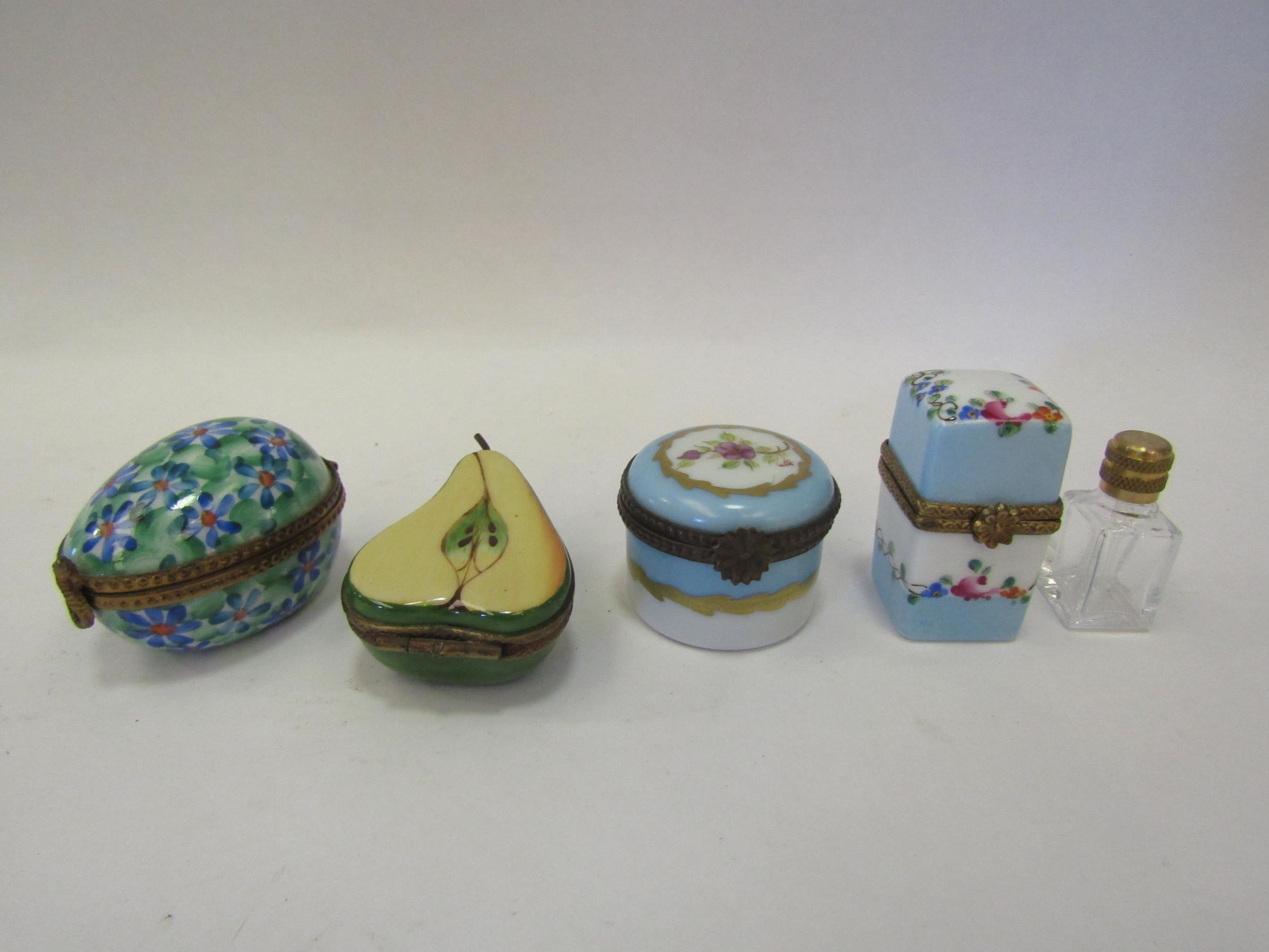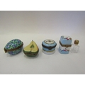 Four Limoges enamel trinket pots including pear and egg shaped, one including a scent bottle