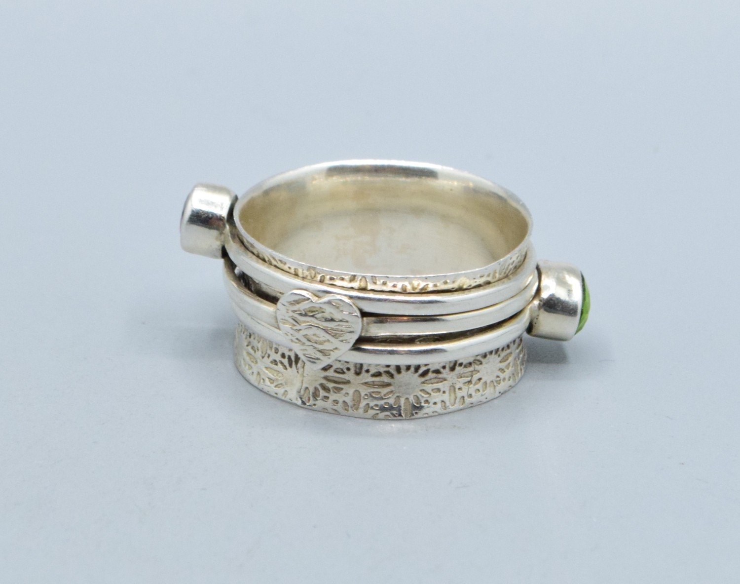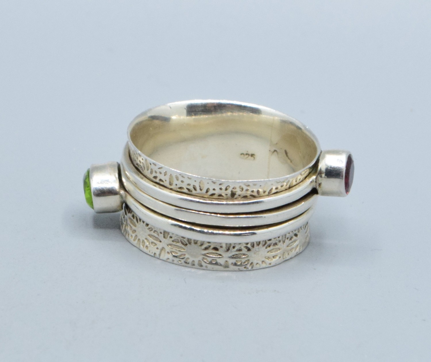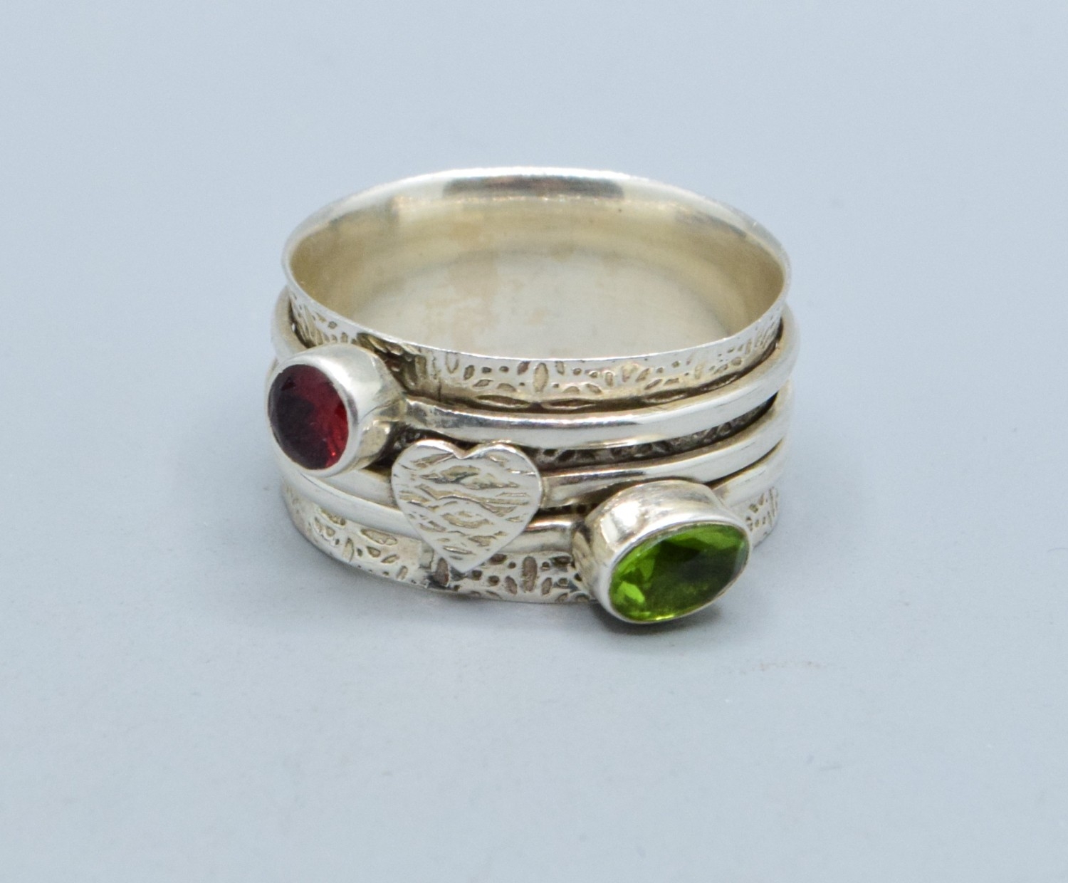 925 silver ladies triple slider design ring showing Peridot and Garnet with a heart making the third one size W