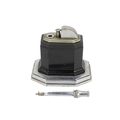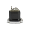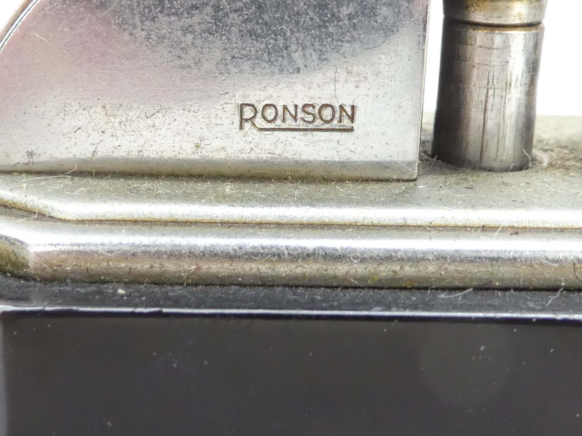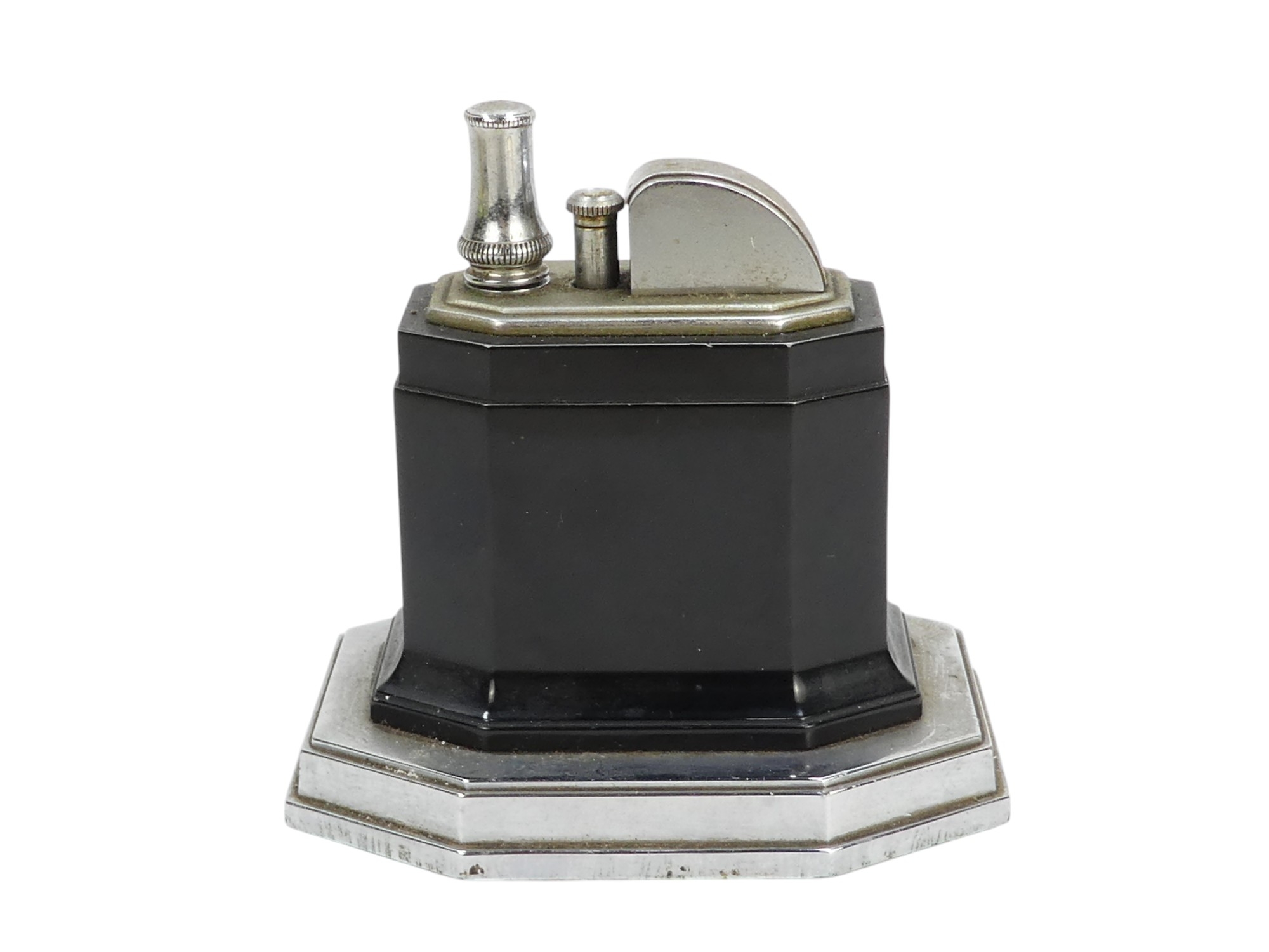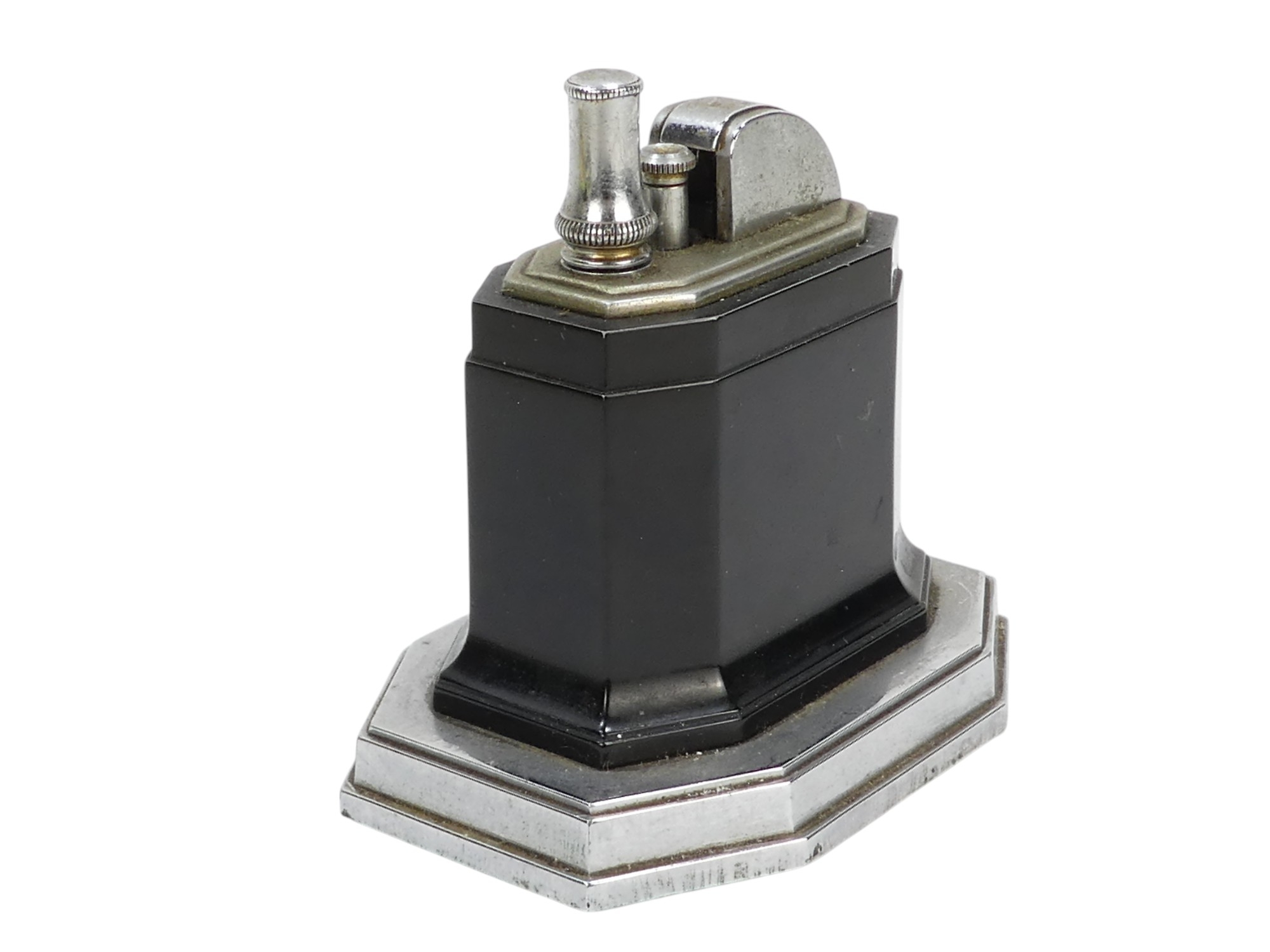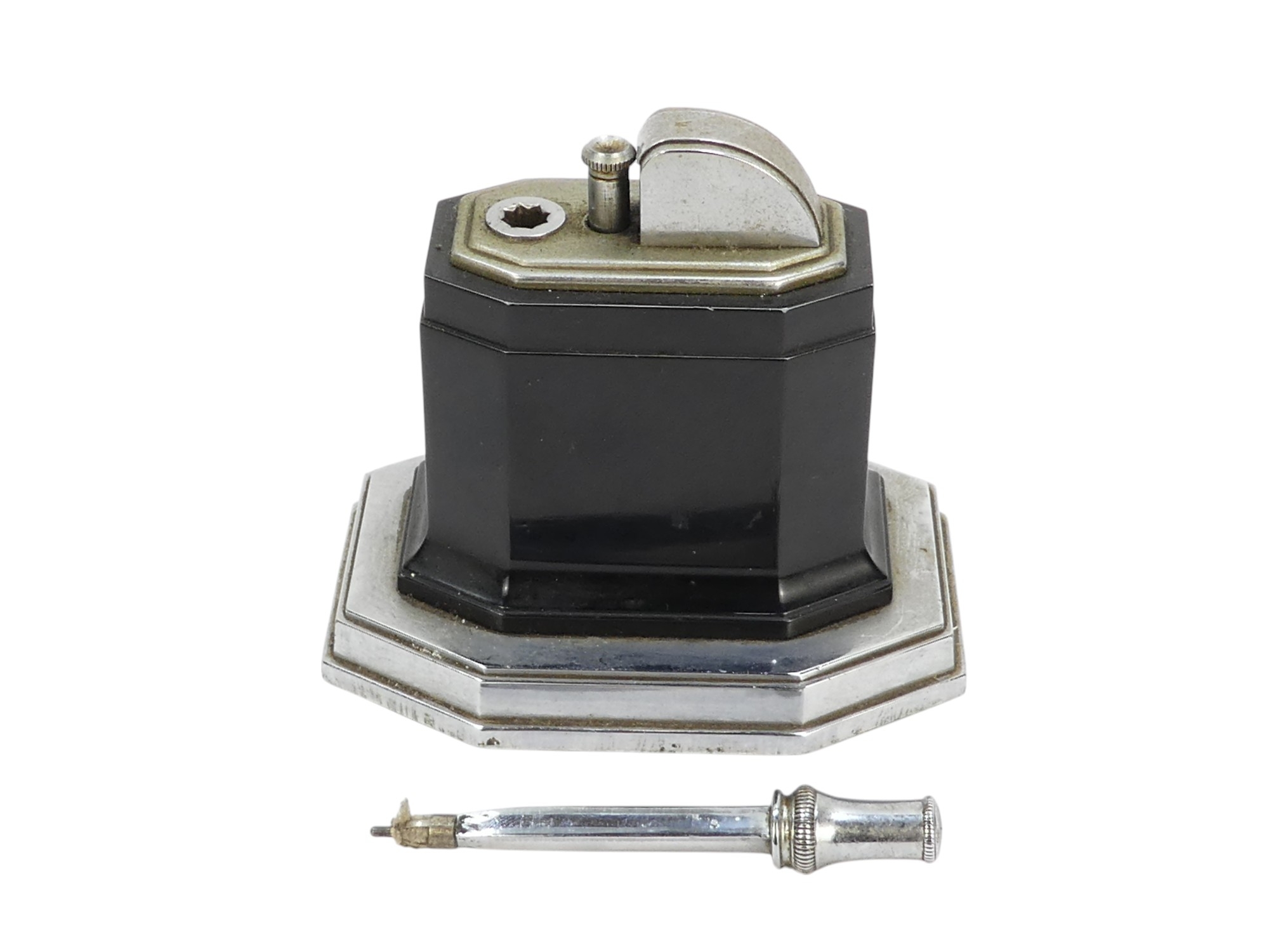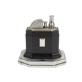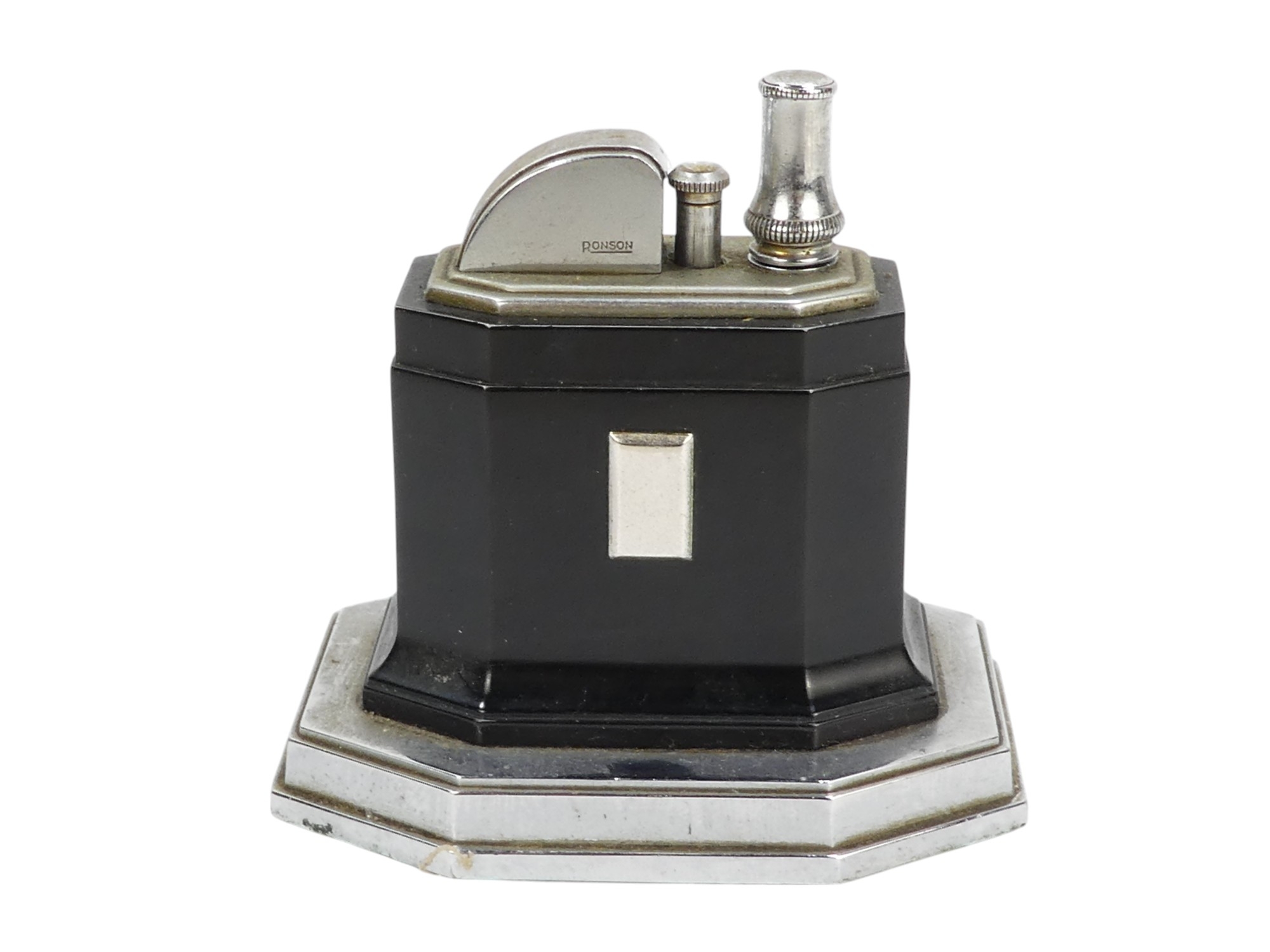 A Ronson Octete touch-tip table lighter - chrome and Bakelite, rectangular with canted corners, 9cm wide.