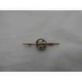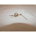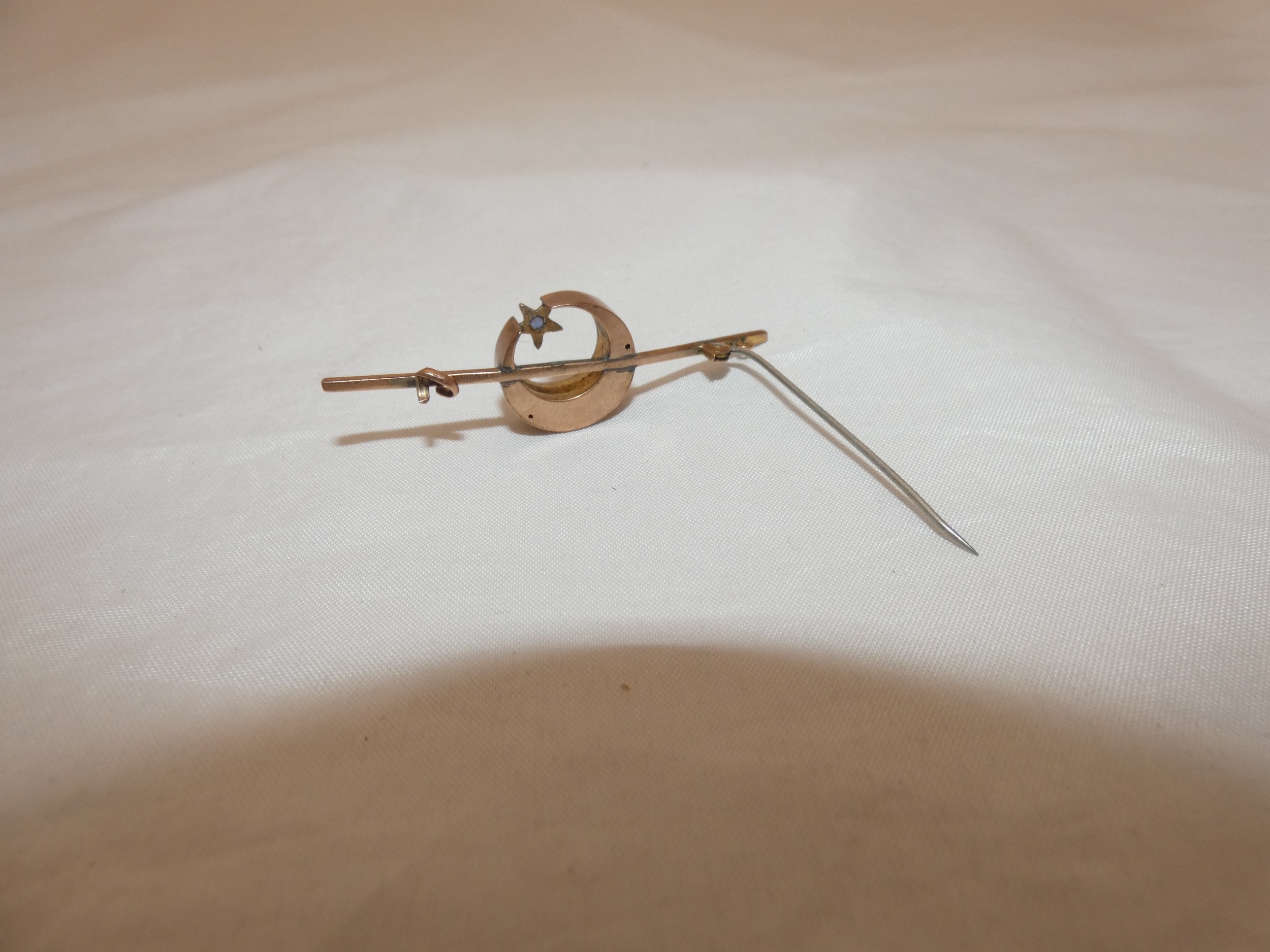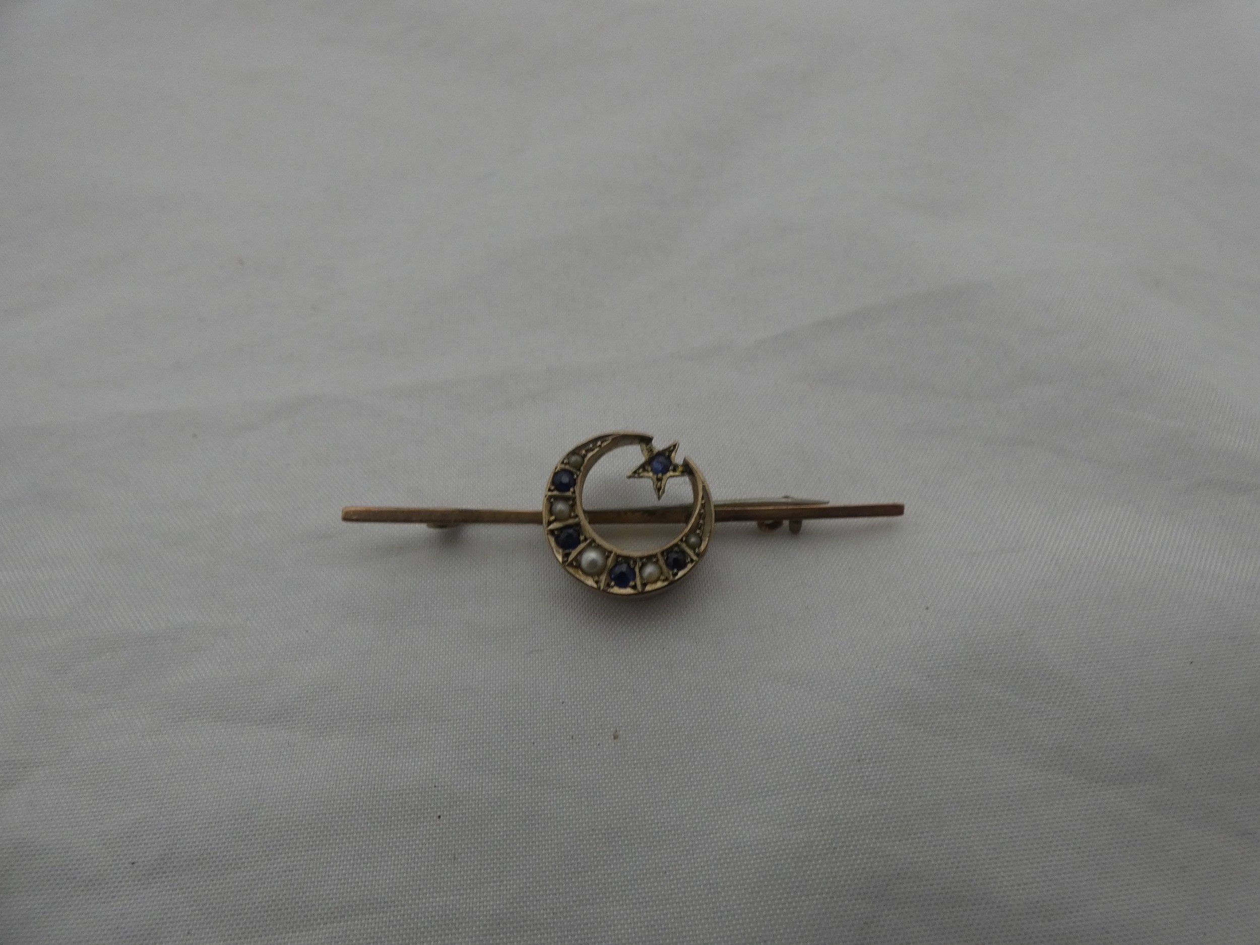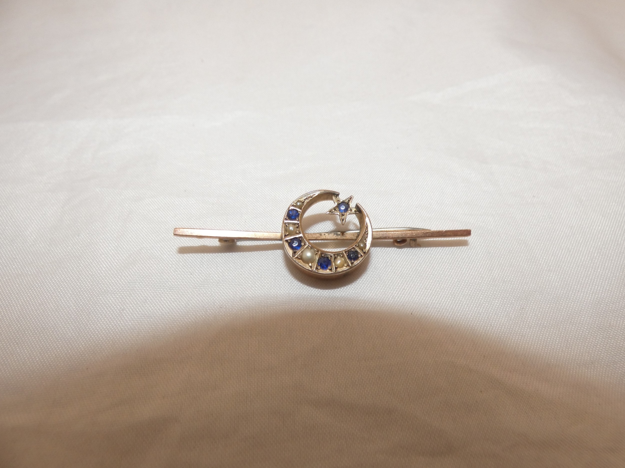 Late Victorian sapphire and seed pearl crescent brooch on unmarked yellow metal.