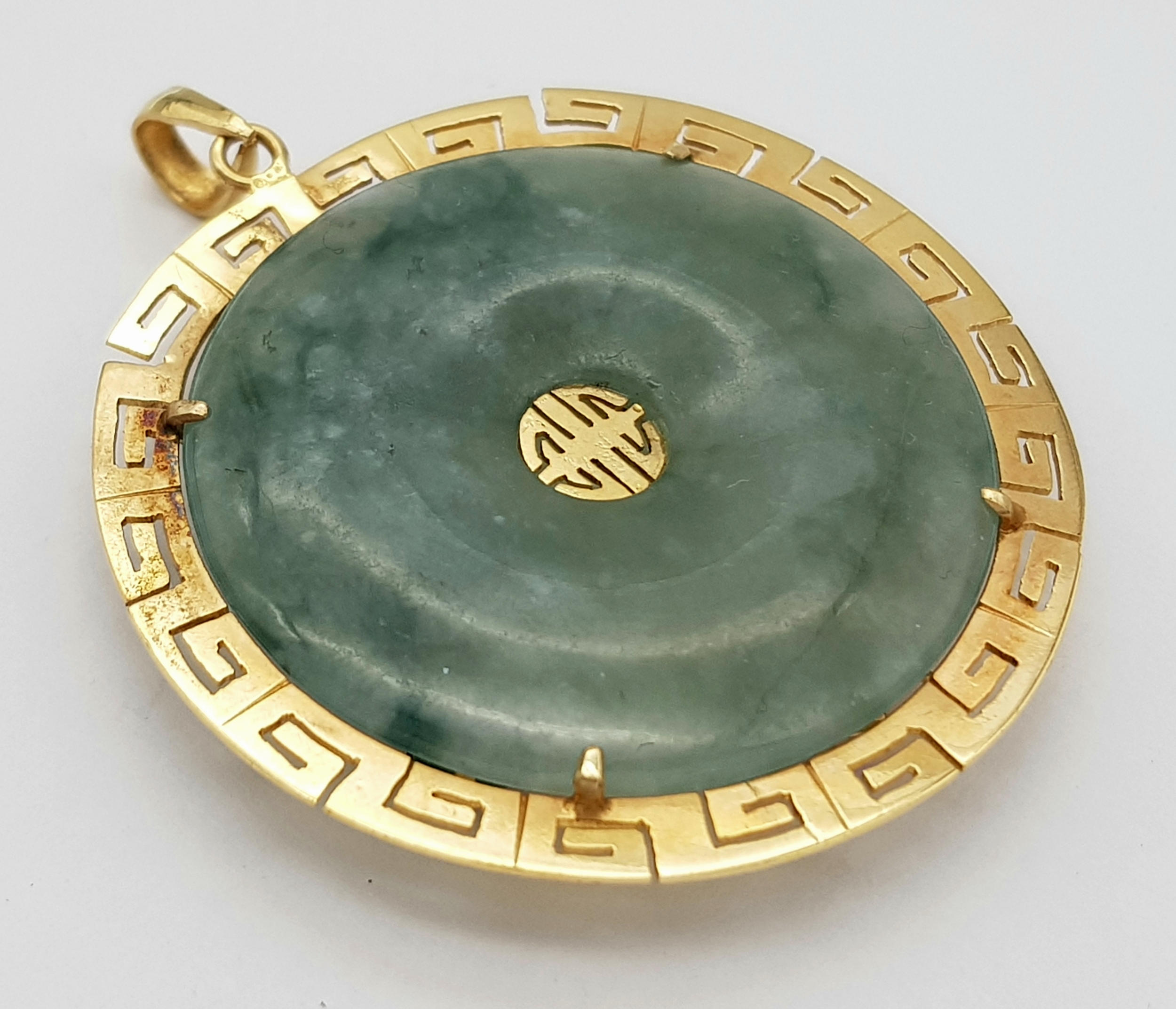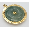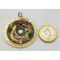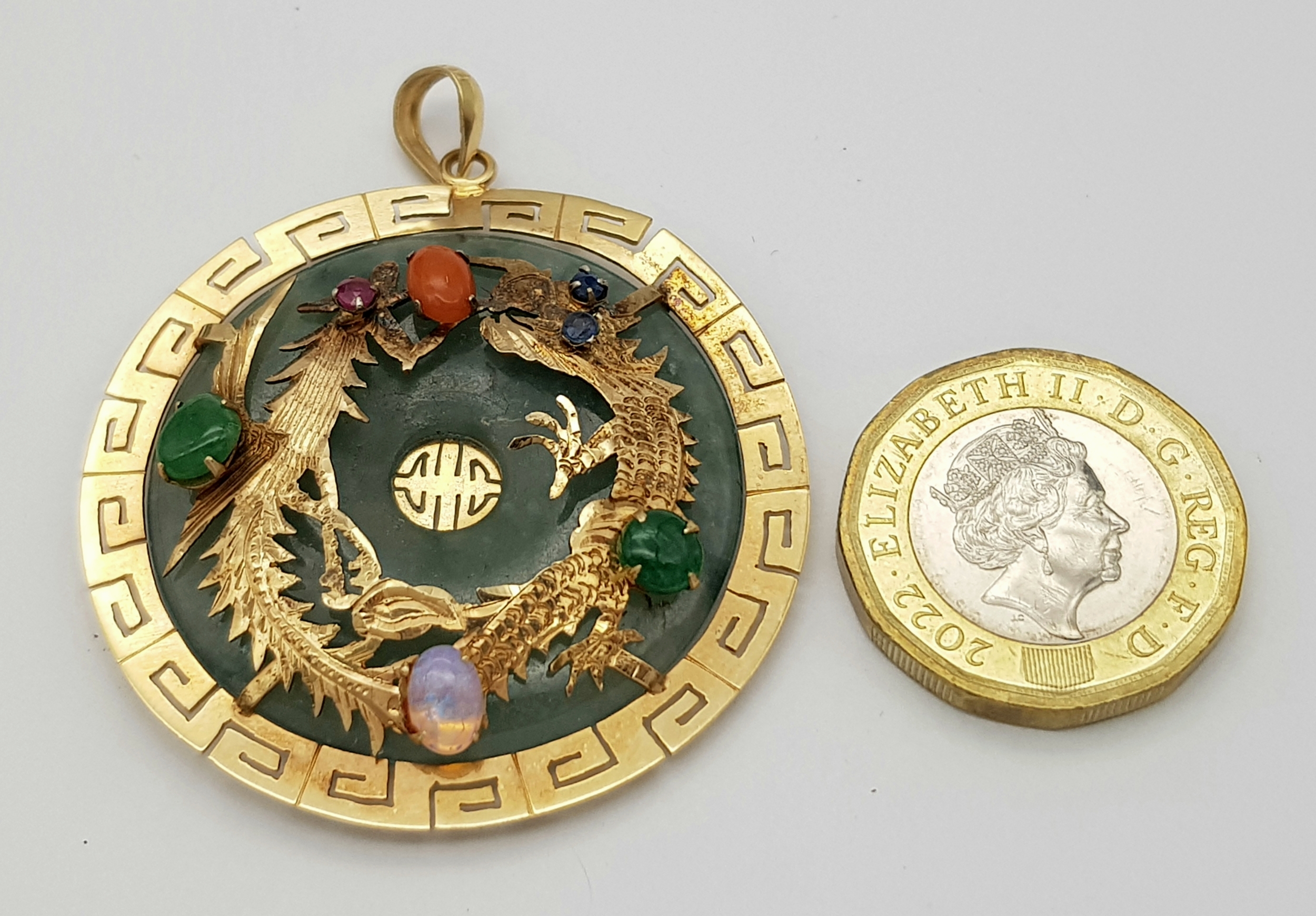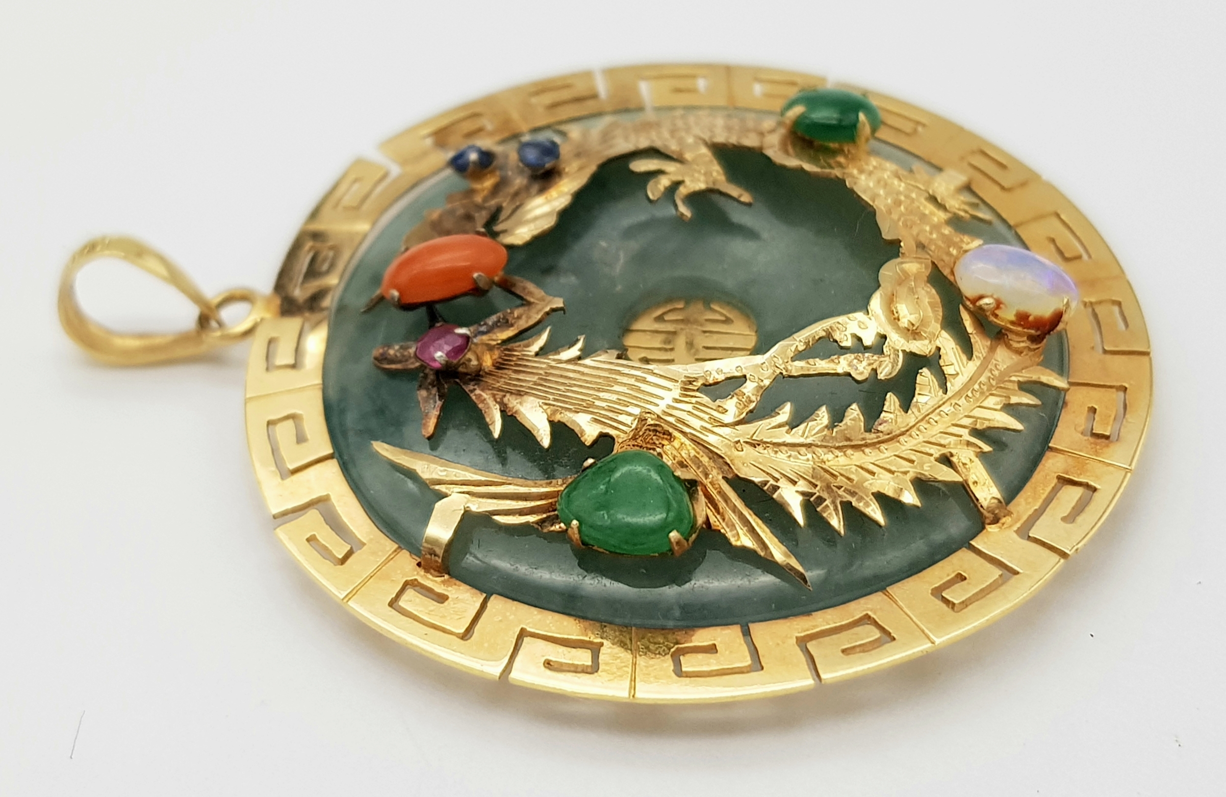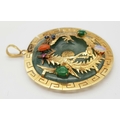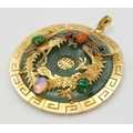 An Antique Chinese Gold and Jade Double Dragon Gem-set Pendant. Greek key decorative border. Stones include opal, coral and jade. 4cm diameter. NS11. 15.44g total weight.