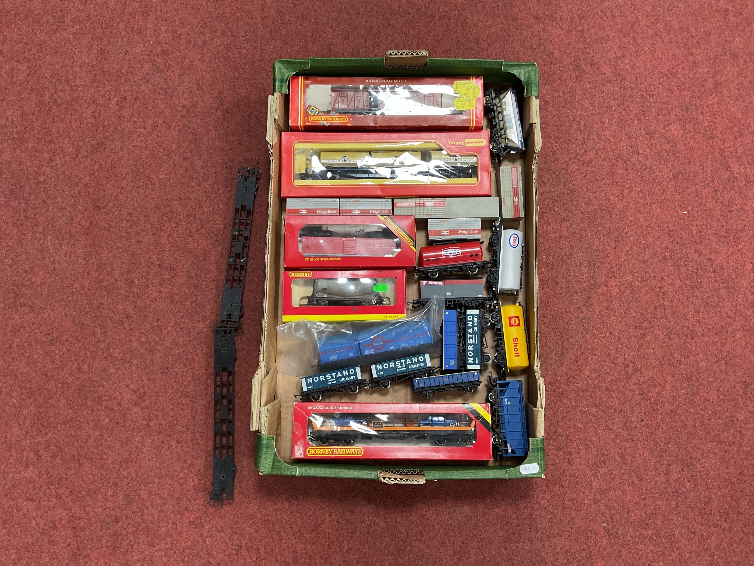 Eighteen 00 gauge modern image wagons (including five boxed) by Hornby and others, including three container flats and nine containers, playworn.