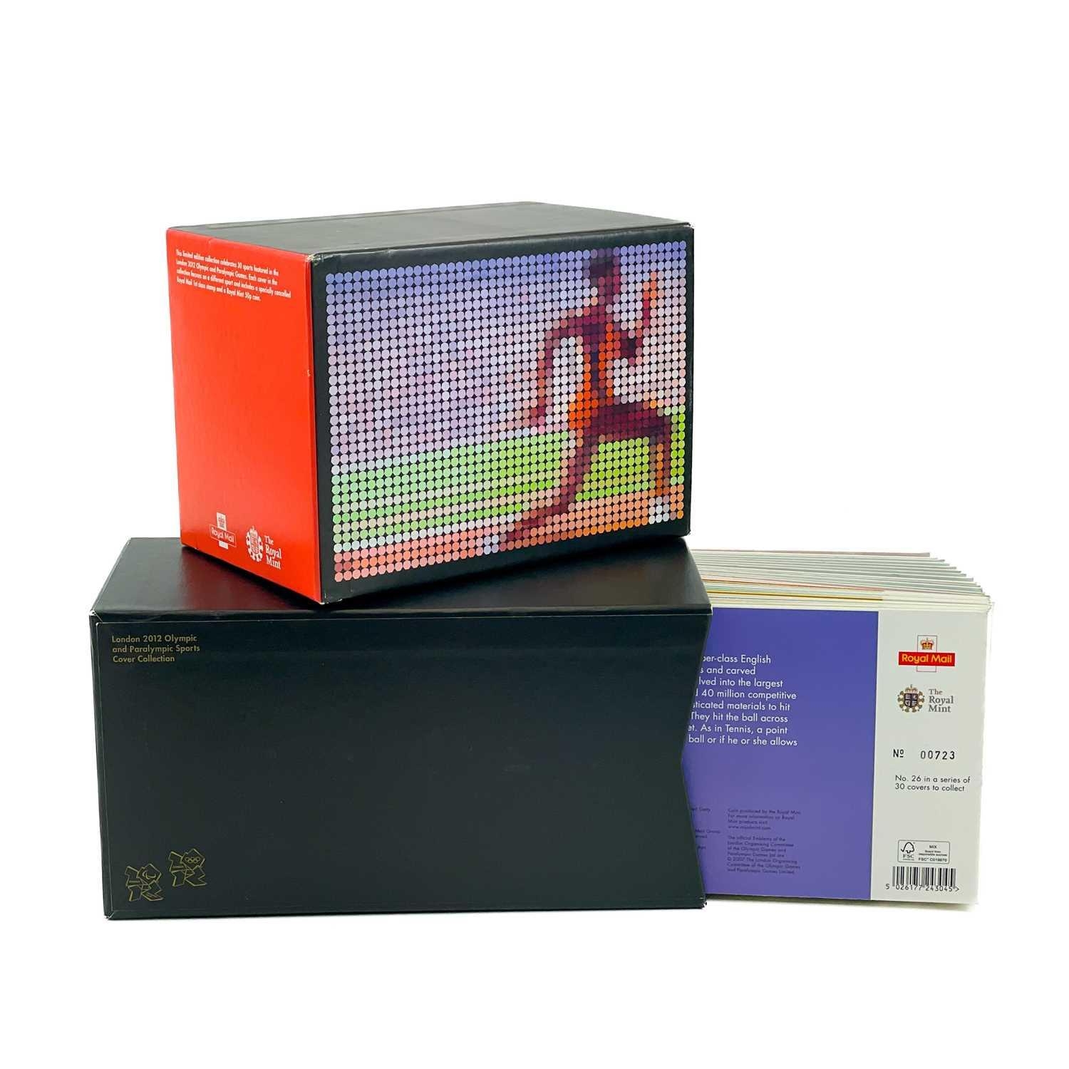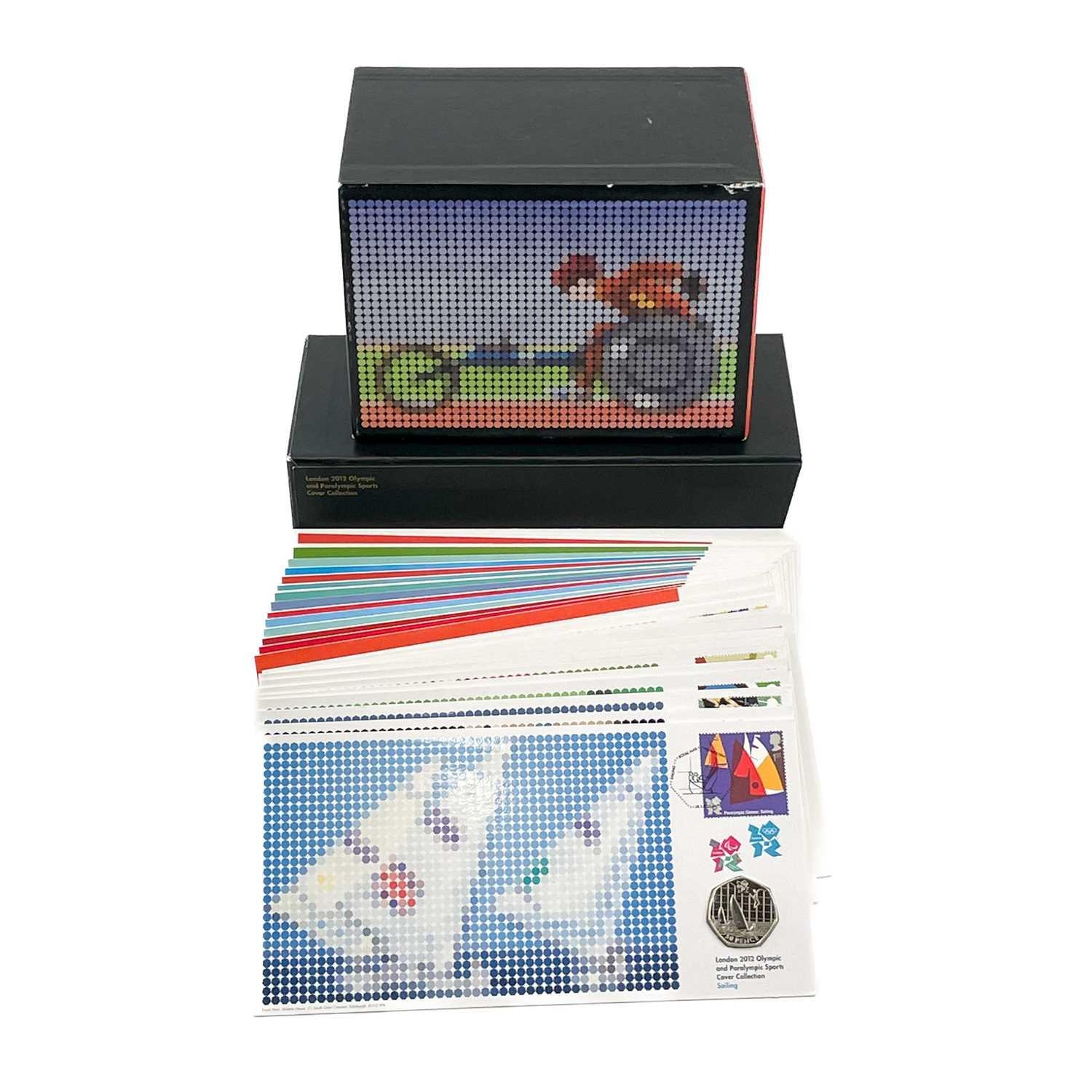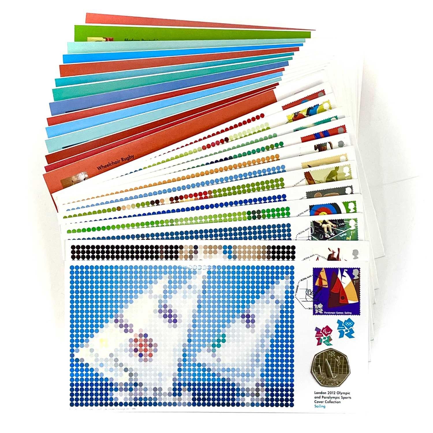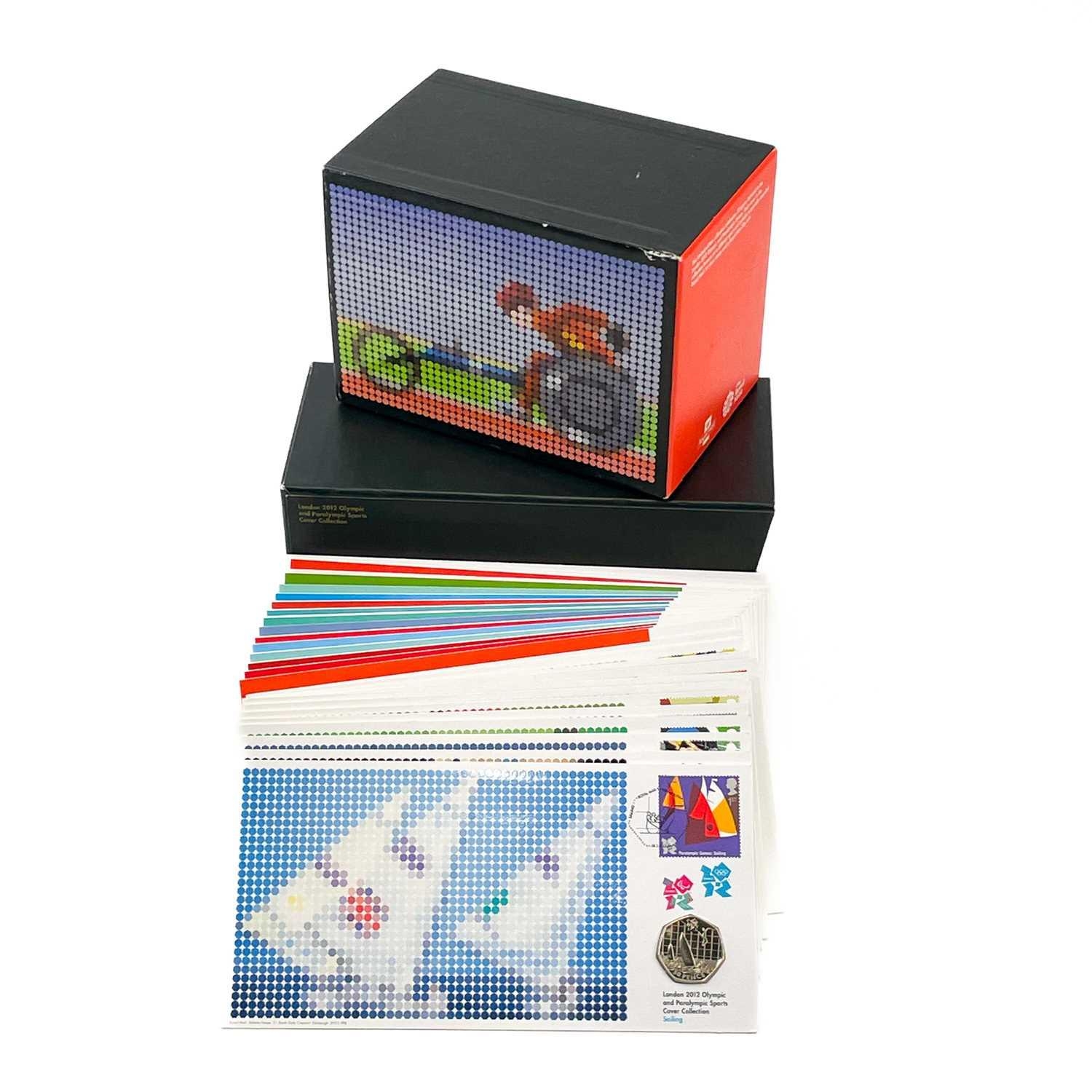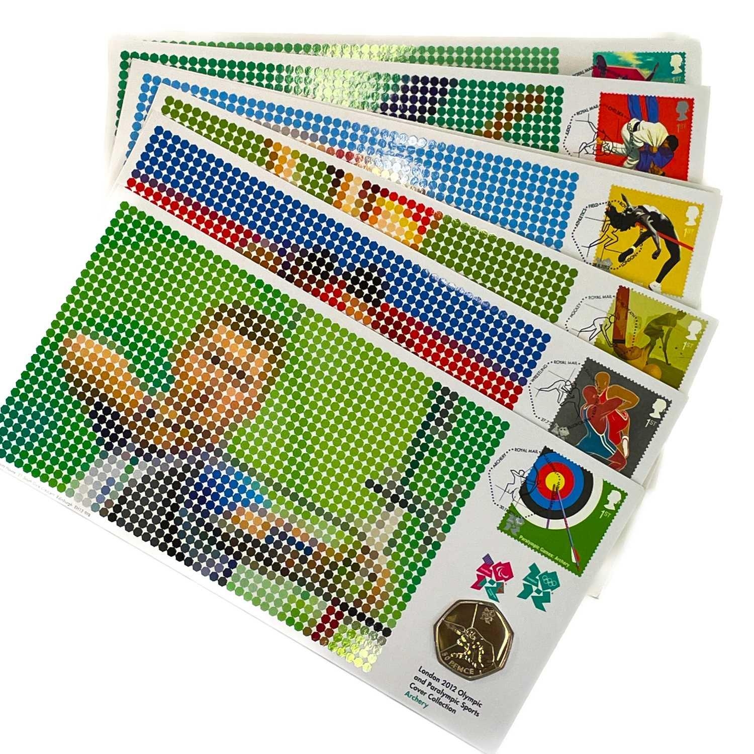 UK 50 pence 2012 Olympics Royal Mail/Royal Mint Uncirculated 50p sorts collection (29 coin covers) A boxed limited edition of 29 stamped coin covers. Each cover focuses on a different sport and includes a specially cancelled Royal Mail 1st Class Stamp and a Royal Mint 50p coin. N.B. Outside of box refers to 30 sports but only 29 coin covers are present.