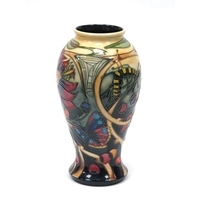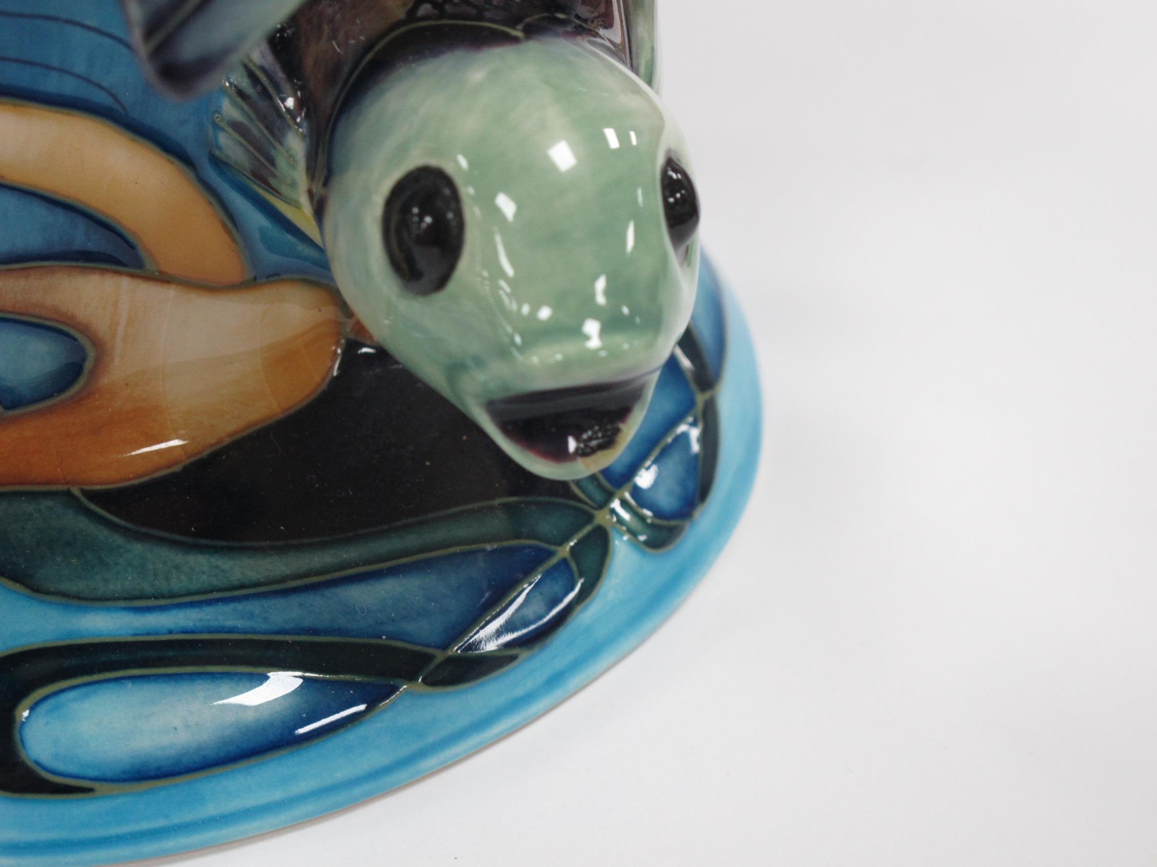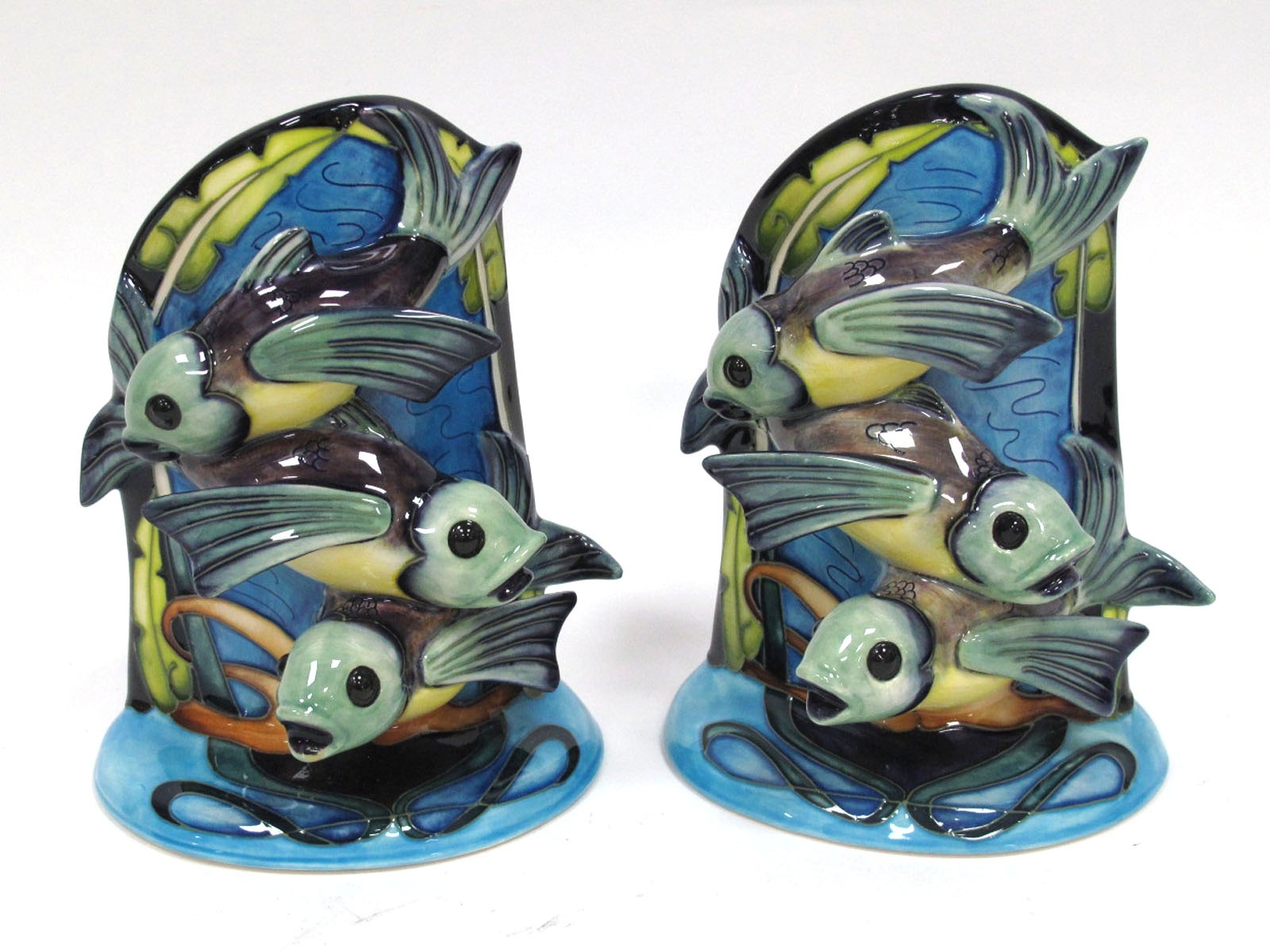 A Pair of Moorcroft Pottery Bookends, each moulded with three swimming fish, the reverse with bullrushes, impressed and printed marks and signatures, dated 2005, 17cm high. (2)