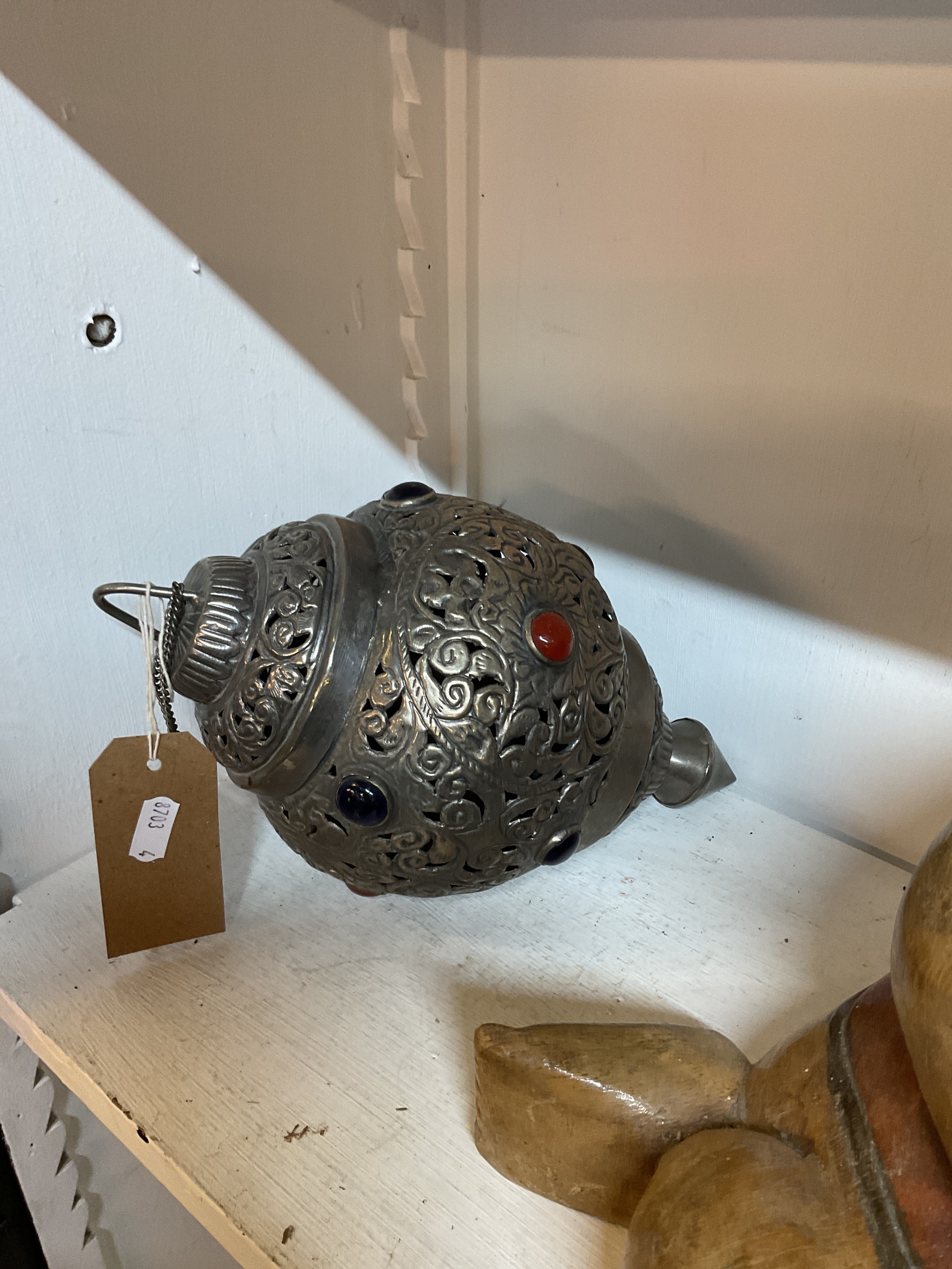 A metal Indian hanging light fitting with pierced decoration and coloured stones