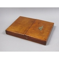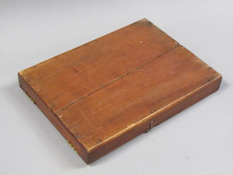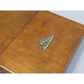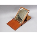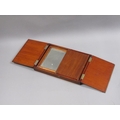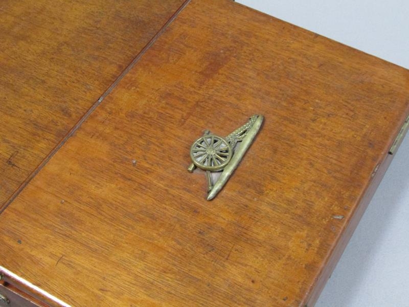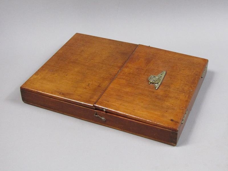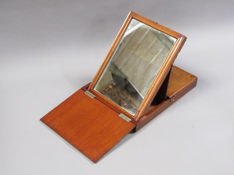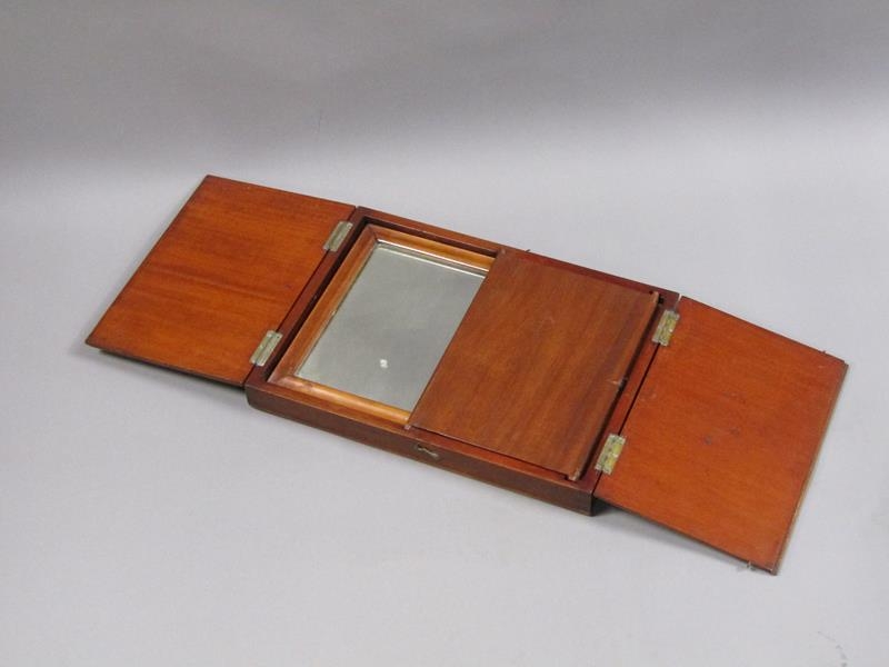 An early 19c Officers campaign folding mirror with a ratchet strut in a mahogany box enclosed by two hinged covers, mirror 38cm x 28cm, box with brass cannon motif, 30cm x 41cm.