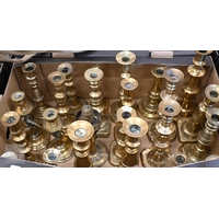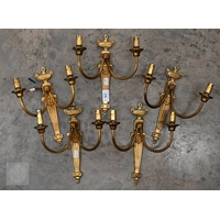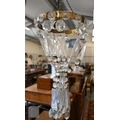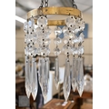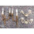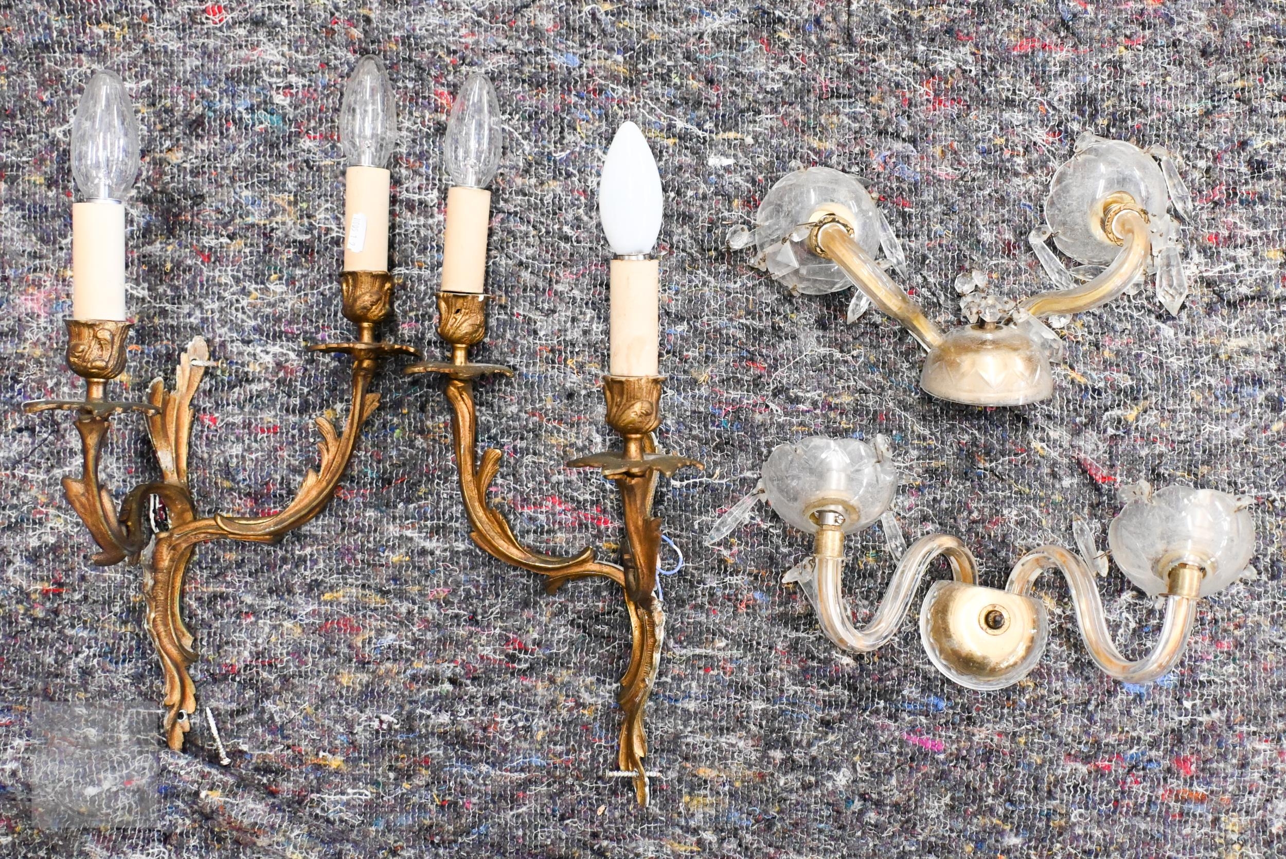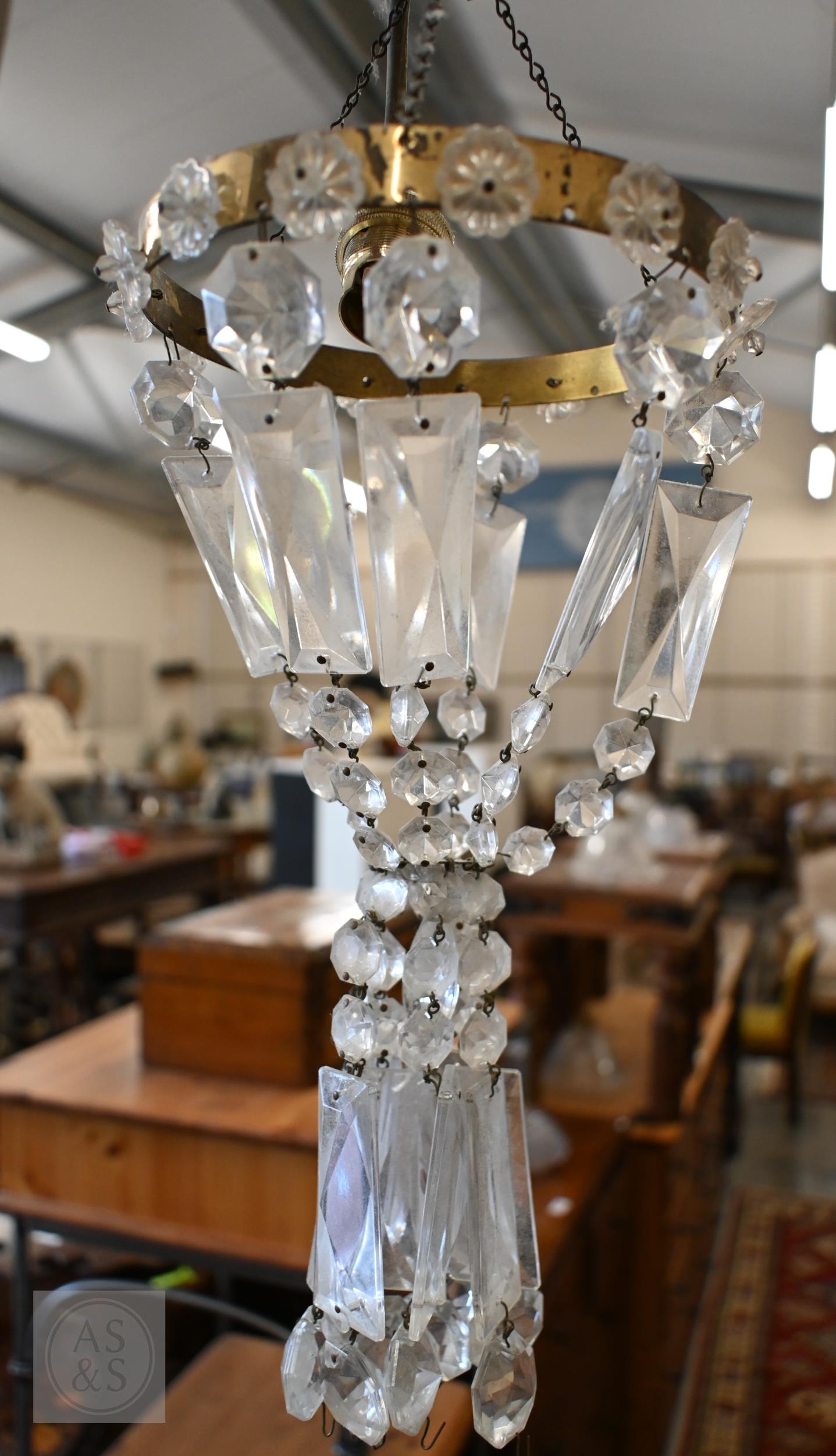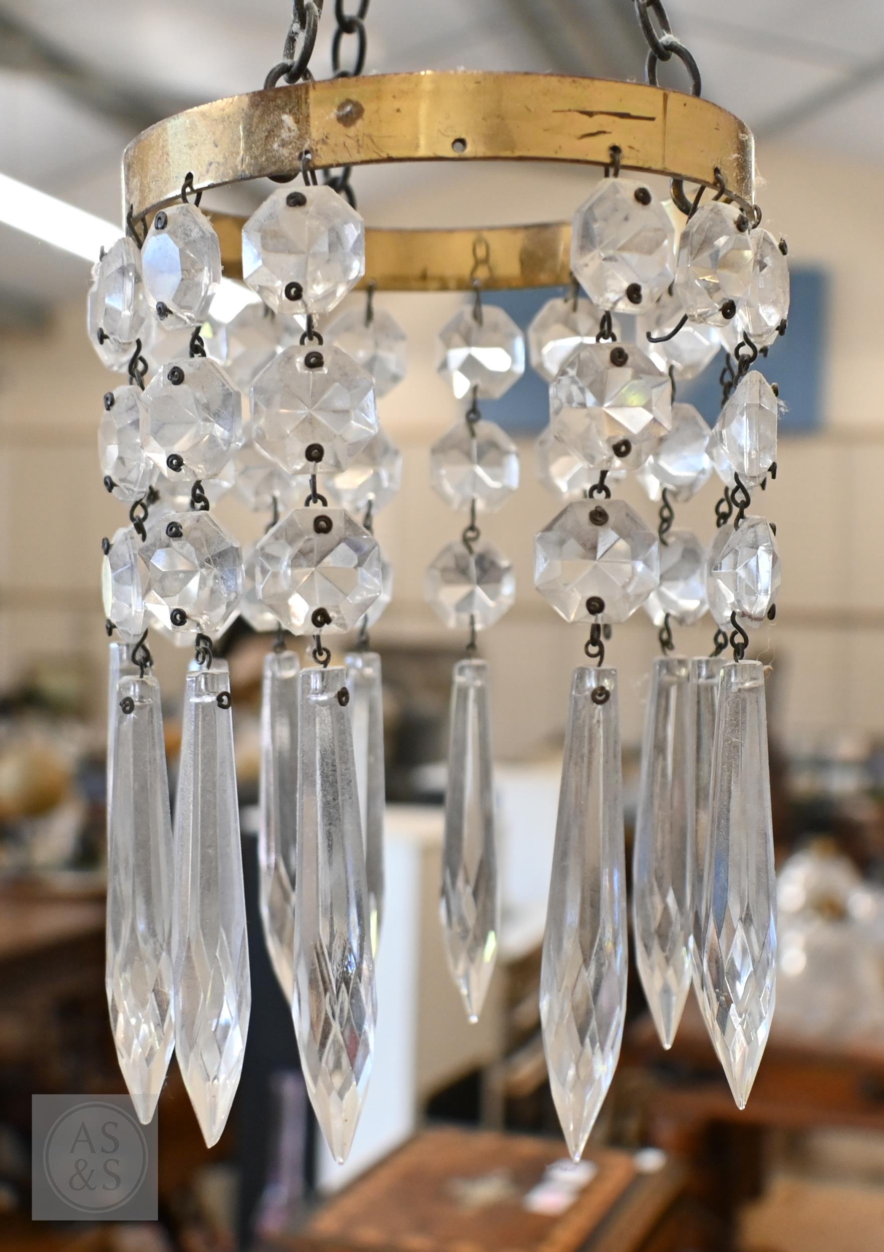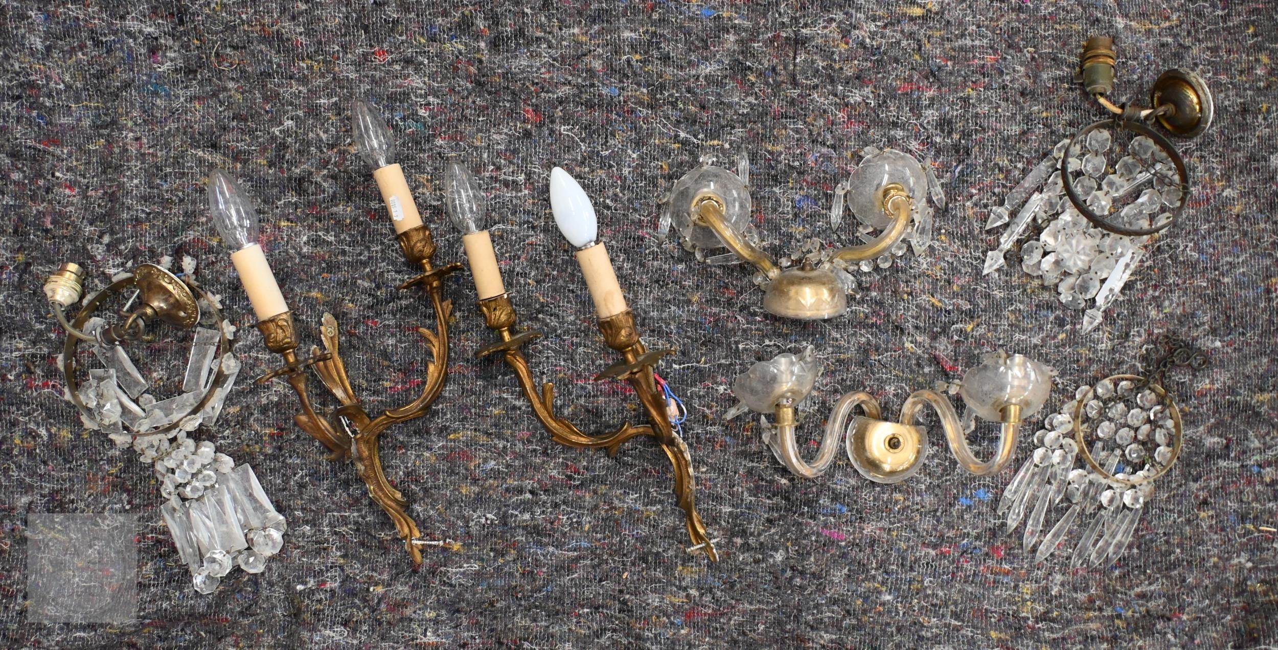 Three brass ring ceiling lightshades hung with facetted glass drops and prisms, to/w a pair of wall lights and a pair of rococo-style brass twin branch wall lights
