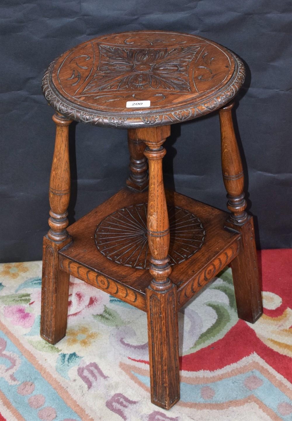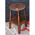 A late 19th/early 20th century oak wine/occasional table, moulded circular top carved with a stylised flowerhead, turned supports, square undertier, 60cm high