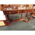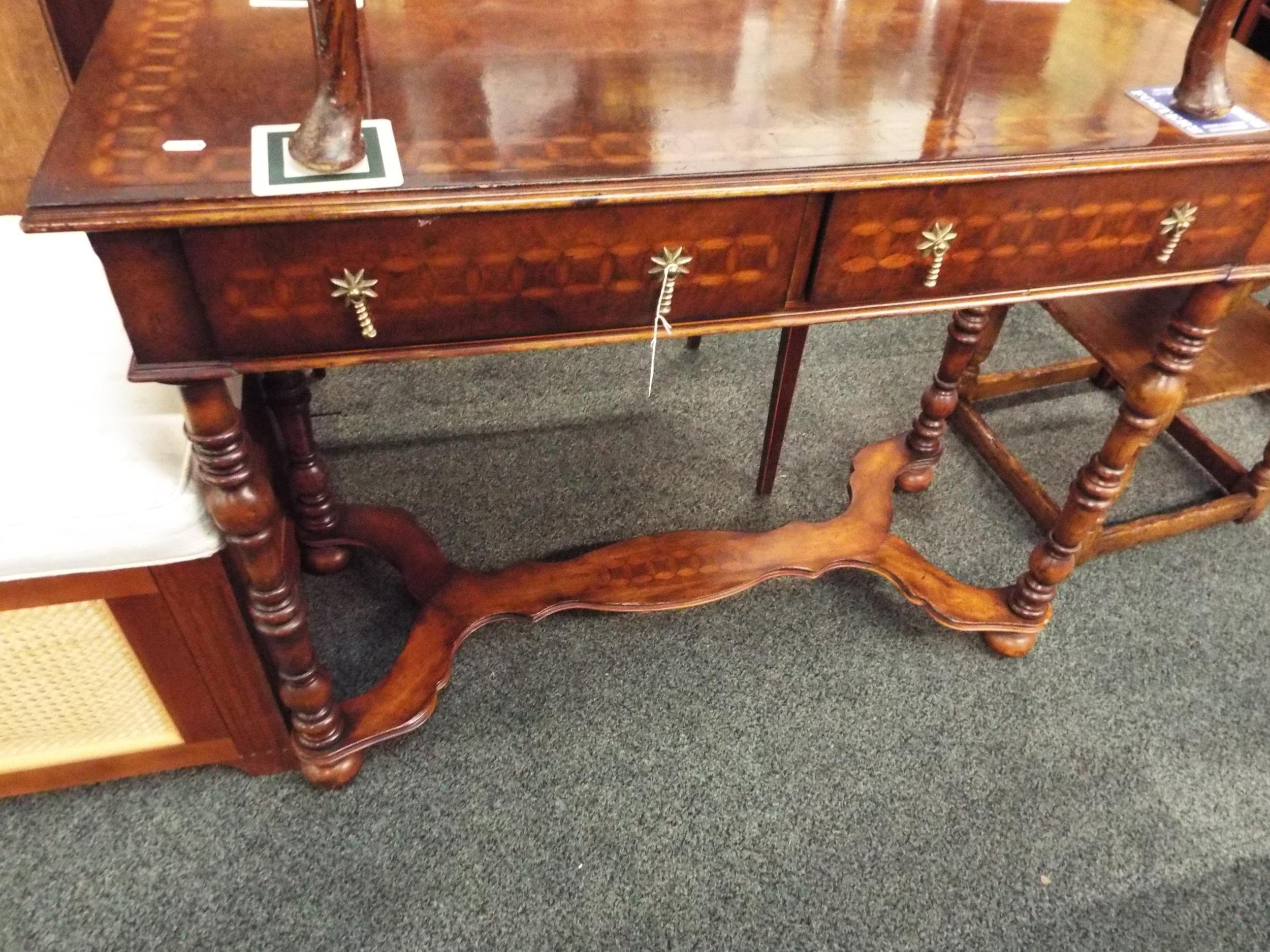 A reproduction burr walnut and inlaid console table having two frieze drawers above turned supports and stretchers
