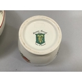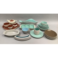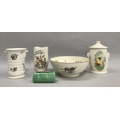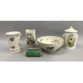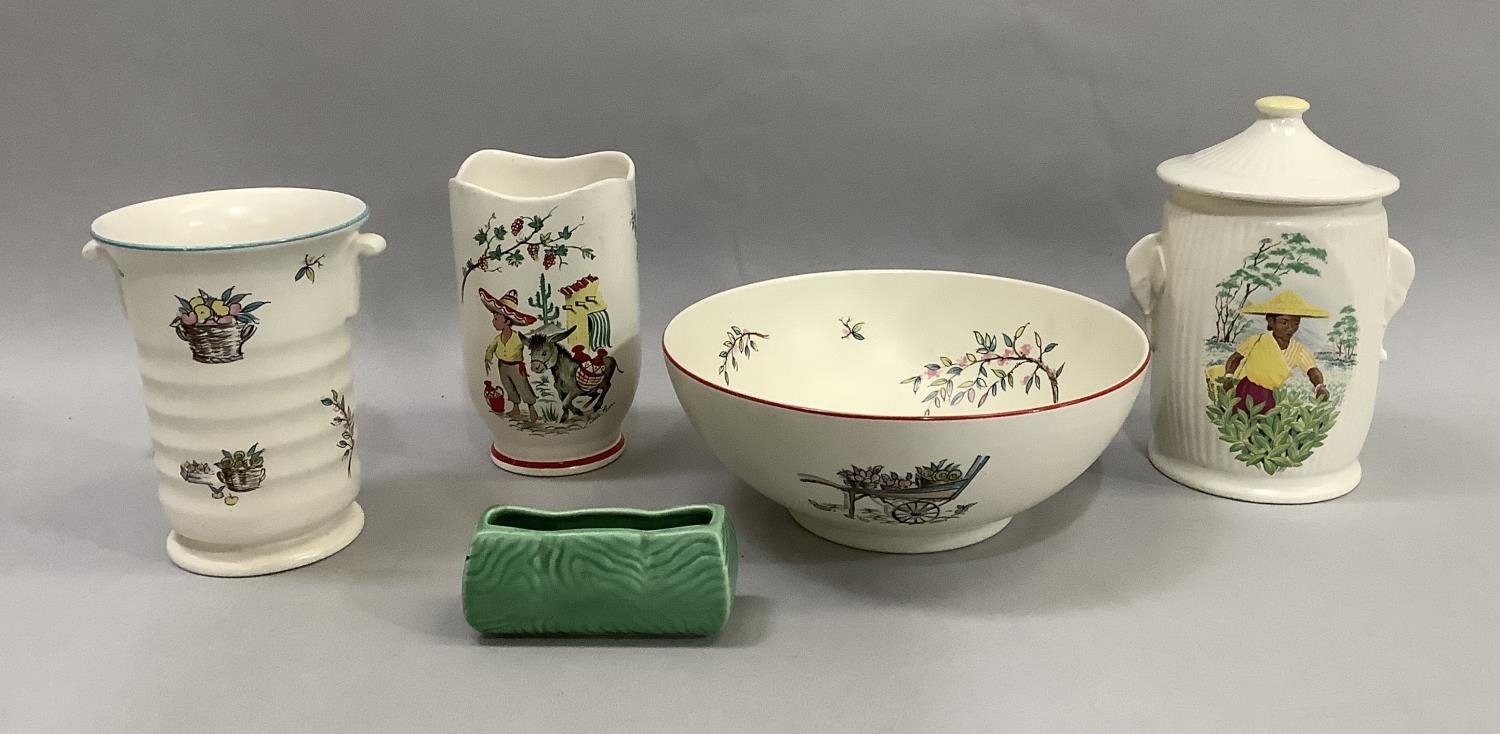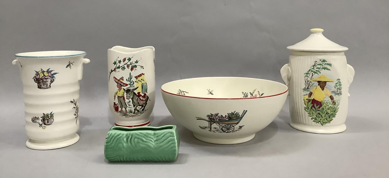 A Crown Ducal serving bowl of Petit Pierre pattern together with a two-handled ribbed vase of the same design, a Little Pedro vase, a Sylvac lidded jar with elephant mask handles and a Sylva green glazed posy trough