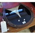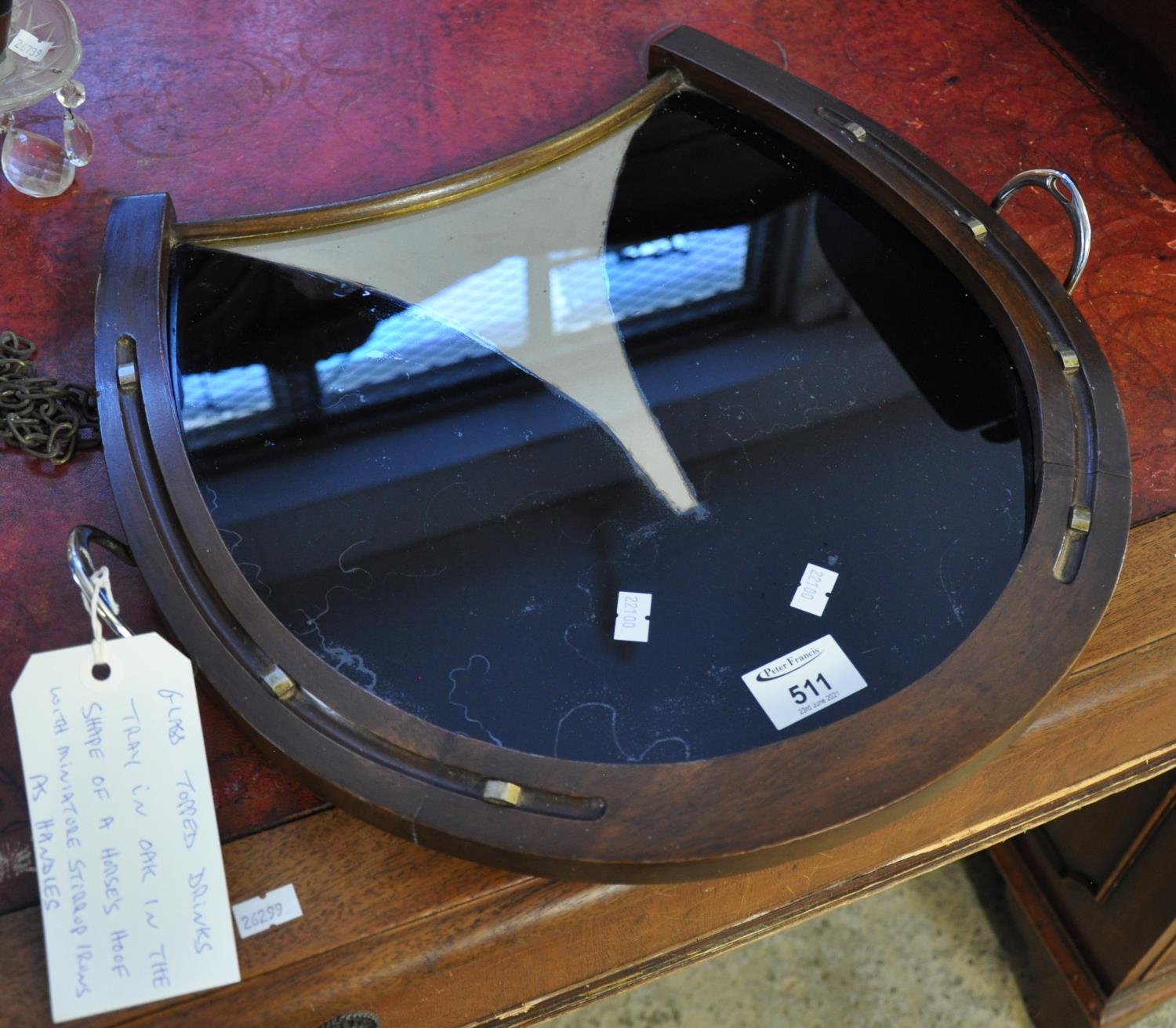 Glass top drinks tray in the form of a horses hoof with chrome stirrups as handles.