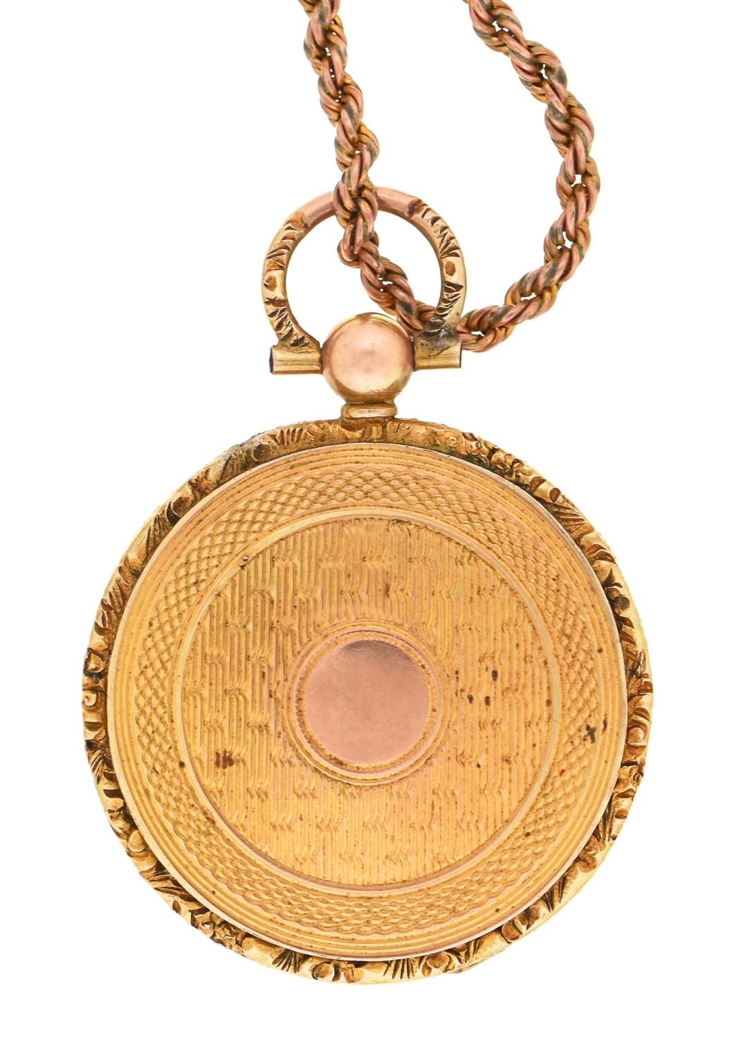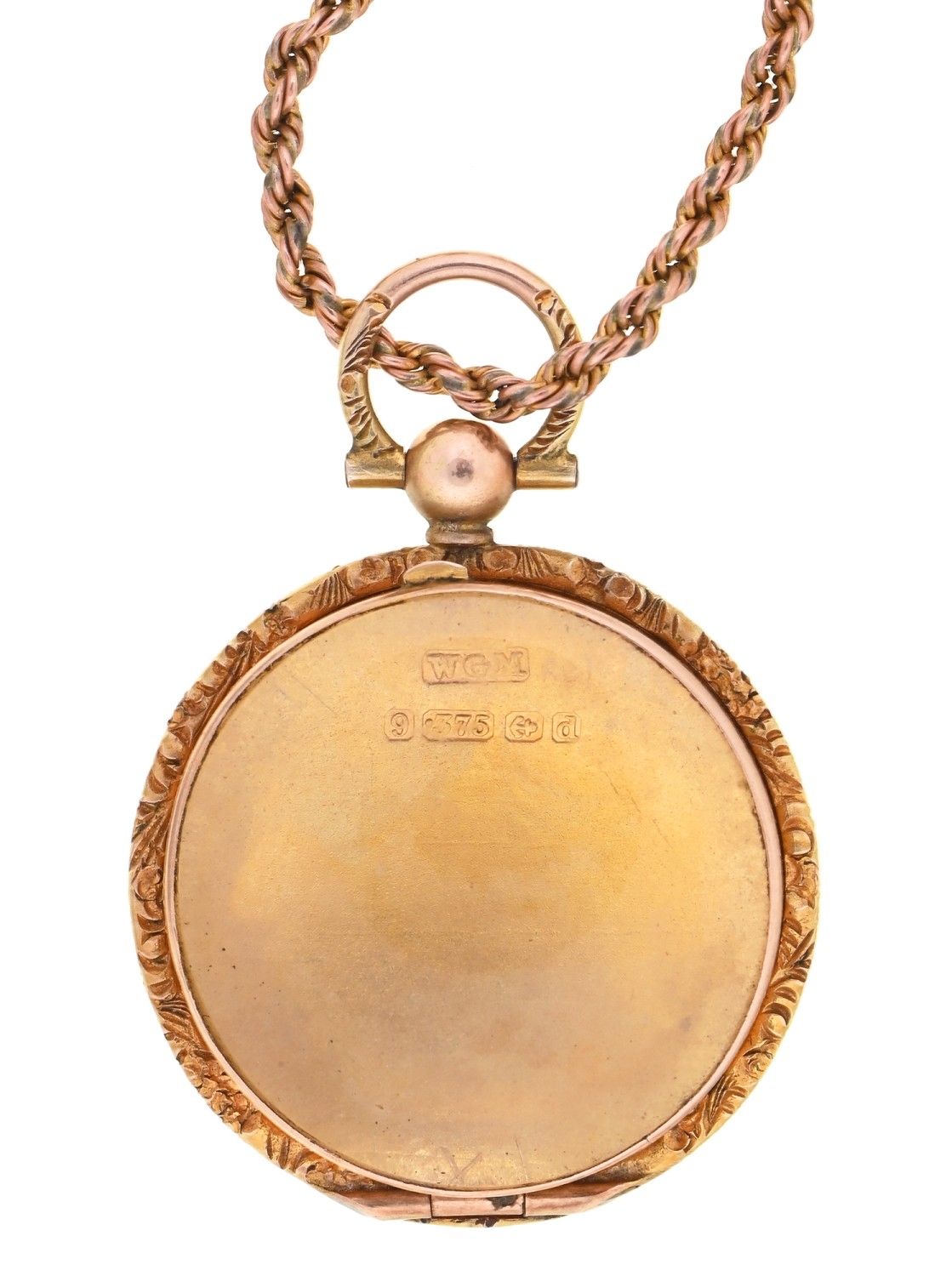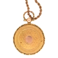 An Edwardian rock crystal and 9ct gold locket, 25mm diam, Birmingham 1903, on gold rope chain, 8.9g