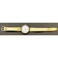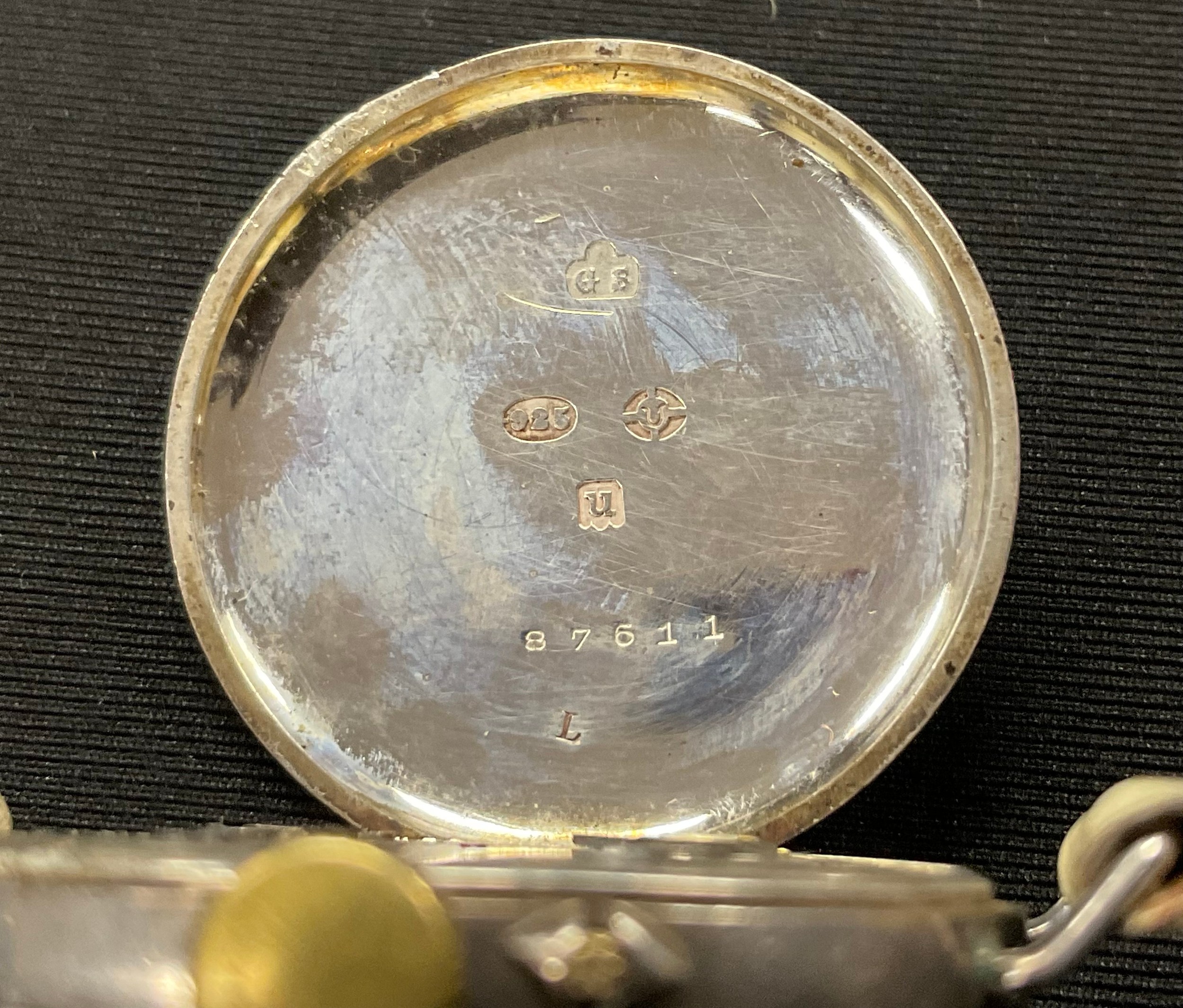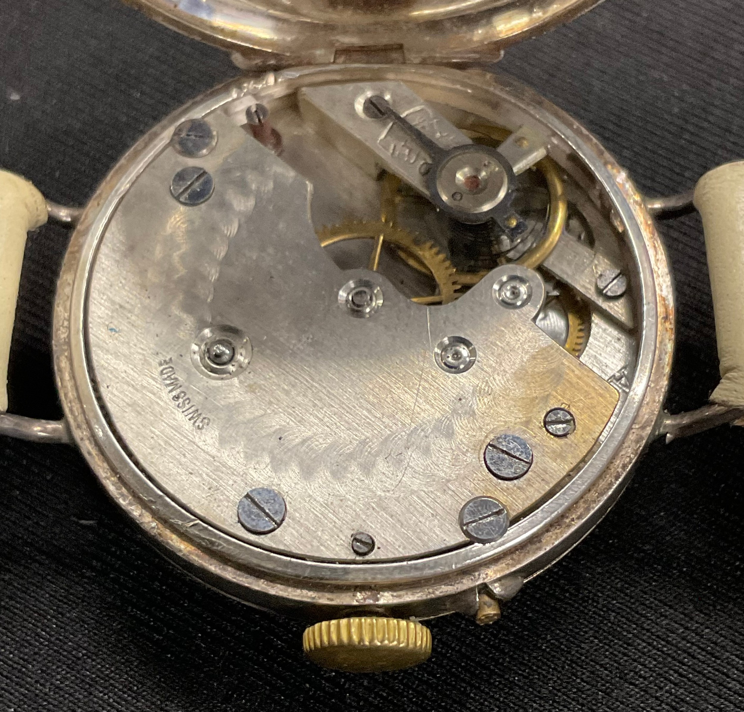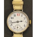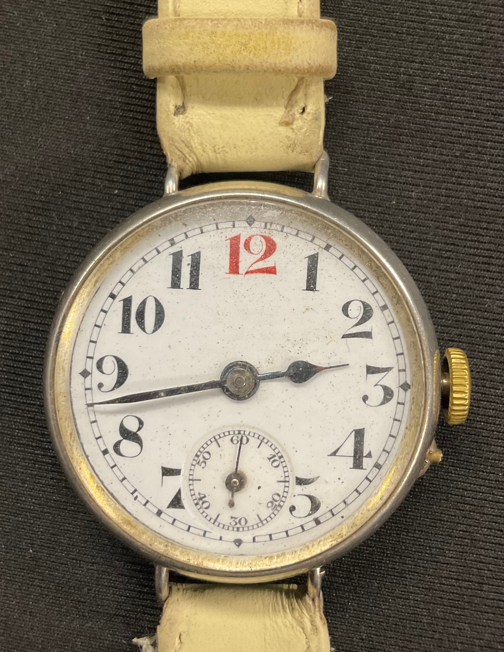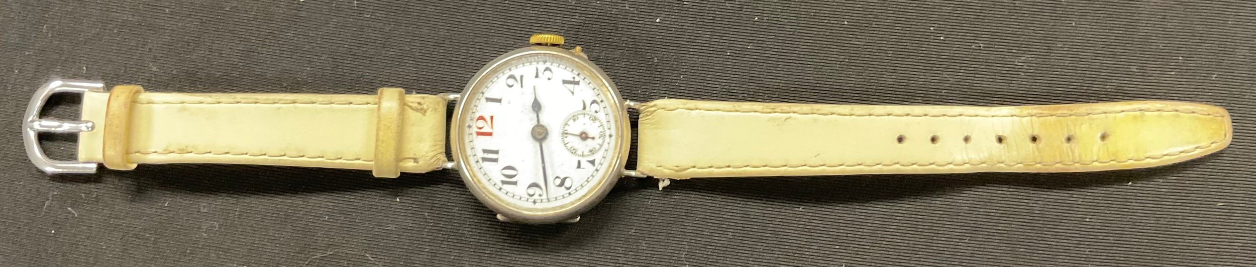 A WWI hallmarked silver trench wristlet watch, 30mm white enamel dial, Arabic numerals, London import mark, 1915