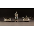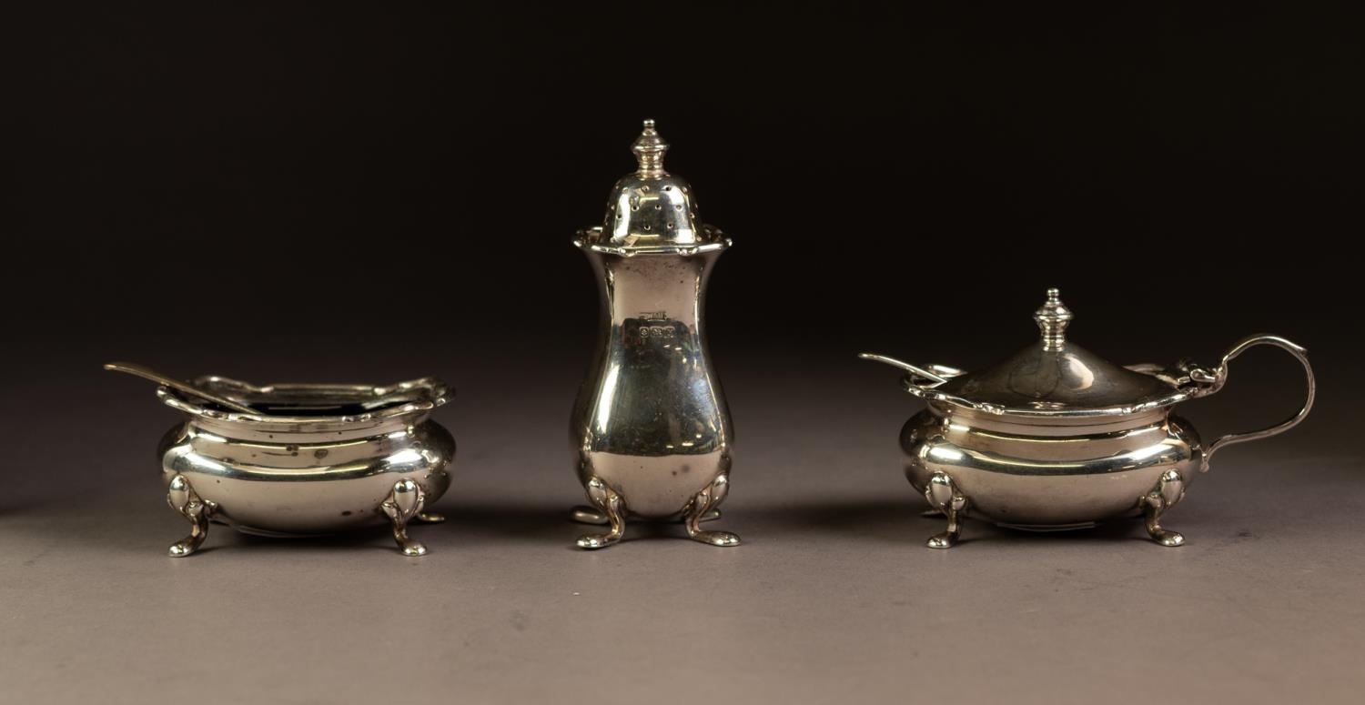 EARLY TWENTIETH CENTURY THREE PIECE CONDIMENT SET BY WALKER & HALL, of rounded oblong form with moulded border ad scroll feet the open salt and lidded mustard with blue glass liners, together with the MATCHING CONDIMENT SPOONS, Birmingham 1935/36/37, 6.5oz, (5)